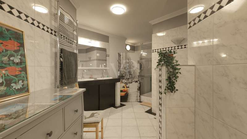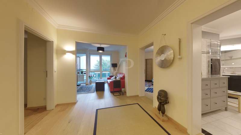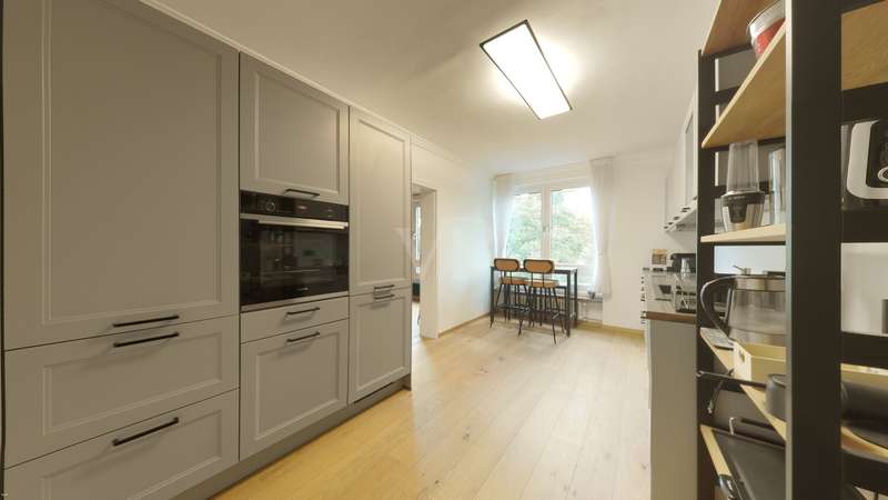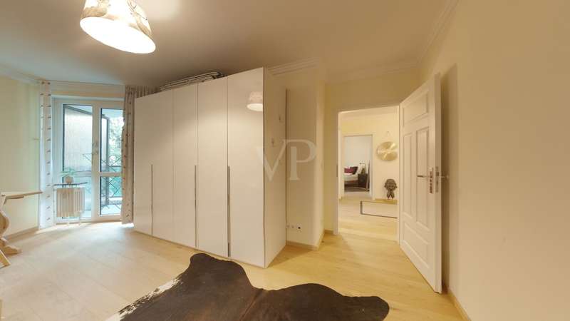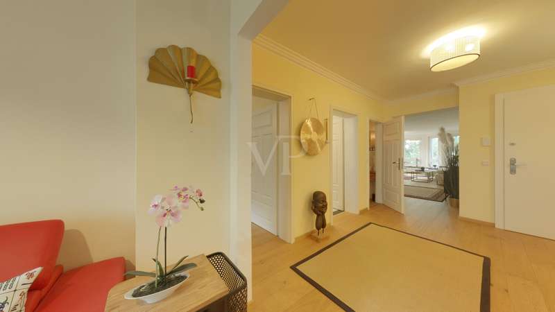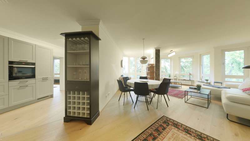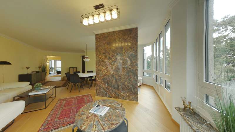 Welcome to a special opportunity: This spacious apartment with approx. 144 m² of living space presents itself as an attractive solution for discerning tenants who value space, comfort and a central location. The well thought-out room layout and high-quality furnishings create ideal conditions for contemporary living. The apartment is fully furnished and optimally equipped with electrical appliances. Cellar rooms 26 and 27 and an optional parking space in the underground garage are also available. The apartment is located in a well-kept apartment building and can be easily reached via the elevator. Upon entering, you are greeted by an inviting entrance area, which makes a pleasant first impression and offers sufficient space for a checkroom. The generously proportioned living and dining area impresses with bright window fronts that provide plenty of natural light and create a friendly ambience. The highlight and eye-catcher in the living room is a free-standing marble wall. This was designed by the famous architect Mies Ludwig van der Rohe (1886 - 1969) for the World Exhibition in Barcelona in 1929. The spacious kitchen is directly adjacent to the living room and offers enough space for a modern fitted kitchen and a dining area. This guarantees convenient preparation and dining together in convivial company. With a total of four rooms, this apartment offers enough space for individual living requirements. Two spacious bedrooms and a guest room allow for flexible use, whether as a master bedroom, children's room or home office. The clever room layout ensures that each retreat enjoys sufficient privacy. A spacious bathroom with washing machine connection, a guest WC and a further bathroom directly adjacent to the guest room with a steam bath meet all expectations for comfortable living. The highlight is a large balcony facing the courtyard, which serves as an outdoor retreat and offers space for seating and plants. The apartment is rented at an all-inclusive rent of € 3,800 including electricity, heating and water. A parking space in the underground garage is available on request for an additional €150 per month. It goes without saying that the entire property is in a very well-kept condition, so that nothing stands in the way of immediate occupancy. An excellent infrastructure rounds off the offer. Shopping facilities, schools, doctors and leisure activities are all within walking distance. Thanks to convenient public and private transport connections, both the workplace and the city center are easily accessible. This apartment combines sufficient space, a functional room layout and numerous furnishing features to create an all-round convincing overall package. We would be happy to arrange an individual viewing to present this interesting offer to you in person.