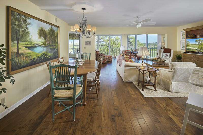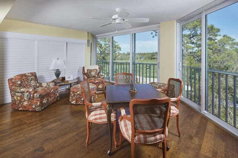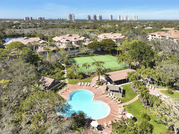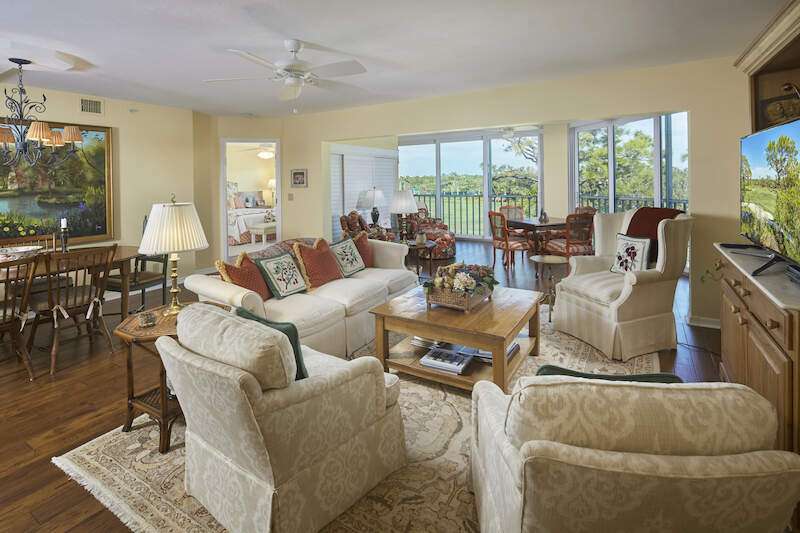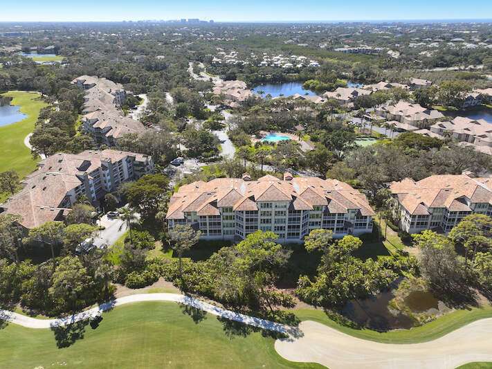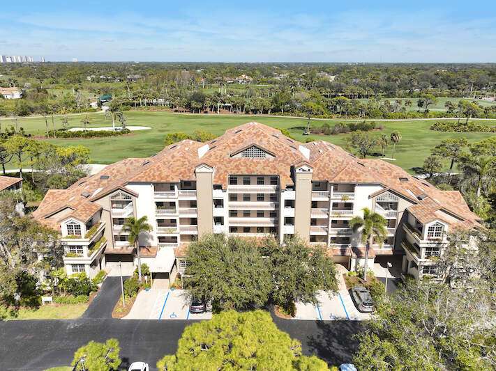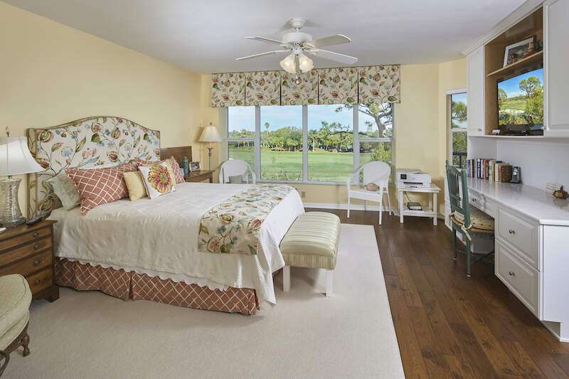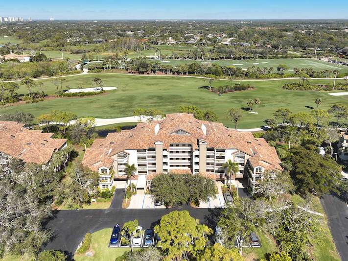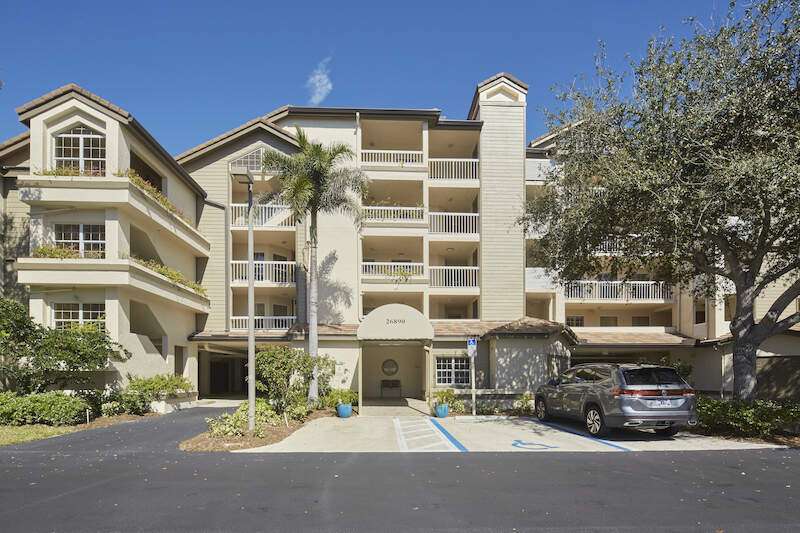 This exquisite condo is nestled in the prestigious community of Wedgewood at Bonita Bay, offering a luxurious and tranquil lifestyle. Step inside and be greeted by the warmth of engineered wood floors that flow seamlessly throughout the living spaces. The screen door entry foyer provides an added layer of privacy and through breezes. Plantation shutters adorn the windows, allowing for perfect control of natural light. The primary bedroom is a true retreat, featuring a convenient built-in desk for a home office nook, large picturesque windows that frame stunning views, and thoughtfully designed closet built-ins for ample storage. The en-suite primary bathroom boasts dual sinks with a vanity, custom cabinetry for extra storage and shower. The guest bathroom is located conveniently to guest bedrooms for easy access. This condo has been cleverly designed to offer a true 3-bedroom layout, maximizing space and versatility. In 2017, the home underwent a remarkable remodel, updating the kitchen and bathrooms with elegant granite countertops and modern stainless steel appliances. The air conditioning system was also replaced in 2017. The laundry room has been reimagined with a practical laundry sink, generous cabinetry, and a full-size washer and dryer. Enjoy breathtaking views from the impact resistant glassed-in lanai, allowing for an abundance of natural light to fill the space. The condo includes a 2-car garage located under the building, providing secure parking and a storage closet located right out your front door. With its warm and inviting ambiance and a desirable location, its offered unfurnished, allowing you to personalize the space to your taste. Overlooking double fairways and serene lakes, this condo offers an unparalleled living experience! Amenities within Wedgewood are large community pool, spa, grills, and tennis courts to enjoy.