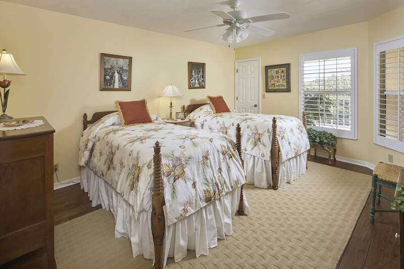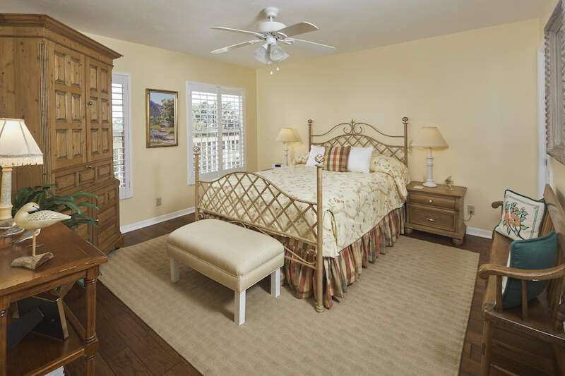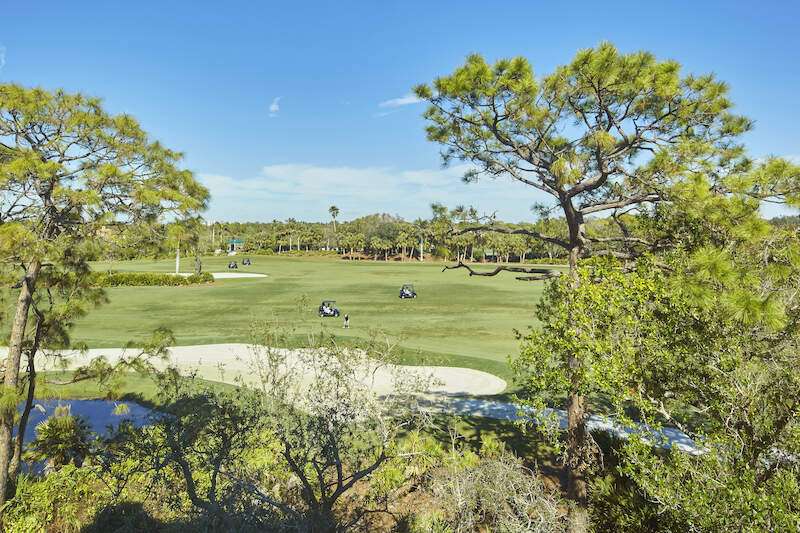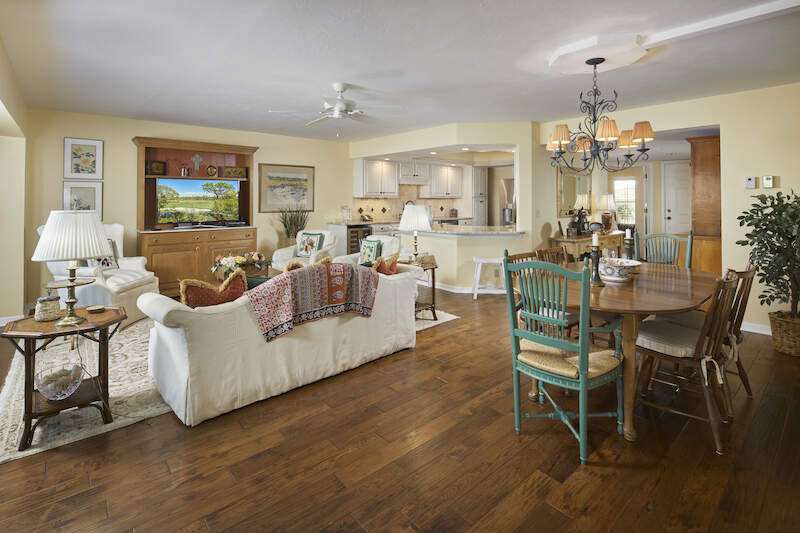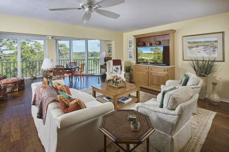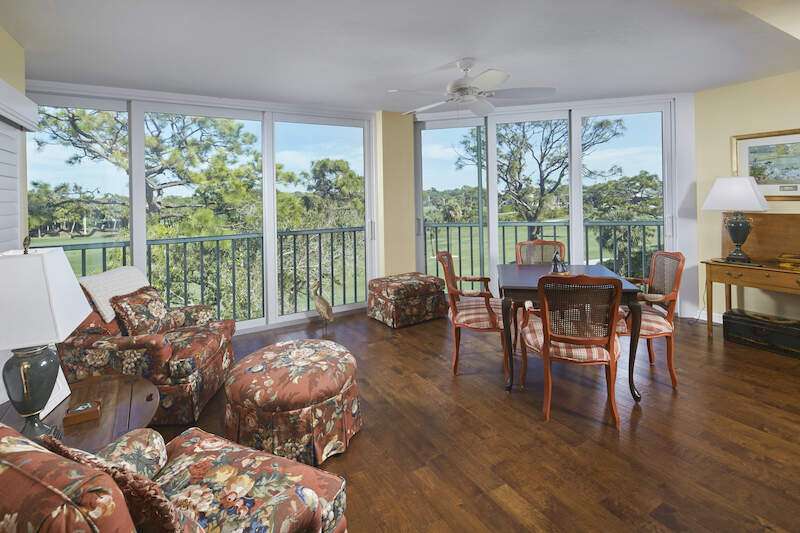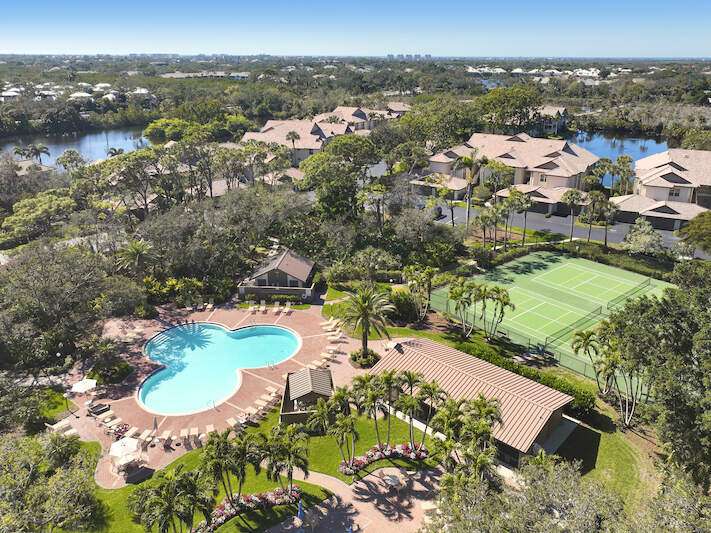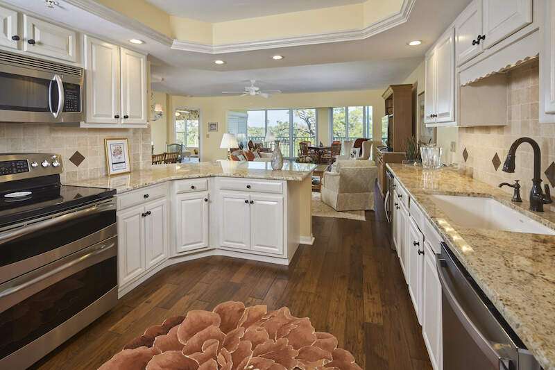 This exquisite condo is nestled in the prestigious community of Wedgewood at Bonita Bay, offering a luxurious and tranquil lifestyle. Step inside and be greeted by the warmth of engineered wood floors that flow seamlessly throughout the living spaces. The screen door entry foyer provides an added layer of privacy and through breezes. Plantation shutters adorn the windows, allowing for perfect control of natural light. The primary bedroom is a true retreat, featuring a convenient built-in desk for a home office nook, large picturesque windows that frame stunning views, and thoughtfully designed closet built-ins for ample storage. The en-suite primary bathroom boasts dual sinks with a vanity, custom cabinetry for extra storage and shower. The guest bathroom is located conveniently to guest bedrooms for easy access. This condo has been cleverly designed to offer a true 3-bedroom layout, maximizing space and versatility. In 2017, the home underwent a remarkable remodel, updating the kitchen and bathrooms with elegant granite countertops and modern stainless steel appliances. The air conditioning system was also replaced in 2017. The laundry room has been reimagined with a practical laundry sink, generous cabinetry, and a full-size washer and dryer. Enjoy breathtaking views from the impact resistant glassed-in lanai, allowing for an abundance of natural light to fill the space. The condo includes a 2-car garage located under the building, providing secure parking and a storage closet located right out your front door. With its warm and inviting ambiance and a desirable location, its offered unfurnished, allowing you to personalize the space to your taste. Overlooking double fairways and serene lakes, this condo offers an unparalleled living experience! Amenities within Wedgewood are large community pool, spa, grills, and tennis courts to enjoy.