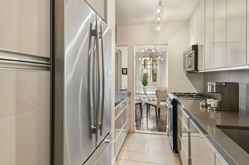 Enter into a grand 30-foot living and dining area, highlighted by a bright Dining L with two windows-easily convertible into a third bedroom or home office. The renovated chef's kitchen features top-tier appliances including a JennAire cooktop oven and microwave, Miele dishwasher, and JennAire refrigerator, with a large open counter for seamless entertaining.