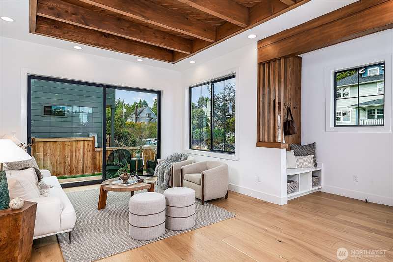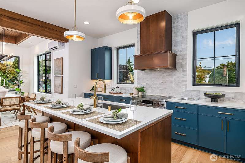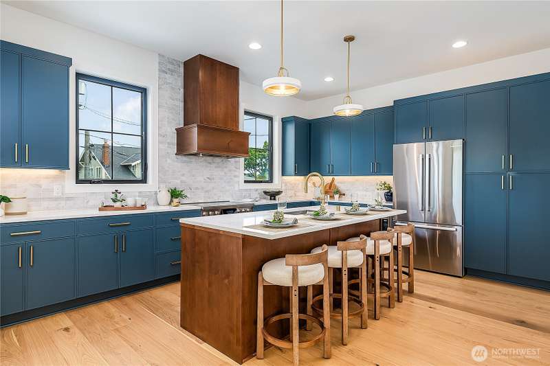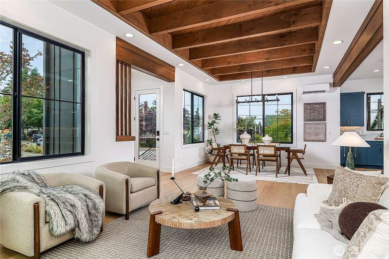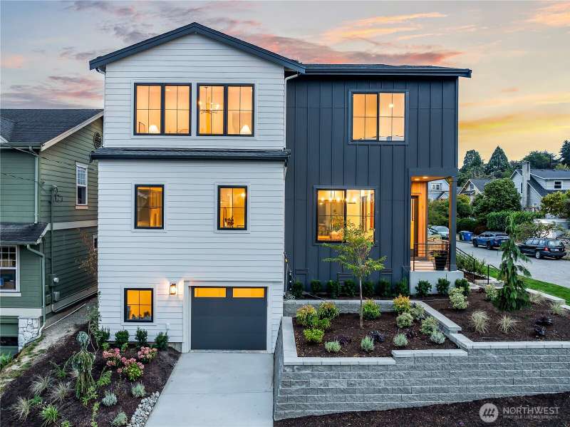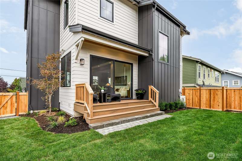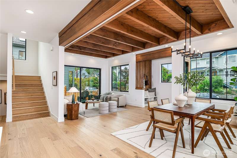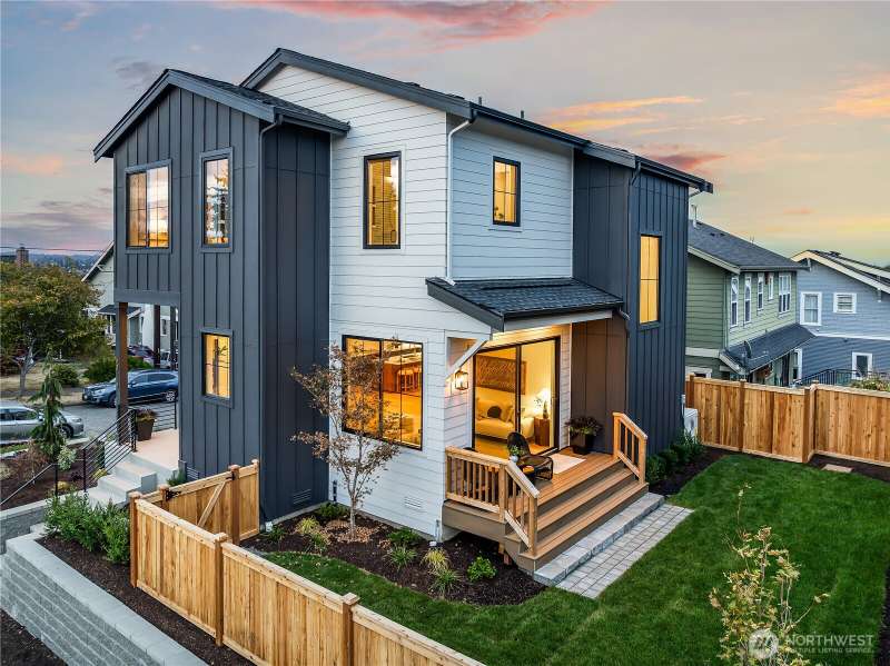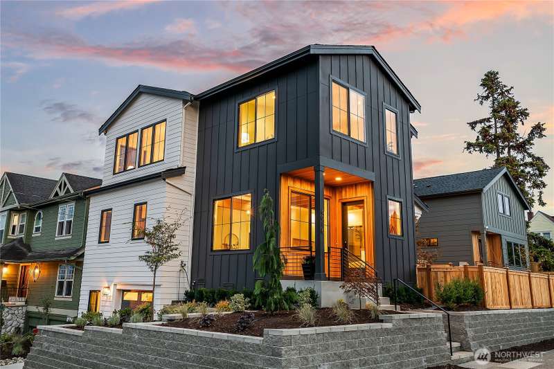 Stunning 5bd/4ba home in Green Lake/Phinney Ridge! This 2,300+ SF home sits on a quiet corner lot w/ standout curb appeal. Main floor features dining/living room, office/bed, full bath, & a stunning kitchen w/ Bosch appliances, quartz island, marble backsplash & wood range hood. Sliding doors open to a deck & fenced yard- perfect for indoor-outdoor living! Upstairs, a large family room (or bedroom) has lake views, & a primary suite offers spa bath, WIC & more views! Daylight lower level has a bed, bath, laundry, & garage. Other features include wide-plank hardwoods, 10’ open-joist ceilings, custom finishes, cat 6 network wiring, & efficient HVAC. Just steps to Woodland Park Zoo & minutes to Green Lake, Fremont, Ballard, & top schools.