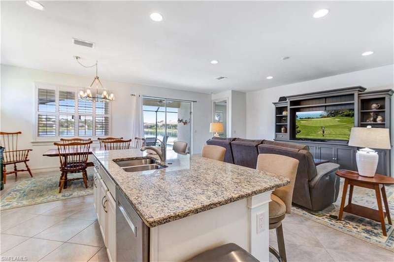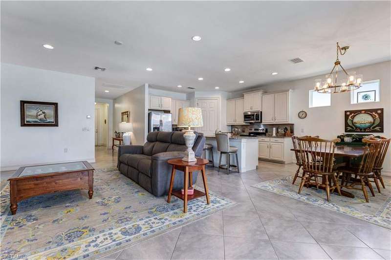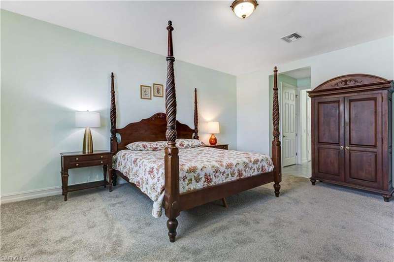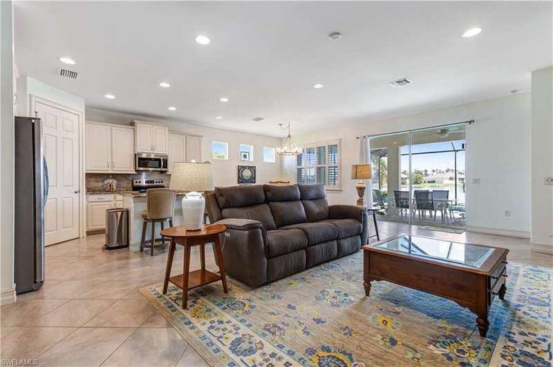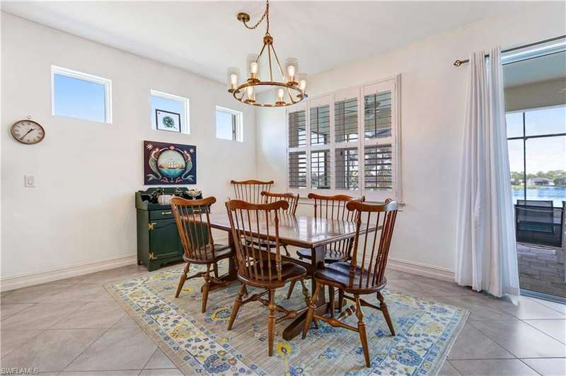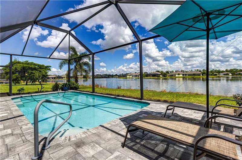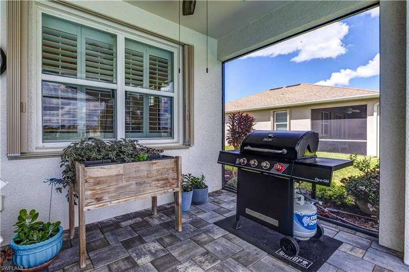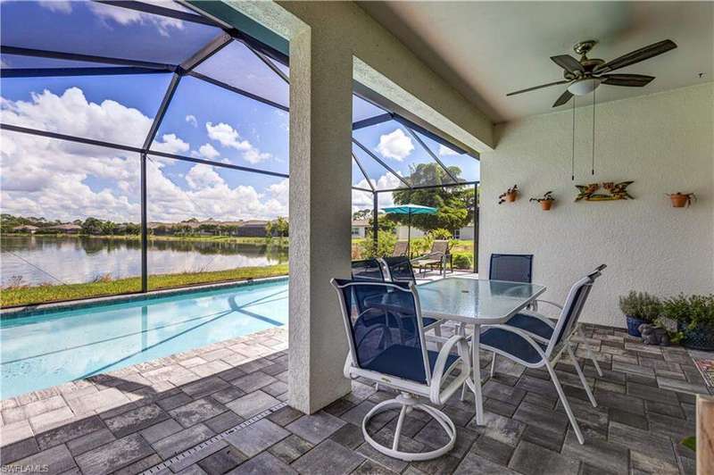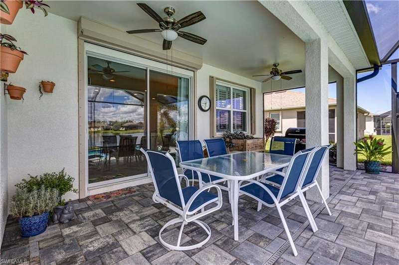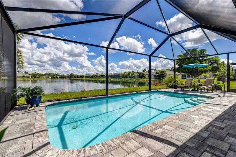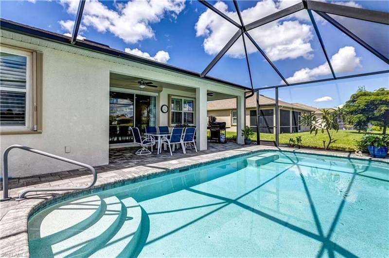 Welcome to your dream home in the highly desirable gated community of Entrada! This 4-bedroom, 2-bath residence is situated on a premium lot with stunning lake views. The home blends comfort and style in a prime location. Inside, you'll find newly carpeted bedrooms and easy-care flooring throughout the main living areas. The open-concept design creates a bright, inviting space perfect for everyday living and entertaining. Step outside to your private lanai with a heated pool and extended paver patio overlooking the tranquil lake-ideal for relaxing, dining, or hosting friends. For peace of mind, the home is equipped with accordion hurricane shutters plus an electric shutter on the lanai. Entrada offers resort-style amenities including a clubhouse, fitness center, resort pool, tennis and pickleball courts, and more-all with low HOA fees. Best of all, no flood insurance is required. This move-in-ready lakefront home is an incredible opportunity in one of Cape Coral's premier communities!