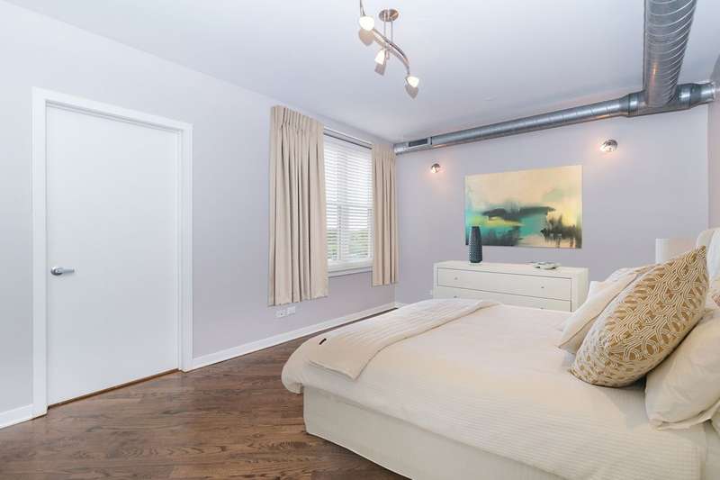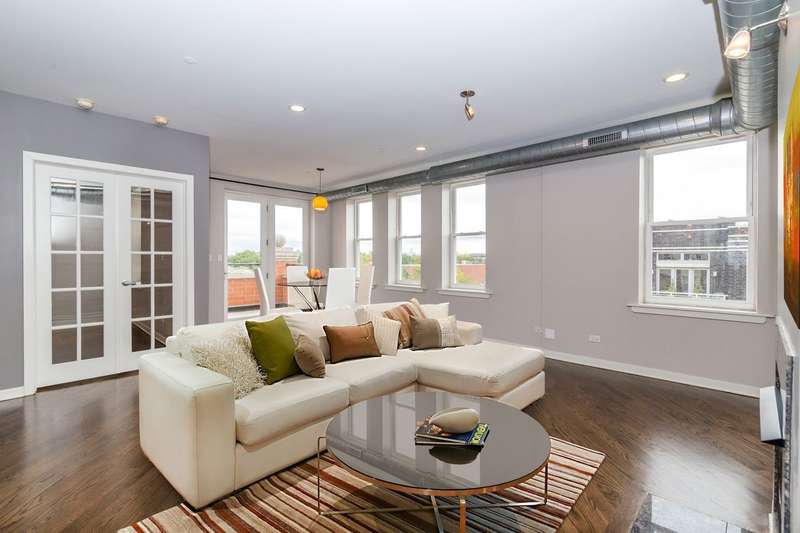 This top floor 2-bed/2-bath corner condo is available for rent! The incredible views of the loop skyline highlight this beautiful modern condo in the heart of Albany Park. The large east and south facing windows flood the huge living/dining space with natural light! Enjoy cozy evenings by the fireplace. The modern kitchen features a breakfast bar and 42 cabinets, stainless steel appliances, and granite countertops. Come see the huge primary en-suite bedroom that boasts a bathroom with double vanity and oversized spa shower. Hardwood floors throughout, in-unit washer/dryer, large outdoor patio, heated garage parking included! Well maintained and professionally managed building, less then a mile to the Kimball Brown Line, quick access to the Kennedy Expressway. Walk to bars, restaurants, and entertainment!