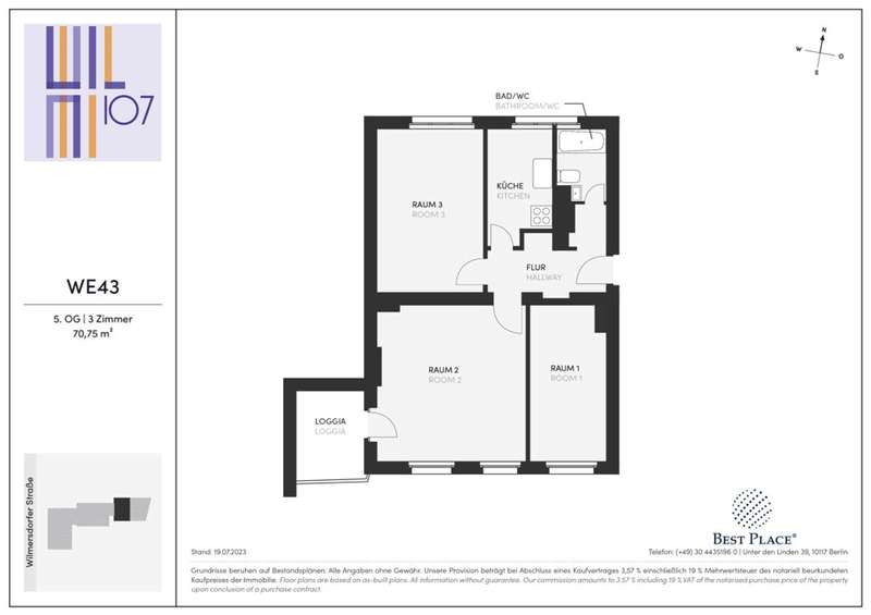 The modern building ensemble Wilmi 107 is located in the sought-after City West between Ku'damm and Kantstrasse. The 2- to 3-room apartments and commercial units are solidly rented and most have balconies or loggias and bathrooms with access to natural ventilation and light. Efficient floor plans, practical apartment sizes and elevator access make them lucrative investments. The offered apartment WE43 is located on the 5th floor. With three rooms and approx. 70,75 m², it has a particularly sought-after apartment size. A loggia guarantees relaxing hours in the fresh air and a bathroom with natural light and bathtub provides comfort in everyday life. The apartment is ideal for singles and couples of all ages and will also rent very well in the future.