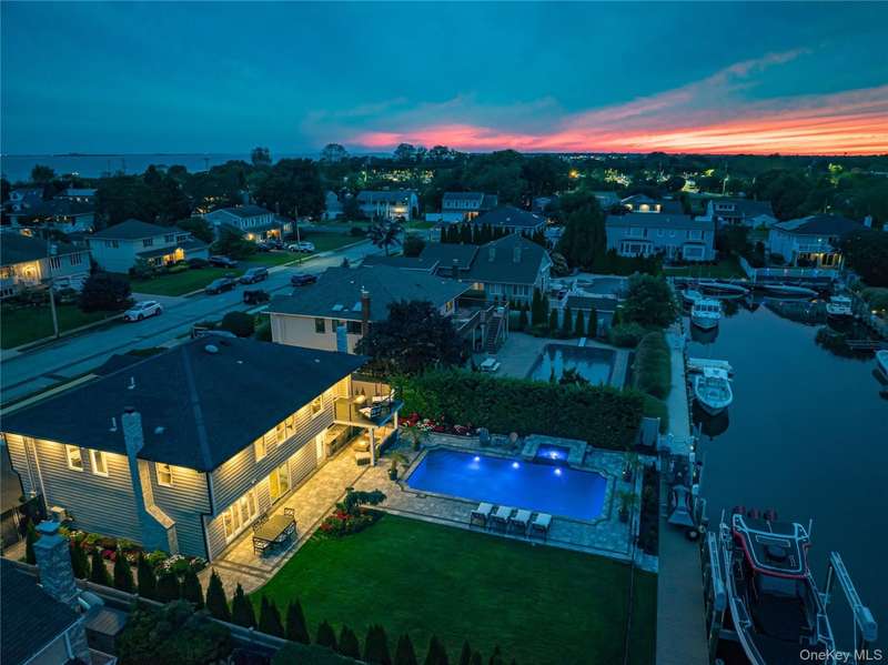 Located on a quiet, private cul-de-sac, this pristine wide-line Hi Ranch offers the perfect blend of luxury, privacy, and waterfront living. The entry foyer leads to a spacious living room with an electric fireplace, formal dining room with access to a second-story balcony overlooking the yard, saltwater gunite pool, hot tub, and 75' of waterfront. The custom center-island kitchen includes a large pantry, with stainless steel and Energy Star appliances. The primary suite features a luxurious private bath and an adjacent lavish, custom-designed walk-in wardrobe. Two additional bedrooms and a full bath complete the upper level, which boasts dark walnut-stained hardwood floors. Radiant heat floors are found in all bathrooms and the laundry room. The lower level includes a large bedroom, den with a wood-burning fireplace and ceramic flooring, full bath, cedar closet, oversized laundry room with dual washers/dryers and a custom built in dog washing station to keep your four-legged friends clean and pampered without leaving home, and access to a heated 2-car garage. Upgrades include all new Andersen windows (except three rear), 2023 updates throughout, central air with an additional ductless unit in the primary suite, and a whole-home H2O system. The 75’ bulkhead (replaced in 2015) includes a 22,000-lb boat lift, one jet ski lift, and a dedicated 100-amp dock panel. Flood insurance and elevation certificate available upon request. This home is truly in immaculate, nearly "unlived-in" condition—an exceptional waterfront opportunity.