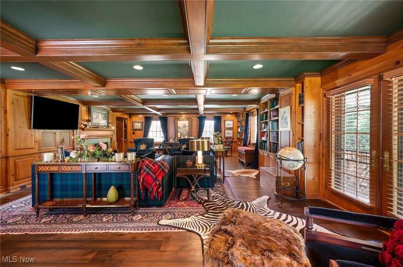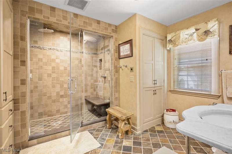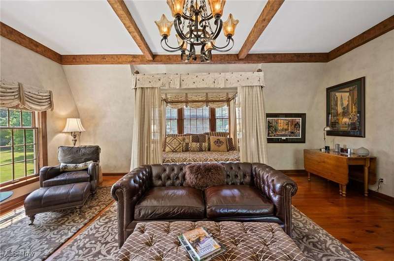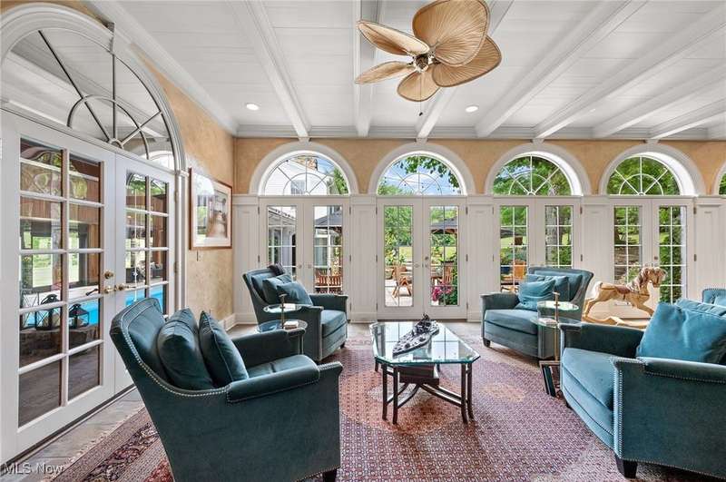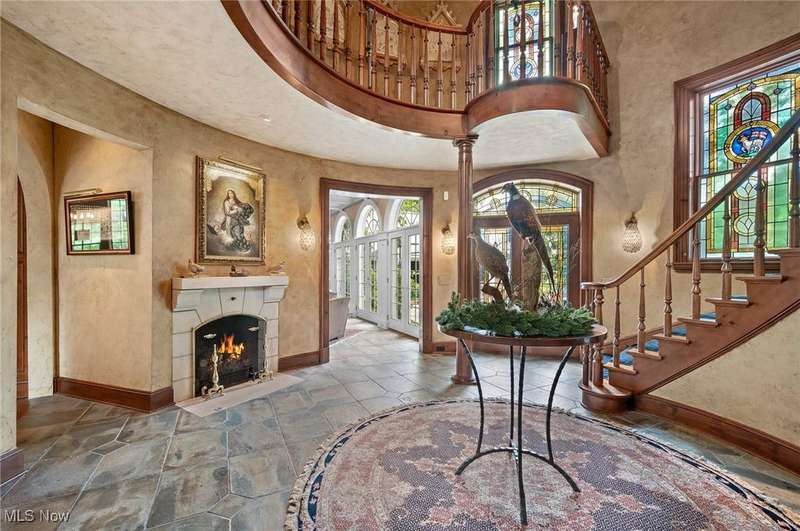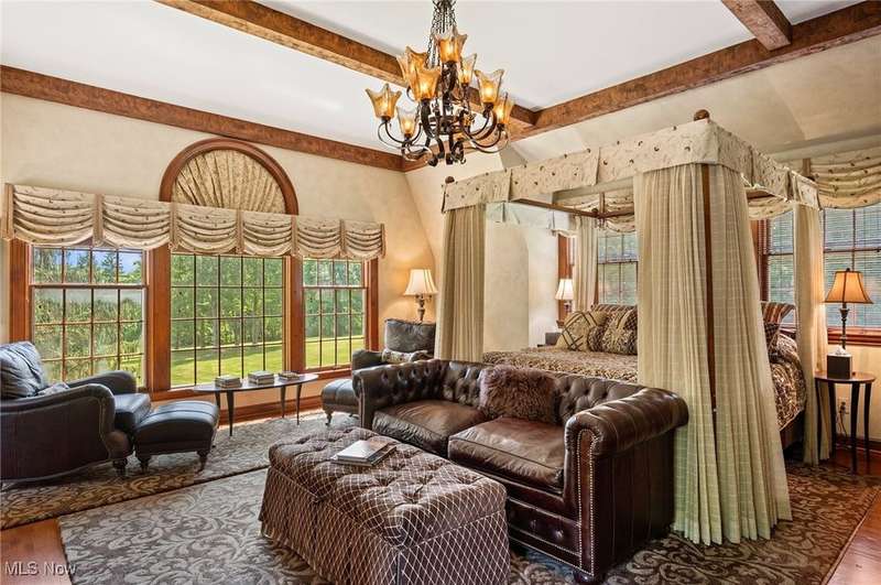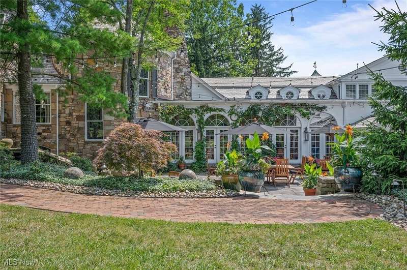 Set on 24 scenic acres of sweeping lawns & woodlands with 3 stocked fishponds, this magnificent English country estate, reimagined by renowned Cleveland architect Anthony Paskevich, offers an unparalleled living experience. A long, illuminated drive winds past original farmhouse & barn complex, leading through a tree-lined allee flanked by stunning gardens to the impressive main residence. A turreted entrance welcomes guests. The stone & clapboard exterior gives way to magnificent millwork, vaulted ceilings, arched doorways, oversized windows, and carefully selected stone & wood flooring. Designed for everyday living and grand entertaining, the generously sized gathering areas incl. a great room, formal dining room, family room, and solarium, all with fireplaces. A tranquil haven, the primary bedroom suite has dual baths and 4 additional suites incl. private baths. Enclosed by walls of glass, a spectacular pool pavilion opens to a stone patio overlooking breathtaking scenery and the exercise room, incl. sauna and steam room, epitomizes luxury & relaxation with a view. Approached by a brick courtyard, the custom-built, 1-bedroom guesthouse has an expansive brick terrace with geothermal heat, a fireplace and outdoor kitchen & pizza oven. With the richness & warmth of stone, brick, and wood, the bar room on the walk-out lower level exudes the charm of a traditional Scottish pub. The 2-car garage has an additional 1-bedroom, 1-bath guest suite on its upper level. Original farmhouse and one-room schoolhouse, moved to the property in the 1930s, are fully updated with modern amenities. The farmhouse has 3 bedrooms, 1.5 baths, wraparound porch, A/C and whole-house generator. The estate also has a fully restored, authentic barn complex - 4 frame buildings connected by a covered walkway: barn with 4 stalls & hayloft, greenhouse/studio, and detached 2-car and 4-car garages. Open fenced pastures with loafing sheds have ample space for horses, alpacas, or sheep to graze freely.