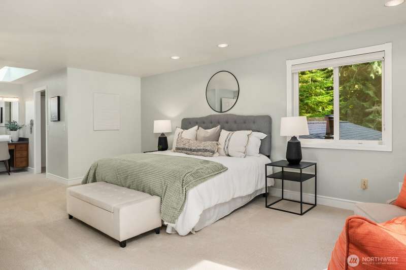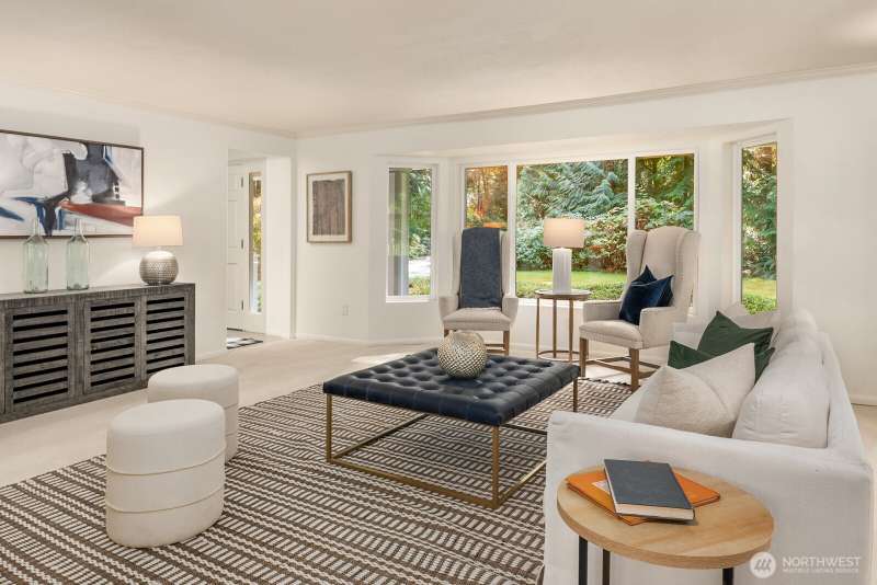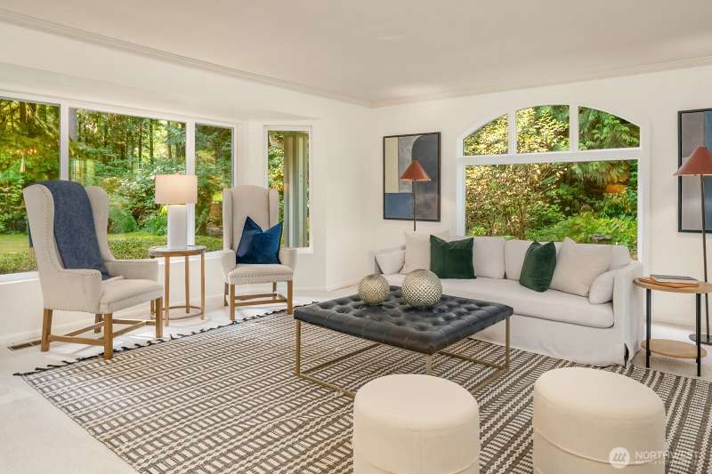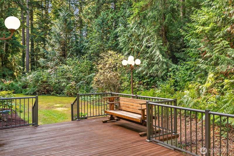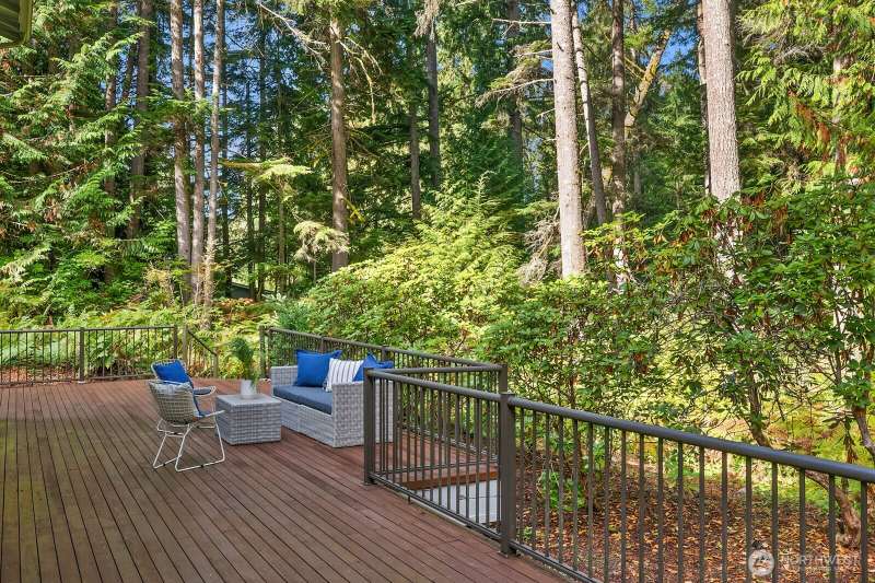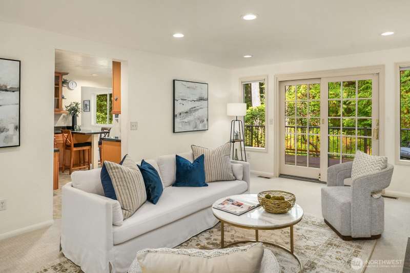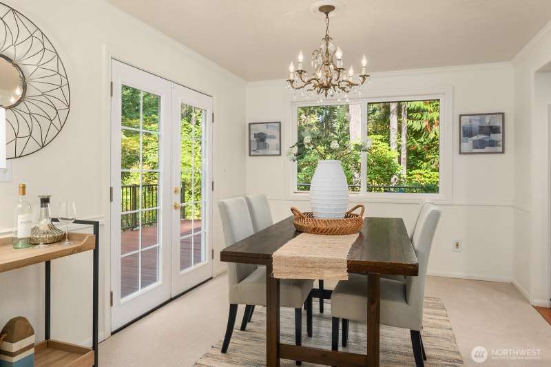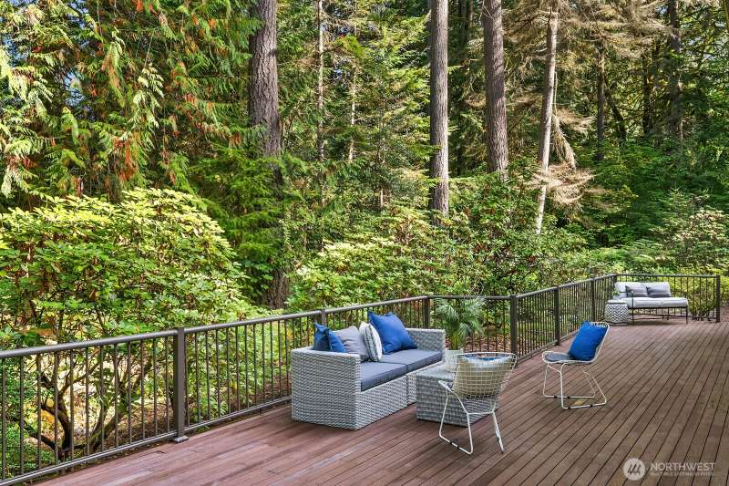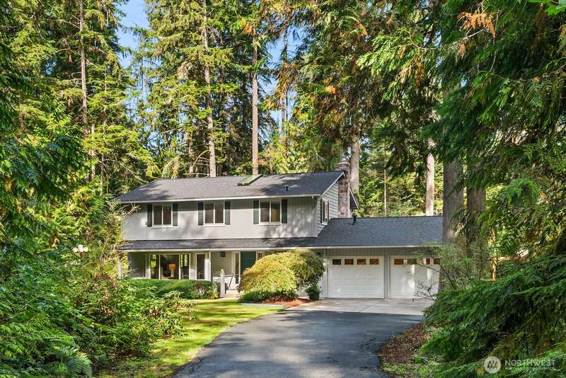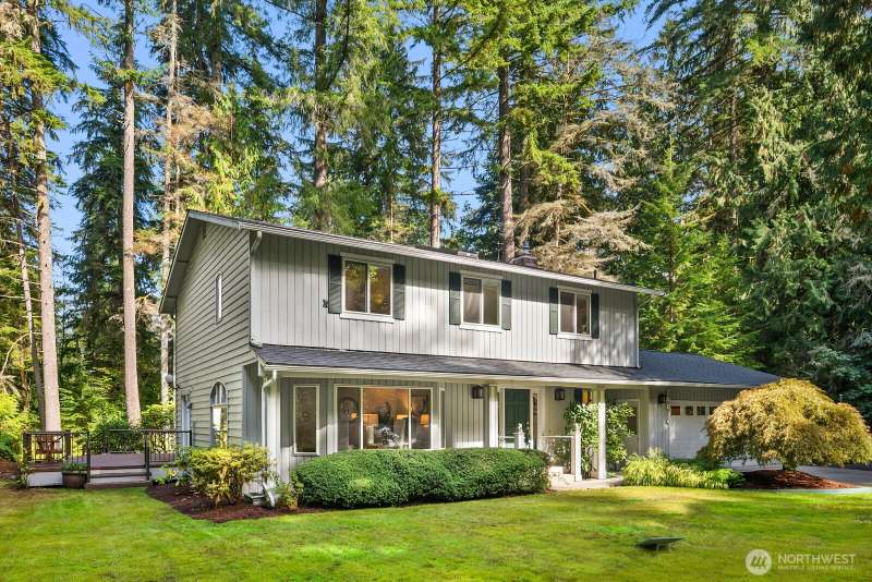 Stunning secluded tree-lined street leads you to a small community of homes where you will find this beautiful 4BR residence on 1.58 acres in Woodinville. Move-in-ready with brand NEW ROOF & skylights, also brand-new carpet & interior paint + refinished large deck! Inside you’ll find a circular floorplan with gorgeous bay windows in the spacious living room, French doors to deck from Dining & Family rooms. Beautiful kitchen offers plenty of storage & counter-space, views to the trees in back, + walk-in-pantry. Cozy gas stove. Extra-large Primary Suite with walk-in-closet, attached Bath + door to 4th bedroom—perfect for nursery or office. Private, lush green views out every single window. Garden areas, & lots of parking. Northshore Schools.