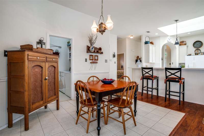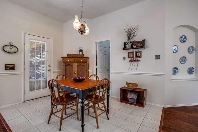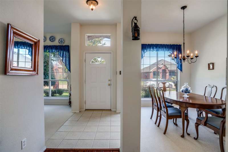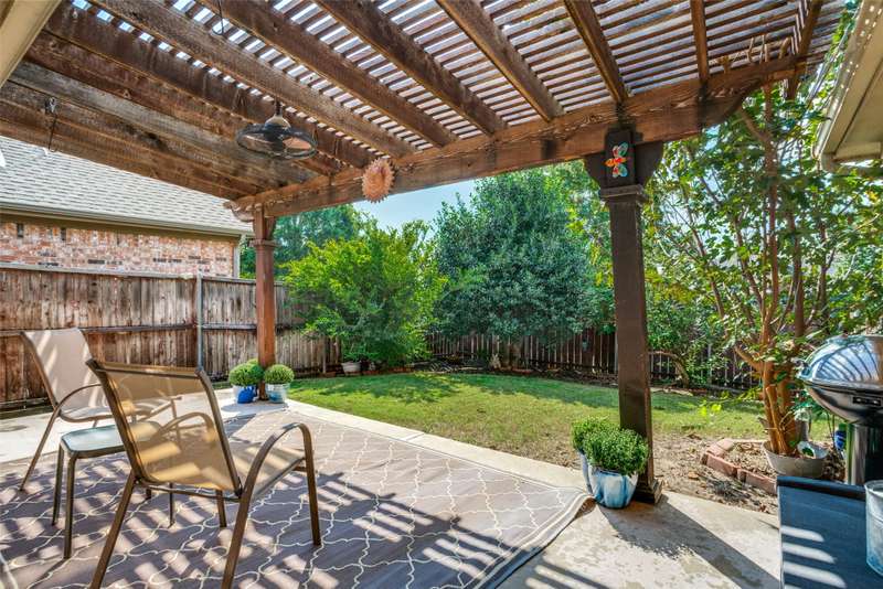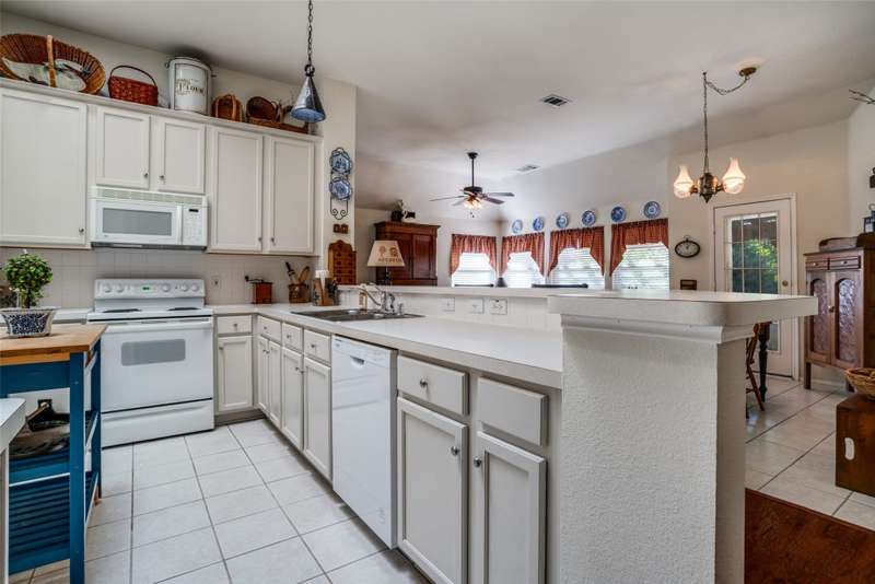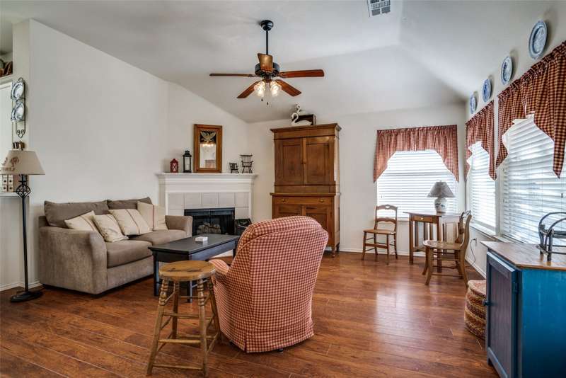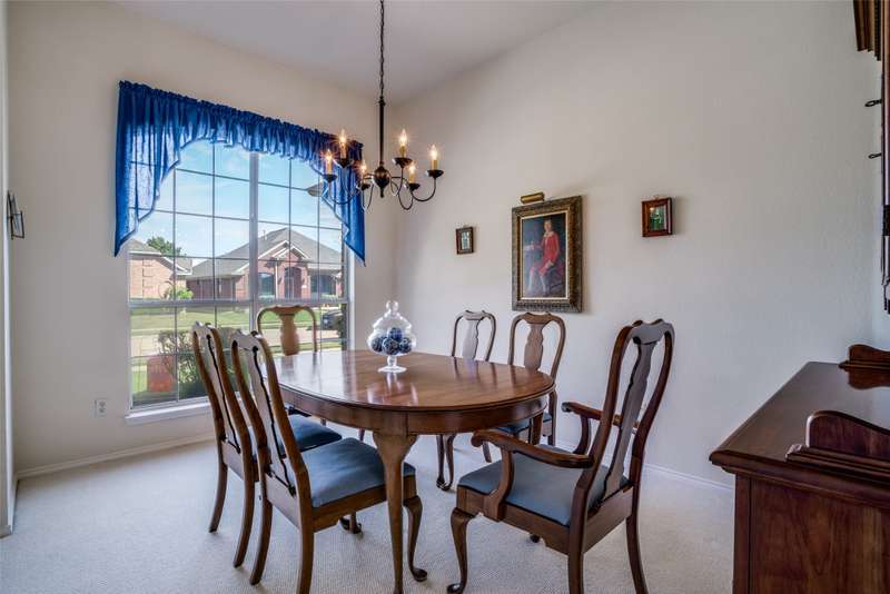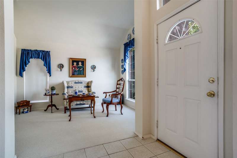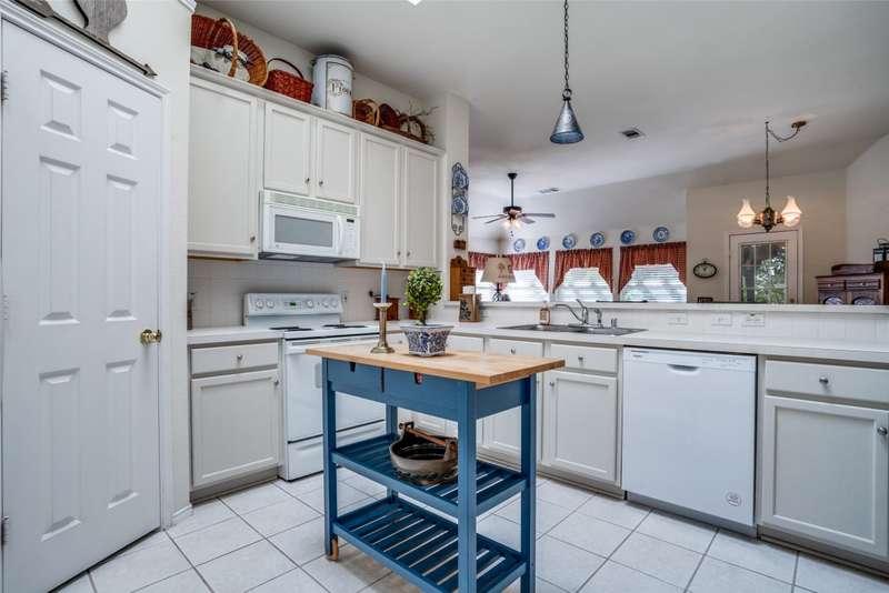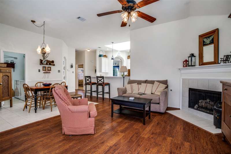Charming and in pristine condition, this one-level home is on a quiet cul-de-sac street with no through traffic. This home has a nice, easy flow, and each room has vaulted ceilings, natural light, and fresh paint. The entryway is flanked by formal living and dining areas, with an arched opening into the spacious kitchen, which is filled with natural light. The kitchen is open to the breakfast area and family room, which has wood flooring and a fireplace with gas logs. Windows across the back give a serene view of the patio and backyard. The primary bedroom has an ensuite bathroom with dual sinks, separate tub and shower, and a generous walk-in closet. Move-in ready, with crisp off-white carpet in the bedrooms and formals, and wood in the traffic areas and family room. The backyard is the perfect size for low maintenance living, with a spacious patio covered by a wood arbor with a ceiling fan, and a wood privacy fence. Kitchen is plumbed for gas range option. Hot water heater replaced 2023, HVAC 2017, dishwasher 2024, and bonus- the washer and dryer stay. There is a lovely greenbelt which runs through the neighborhood on Avery, off of Lake Forest. It's an easy walk to the elementary school. The neighborhood has a nice pool and baby pool, and HOA dues are a fraction of other neighborhoods!