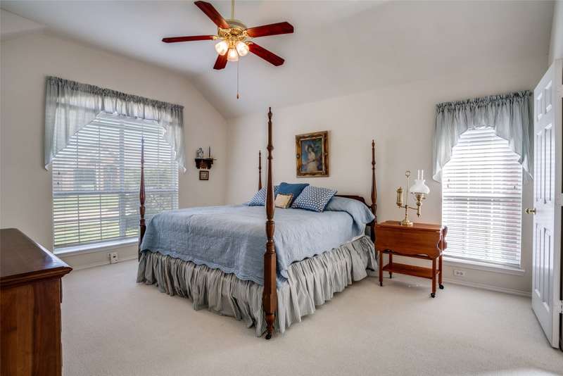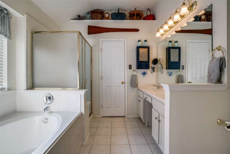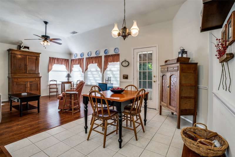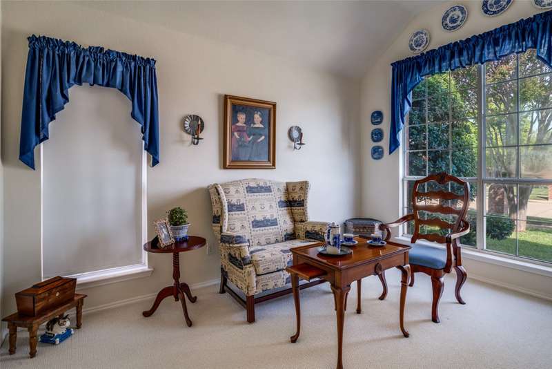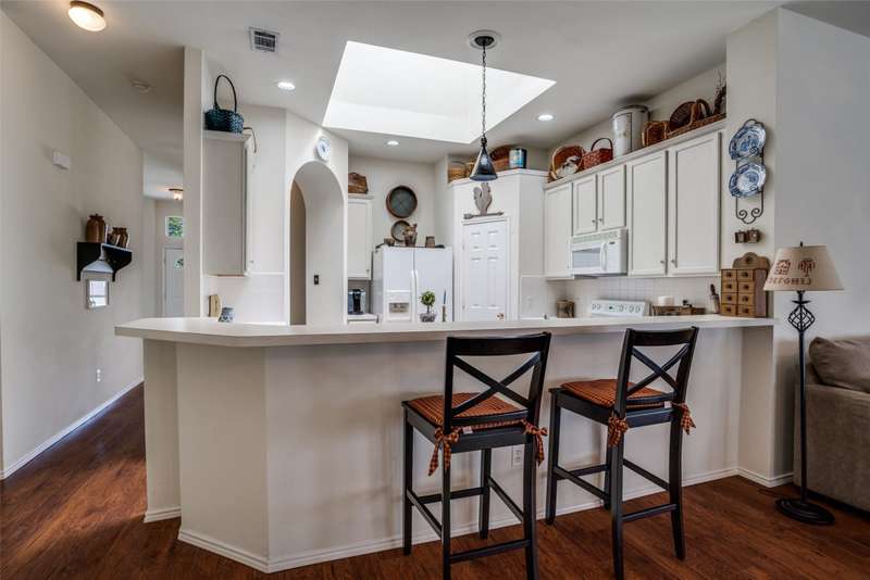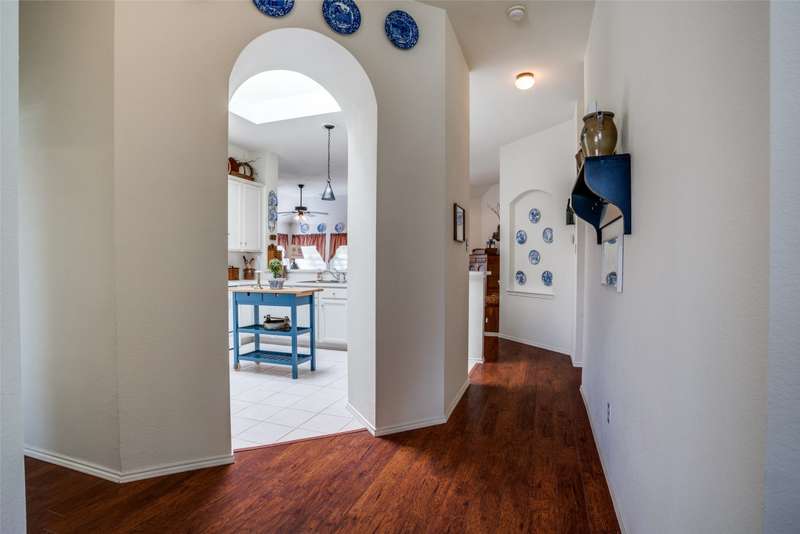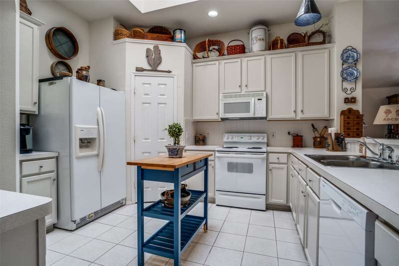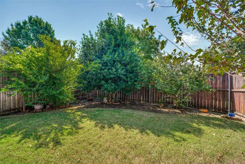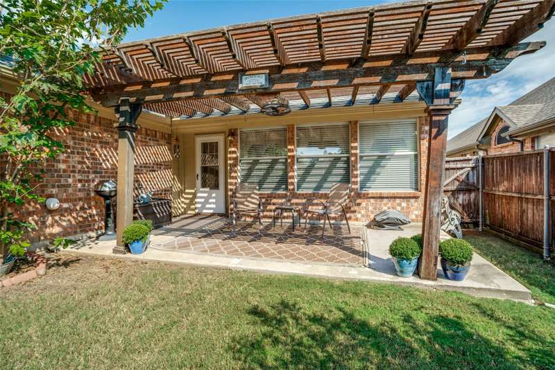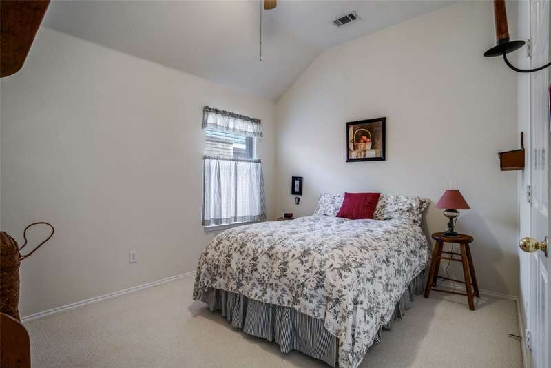Charming and in pristine condition, this one-level home is on a quiet cul-de-sac street with no through traffic. This home has a nice, easy flow, and each room has vaulted ceilings, natural light, and fresh paint. The entryway is flanked by formal living and dining areas, with an arched opening into the spacious kitchen, which is filled with natural light. The kitchen is open to the breakfast area and family room, which has wood flooring and a fireplace with gas logs. Windows across the back give a serene view of the patio and backyard. The primary bedroom has an ensuite bathroom with dual sinks, separate tub and shower, and a generous walk-in closet. Move-in ready, with crisp off-white carpet in the bedrooms and formals, and wood in the traffic areas and family room. The backyard is the perfect size for low maintenance living, with a spacious patio covered by a wood arbor with a ceiling fan, and a wood privacy fence. Kitchen is plumbed for gas range option. Hot water heater replaced 2023, HVAC 2017, dishwasher 2024, and bonus- the washer and dryer stay. There is a lovely greenbelt which runs through the neighborhood on Avery, off of Lake Forest. It's an easy walk to the elementary school. The neighborhood has a nice pool and baby pool, and HOA dues are a fraction of other neighborhoods!