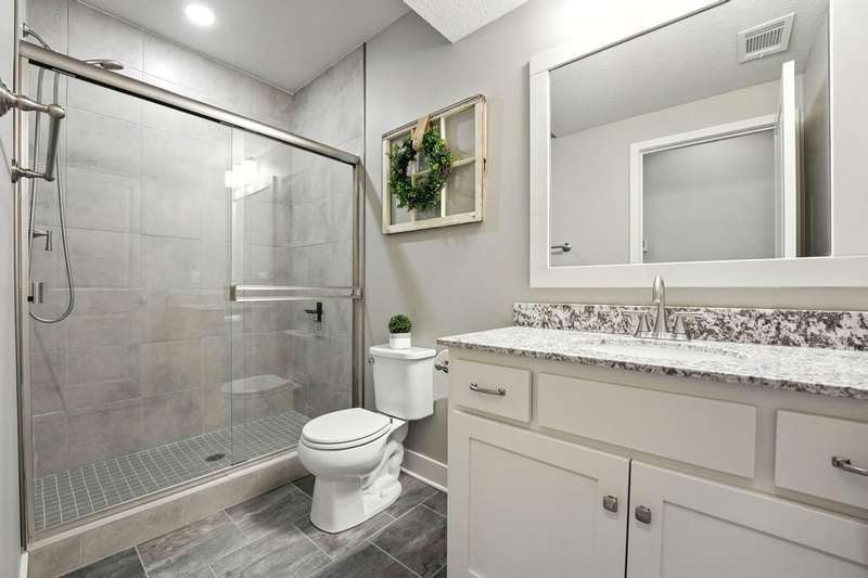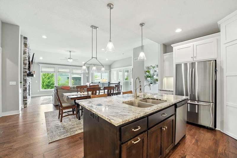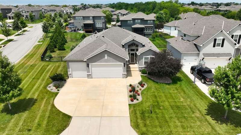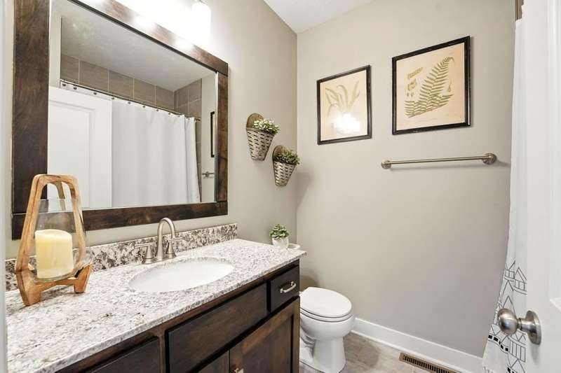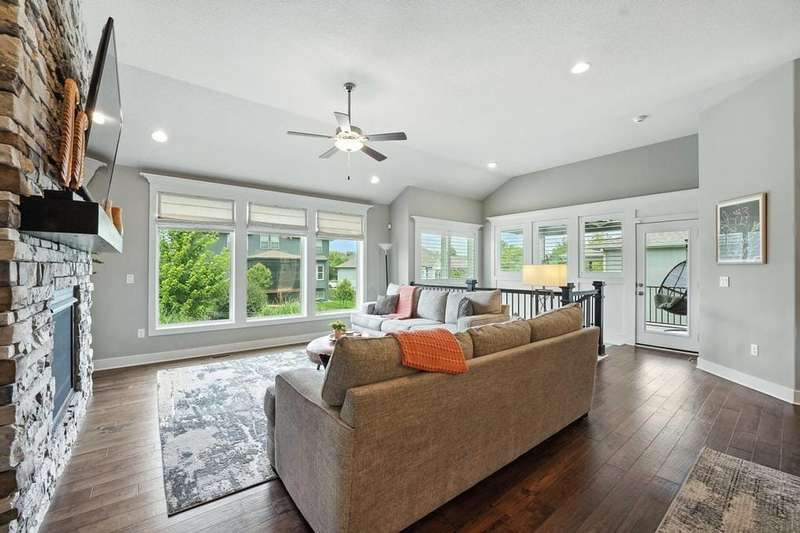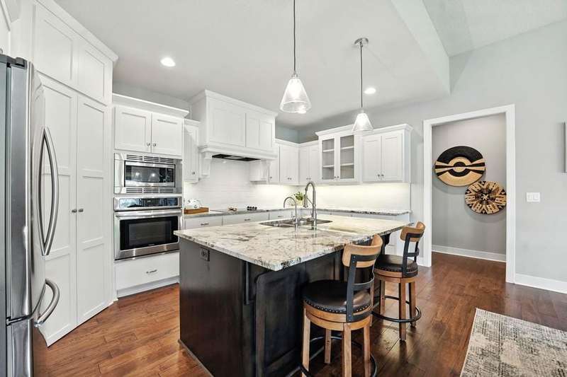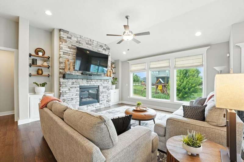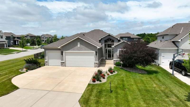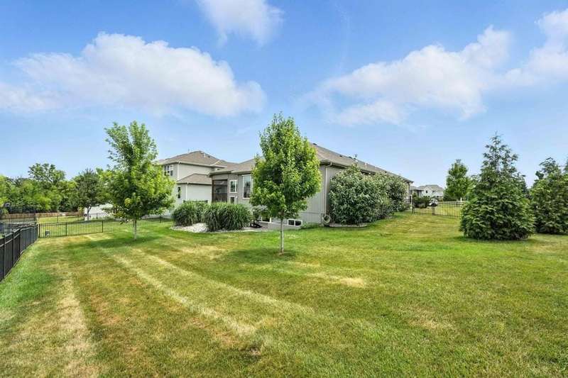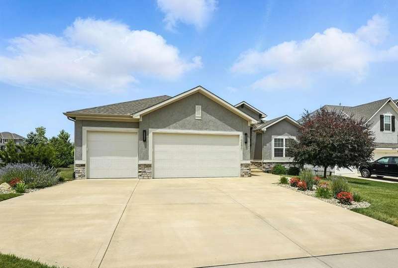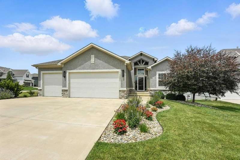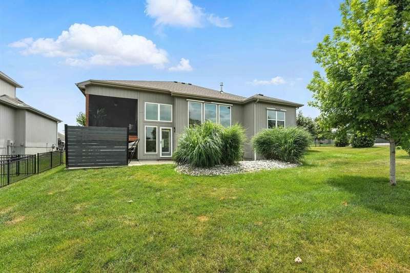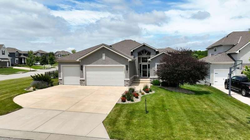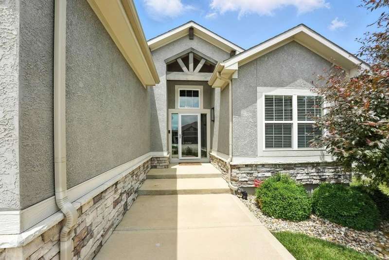 This home is better than new! Fabulous ranch/reverse 1.5-story home, skillfully constructed by SAB Homes. As you enter, be welcomed by a bright entryway adorned with hardwood floors and designer light fixture. The kitchen, a true masterpiece, features luxurious granite countertops, an expansive island, stainless steel appliances, and a walk-in pantry. The open floor plan is ideal for hosting gatherings, while the living room offers warmth with a stone fireplace, built-in cabinets, and rustic floating shelves. The main floor is a sanctuary, offering a primary bedroom equipped with a walk-in closet and an en suite bathroom. This bathroom includes double vanities, a soaking tub, a tiled shower, and a private toilet room. There are two more bedrooms and another full bathroom on the main level, perfect for office space or guest rooms. Savor your morning coffee or enjoy the sunset on the charming screened-in deck, complete with newly installed aluminum railing and spindles. The basement, bathed in natural light, serves as an inviting retreat with a chic wet bar, a fourth bedroom, and a third full bathroom, as well as ample space suitable for a home gym or hobby space. The backyard boasts a newly installed stone patio and privacy screen, ideal for hosting your next barbecue. Situated on a generous corner lot with a sprinkler system and beautiful landscaping, this residence showcases over $40,000 in upgrades, including an aluminum fence, paved patio, privacy screen, plantation shutters, remote-controlled shades, water purification system, and monitored security system. As an added highlight, Stonebridge Trails has tons of amenities including, 2 clubhouses, 1 with work out facility, 4 pools, playgrounds, basketball and tennis courts and nature trails through out the neighborhood. Welcome to your dream oasis!