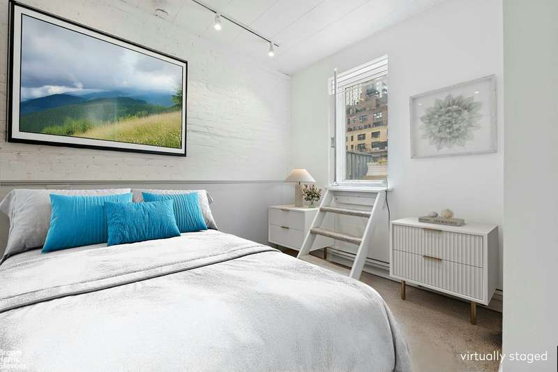 The apartment opens to a spacious living area, definitely large enough to include your home office footprint. ; Facing north, the renovated galley kitchen has full sized appliances, plenty of storage, natural light and room for a cafe high-top table and two stools. ; At the far end of the kitchen, there is a full bath with skylights. ; The bedroom suite includes a series of closets, a washer and dryer, the second full bath along with the entrance to the Rooftop Deck which is the full width of the apartment.