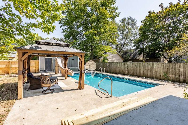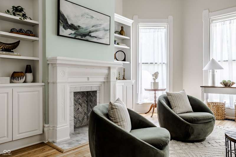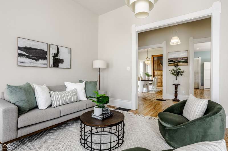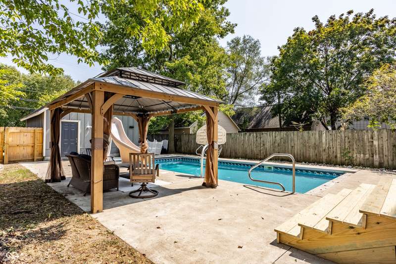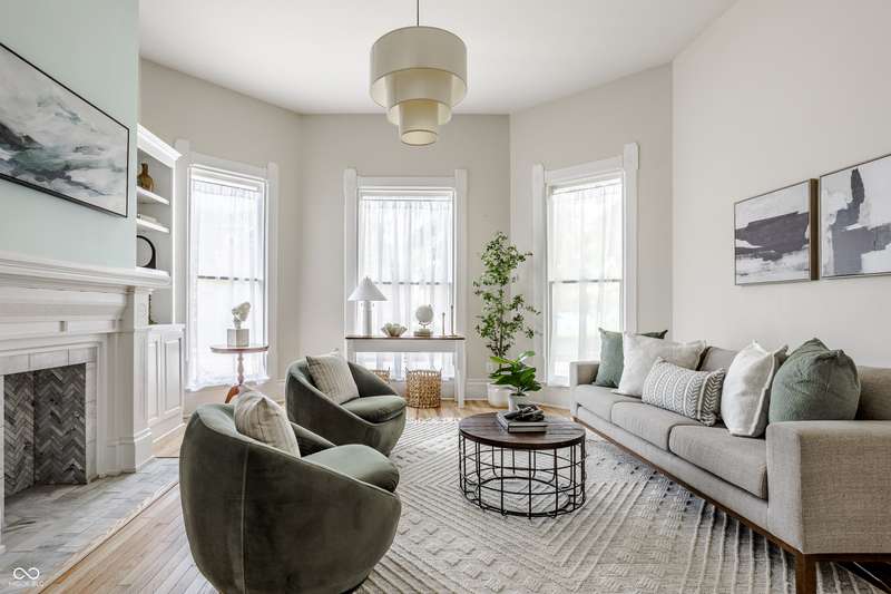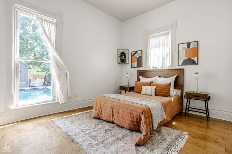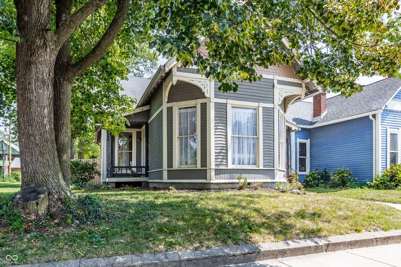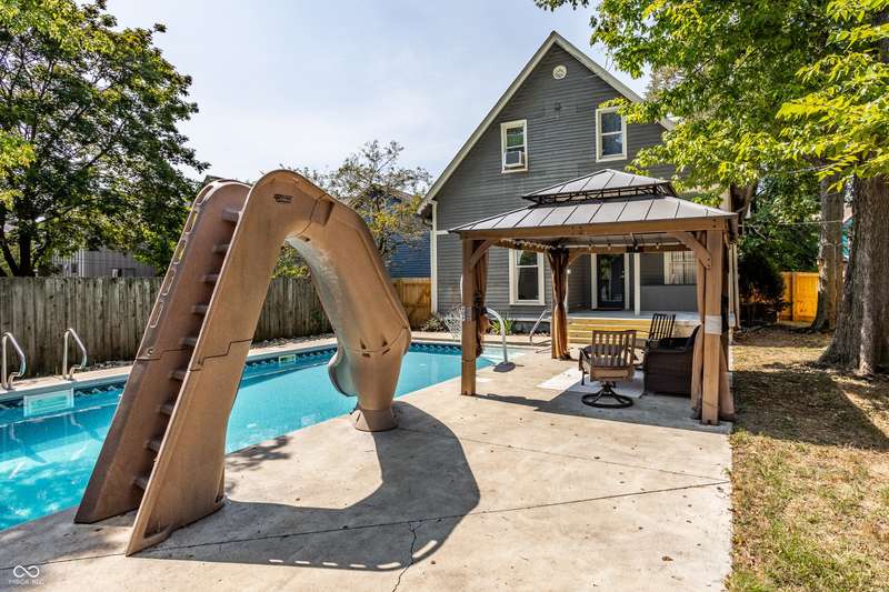 Lovely historic cottage situated in the thriving Herron Morton neighborhood. Lofty ceilings, built in bookshelves, a beautiful trimmed focal point in the dining room and floor to ceiling bay windows highlight this homes 1900's charm. A bright open kitchen featuring a large island, stainless steel appliances, and marble countertops perfectly blend modern conveniences with the appeal of old world details. The upstairs area has loads of possibilities with two large bedrooms and an additional full bathroom. The primary bedroom en-suite with sitting room on the first floor opens to the fully fenced yard and in-ground pool. Enjoy the covered patio, gazebo and fire pit in the yard perfect for entertaining and al fresco dining. Don't miss this charmer nestled near HMP park, coffee shops, book stores and more.