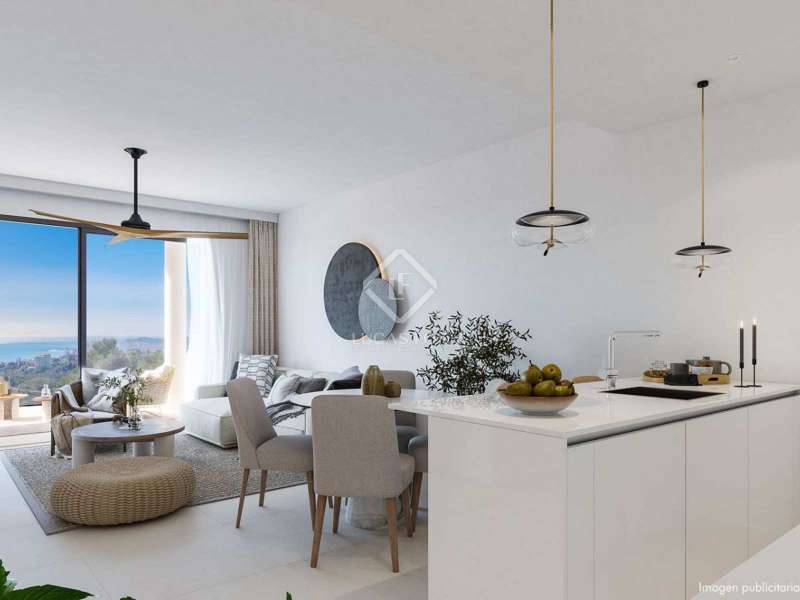 Lucas Fox is pleased to present Lomas del Higuerón 2, an exclusive new build development located in a privileged enclave in Fuengirola, a short distance from the beach on the Costa del Sol. A total of eight buildings are offered at different heights, taking advantage of the slope of the land, so that each of the homes can enjoy exceptional views of the sea. The development puts at your disposal this exclusive penthouse with a large terrace with solarium. The property has a modern design, with colors in neutral and cream tones that maximize the spaciousness and luminosity. The decoration includes noble and natural materials, such as wood and stone. Likewise, it has large floor-to-ceiling windows that allow in abundant natural light. Regarding the layout, it presents a large open-plan room that maximizes space, which integrates the living-dining room with the American-style kitchen with a fabulous central island and access to the terrace. The day area is complemented by a utility room. The night area has a double bedroom , a bathroom to serve the entire property, a second ensuite bedroom and the magnificent main bedroom with its private bathroom, dressing area and access to the terrace. The property is completed with an exclusive terrace with solarium, with several environments, such as a chill-out area , exterior dining room , hammock area and solarium. The property is not only widely functional, it also stands out for its quality. Its features include lacquered interior doors, built-in wardrobes in the bedrooms, porcelain stoneware floors, a home automation system with smoke detection and a flood sensor controlled via telephone. For greater comfort, it has an underfloor heating system in the bathrooms, with the option of installing it in the rest of the property, hot/cold air conditioning in the living room and bedrooms powered by aerothermics and PVC or aluminum carpentry with Thermoacoustic double glazing with safety glass in areas with risk of impact. The kitchen and bathrooms are fully equipped. The bathrooms include porcelain tiles and Teka or similar brand equipment. The kitchen benefits from having high and low furniture, a Silestone or similar type countertop and paneled appliances with energy rating A: ceramic hob, oven, microwave, extractor hood, refrigerator, dishwasher, washing machine/dryer. Finally, the development is committed to sustainability and respect for the environment, for example, with the installation of charging for electric vehicles, the installation of an aerothermics system for hot and cold air conditioning and the integration of the development into the environment. natural. The development offers its residents access to a series of communal areas such as gardens, several outdoor swimming pools and a children's play area. In addition, the option is offered to choose between three customization models, to select a series of finishes such as flooring or porcelain tiling in the bathrooms. Likewise, the homes are complemented by two parking spaces and the option to purchase storage rooms. Get in touch for more information.