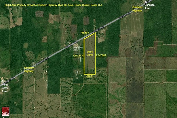 This 30.04 Acre property sits 2.5 Mls south of Big Falls along the Southern Highway in the Toledo District. It is directly next to the Bowen & Bowen Sales Center and offers 738.33 ft ft of highway frontage and a depth that ranges from 1,817 ft to 2,147 ft. The entire property is mostly in its natural state with a wide range of trees and forested areas throughout.