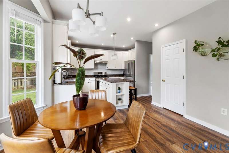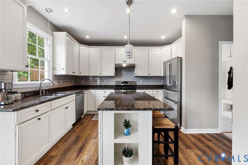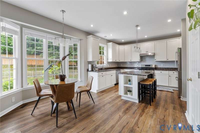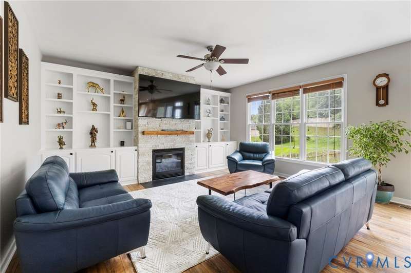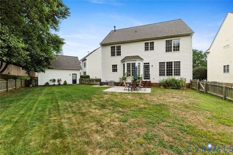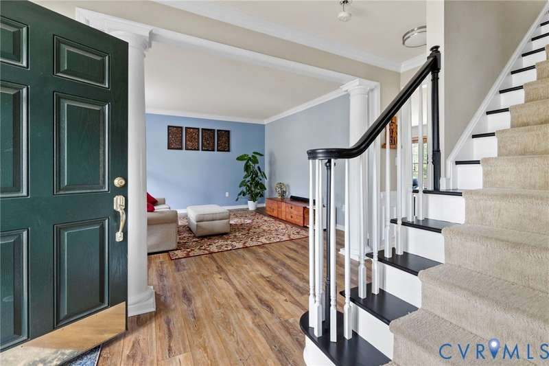 Beautifully maintained and fully renovated, this 5-bedroom, 3.5-bath home is situated on a spacious cul-de-sac lot with a fenced backyard and an oversized patio, ideal for outdoor living. A charming front porch welcomes you into a wide foyer flanked by formal living and dining rooms enhanced with custom millwork, crown molding, columns, and a tray ceiling with picture molding and chair rail. The updated eat-in kitchen boasts white cabinetry, granite countertops with island seating, tiled backsplash, recessed and under-cabinet lighting - an ideal space for gathering and cooking. The inviting family room features a gas fireplace, abundant natural light, and built-in bookcases with backlighting. Upstairs, the primary suite offers two closets and a luxurious renovated ensuite with marble countertops and a tiled shower. Three additional bedrooms share an updated bath. The third floor serves as a versatile 5th bedroom or flex space with two bonus areas and a full bath. Additional highlights include a laundry room, mudroom with built-in bench and storage, a large 2-car garage with walk-up attic storage, a newer roof (2020), and low-maintenance brick and vinyl exterior. Move-in ready with thoughtful updates throughout!