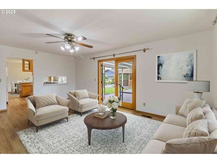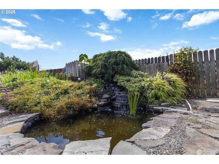 Spacious One-Level Living in Town! This beautifully maintained, move-in-ready home offers almost 2100 sq. ft. on a single level, perfectly situated on an oversized lot in the heart of town. The expansive floor plan features a HUGE primary suite with a walk-in shower, three additional bedrooms, plus both a living room and a cozy family room with a propane fireplace—perfect for gathering on cool evenings. Enjoy year-round comfort with a heat pump and take advantage of the fully fenced backyard with lush landscaping, a soothing water feature, and an outbuilding for extra storage or hobbies. Relax or entertain on the Trex deck and covered patio. All this, just minutes from schools, shopping, and local amenities!