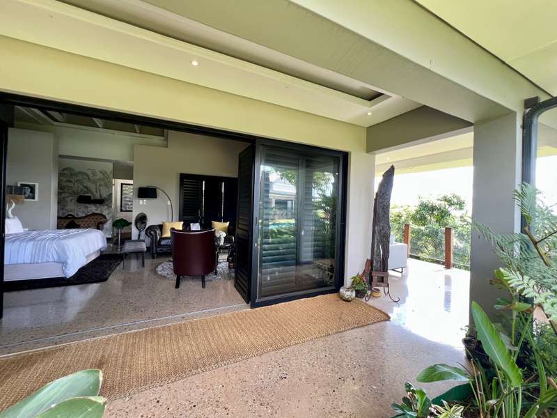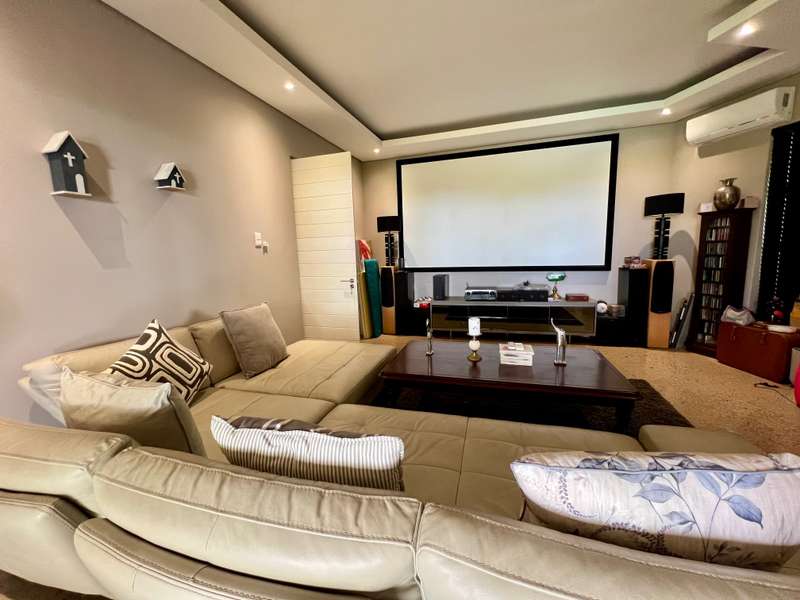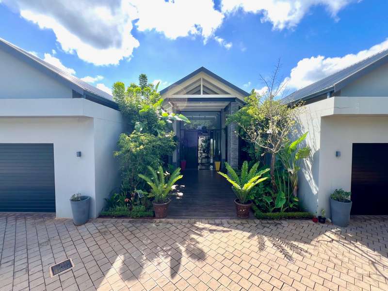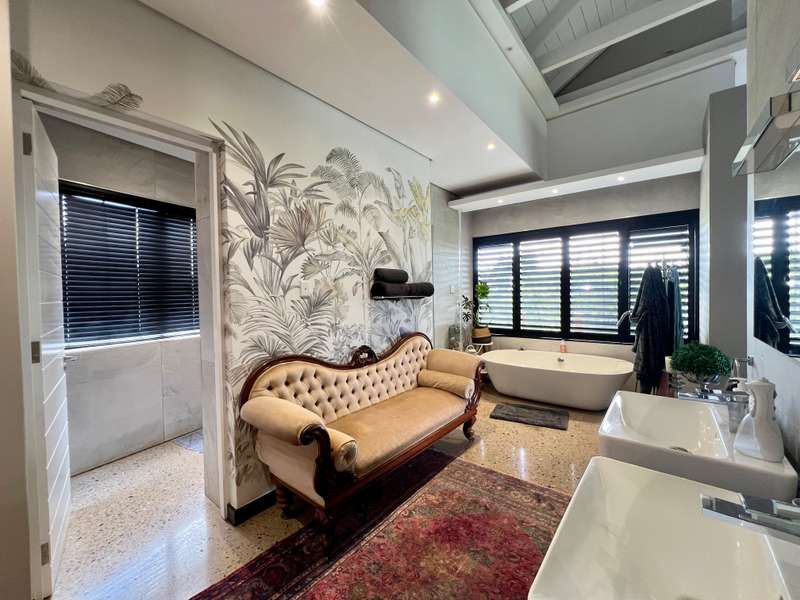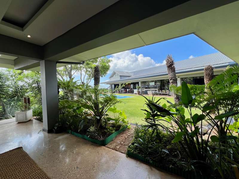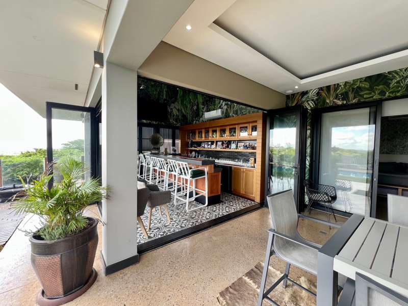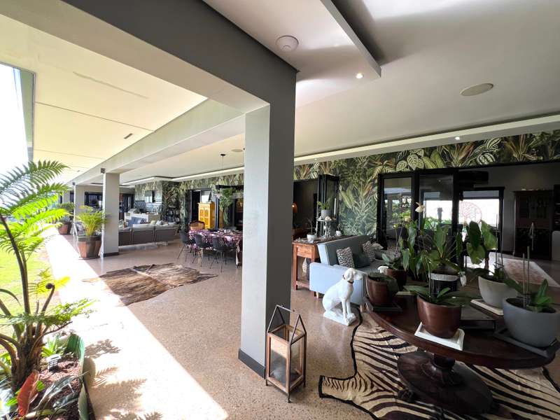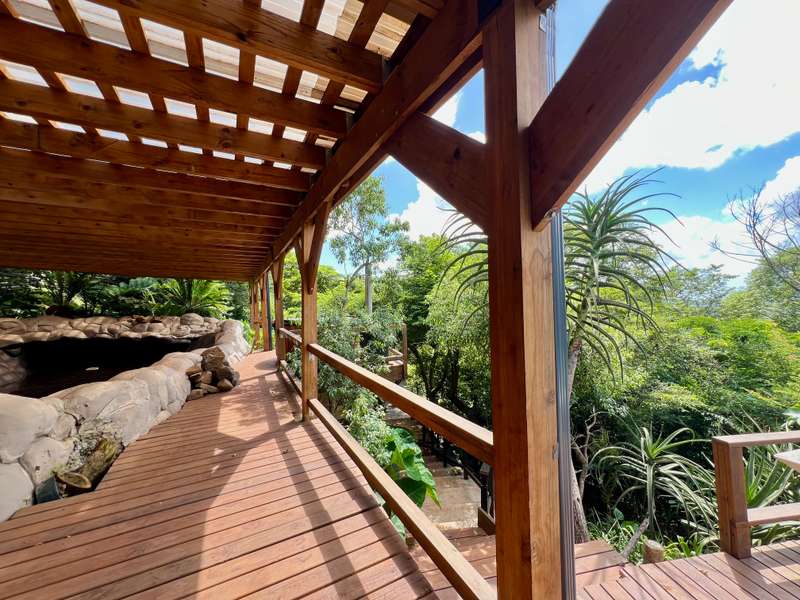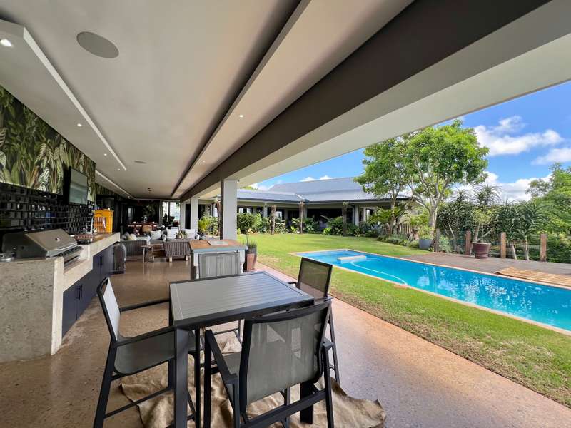 This exceptional single-level, 5-bedroom home is situated on an expansive plot and features a separate guest wing currently operating as a successful Airbnb, along with additional staff accommodation. The property boasts a large, covered patio, perfect for entertaining by the swimming pool. The kitchen is equipped with state-of-the-art integrated appliances, there is also a scullery, laundry room and pantry. The beautiful foyer connects all bedrooms and study/office to the covered patio, enhancing the home's open, airy feel. An added luxury is the movie room, perfect for entertainment. The patio area features a custom handmade solid wood bar, complete with built-in speakers and a flat-screen TV, perfect for hosting guests. Additional highlights include a built-in gas braai and a large fire pit adjacent to the pool, creating an inviting outdoor space for relaxation and entertainment. Sustainability is ensured with a comprehensive off-the-grid solar system and an osmosis water plant with backup water tanks. Outdoor amenities include a large Koi Pond, a hot tub on the deck, and another timber deck offering stunning valley and sea views. The beautifully landscaped gardens feature a wide variety of cycads, adding to the property's unique appeal. Additionally, there are two double garages with extra storage rooms. Property Features Advanced Off-Grid Systems • Solar Power: 11.5 kW solar system with air-conditioned solar room and backup generator. • Water Independence: Borehole water supply, reverse osmosis filtration system, and 15,000-liter water storage. Fully independent of municipal water. Kitchen Excellence •Built-in Scotsman ice machine and gas braai. • Integrated appliances, including washing machines, dishwashers, and tumble dryers. • State-of-the-art equipment: two ovens, coffee machine, and Bluetooth-enabled microwave and oven system. Additional Luxuries • Fully air-conditioned throughout. • Designer blinds installed throughout the home. • Large fire pit and pool deck beds included in the sale. • Downstairs flatlet for added versatility. Perfectly tailored for off-grid living, this exclusive property combines advanced self-sufficiency systems with high-end finishes and luxurious features, making it a one-of-a-kind opportunity for discerning buyers.