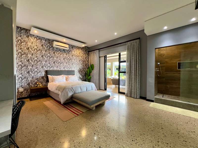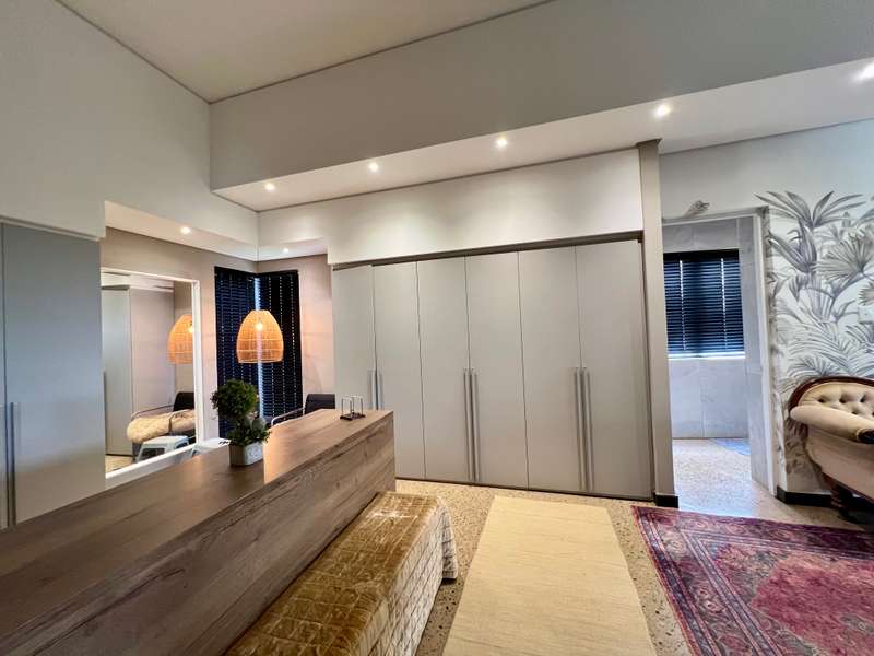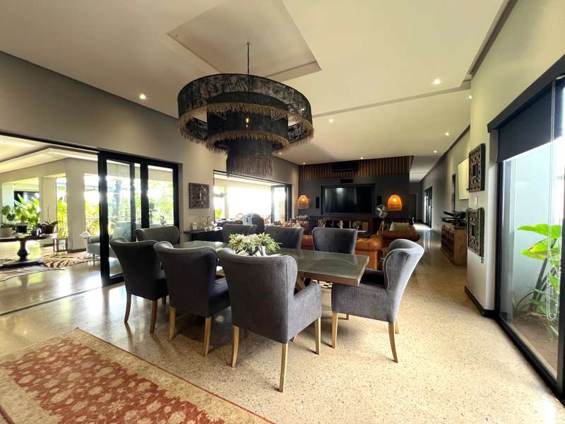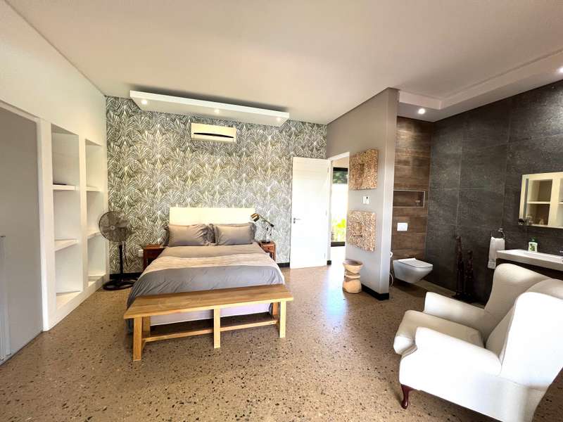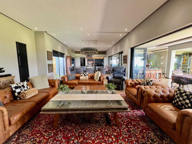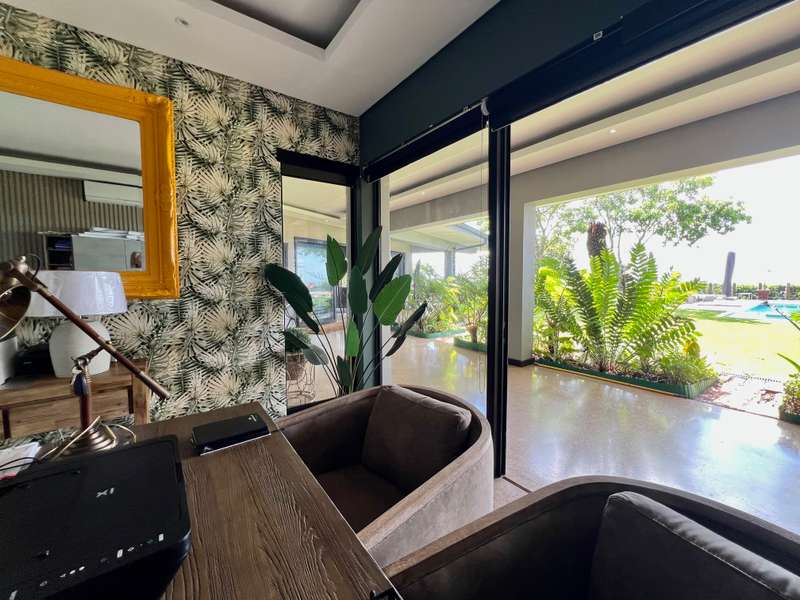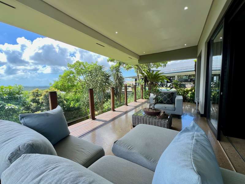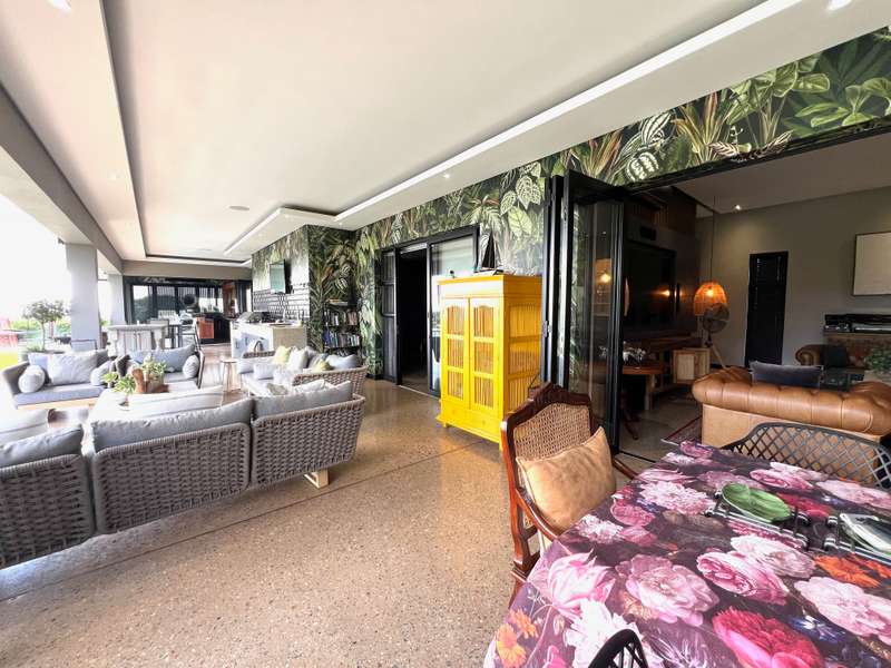 This exceptional single-level, 5-bedroom home is situated on an expansive plot and features a separate guest wing currently operating as a successful Airbnb, along with additional staff accommodation. The property boasts a large, covered patio, perfect for entertaining by the swimming pool. The kitchen is equipped with state-of-the-art integrated appliances, there is also a scullery, laundry room and pantry. The beautiful foyer connects all bedrooms and study/office to the covered patio, enhancing the home's open, airy feel. An added luxury is the movie room, perfect for entertainment. The patio area features a custom handmade solid wood bar, complete with built-in speakers and a flat-screen TV, perfect for hosting guests. Additional highlights include a built-in gas braai and a large fire pit adjacent to the pool, creating an inviting outdoor space for relaxation and entertainment. Sustainability is ensured with a comprehensive off-the-grid solar system and an osmosis water plant with backup water tanks. Outdoor amenities include a large Koi Pond, a hot tub on the deck, and another timber deck offering stunning valley and sea views. The beautifully landscaped gardens feature a wide variety of cycads, adding to the property's unique appeal. Additionally, there are two double garages with extra storage rooms. Property Features Advanced Off-Grid Systems • Solar Power: 11.5 kW solar system with air-conditioned solar room and backup generator. • Water Independence: Borehole water supply, reverse osmosis filtration system, and 15,000-liter water storage. Fully independent of municipal water. Kitchen Excellence •Built-in Scotsman ice machine and gas braai. • Integrated appliances, including washing machines, dishwashers, and tumble dryers. • State-of-the-art equipment: two ovens, coffee machine, and Bluetooth-enabled microwave and oven system. Additional Luxuries • Fully air-conditioned throughout. • Designer blinds installed throughout the home. • Large fire pit and pool deck beds included in the sale. • Downstairs flatlet for added versatility. Perfectly tailored for off-grid living, this exclusive property combines advanced self-sufficiency systems with high-end finishes and luxurious features, making it a one-of-a-kind opportunity for discerning buyers.