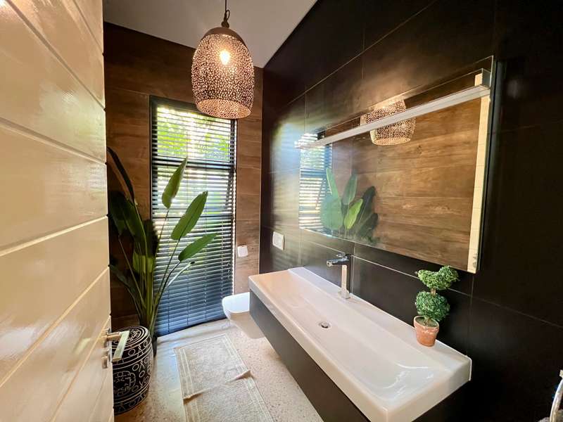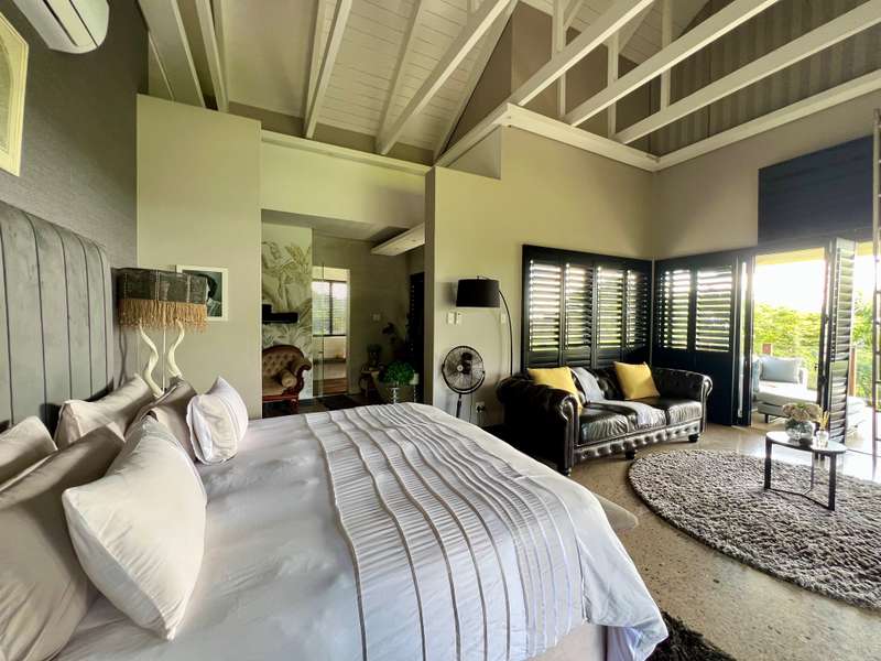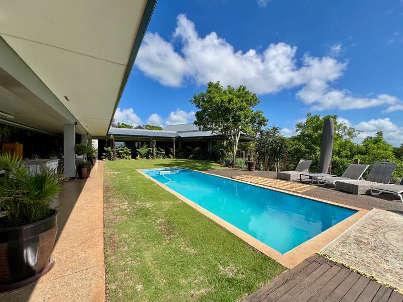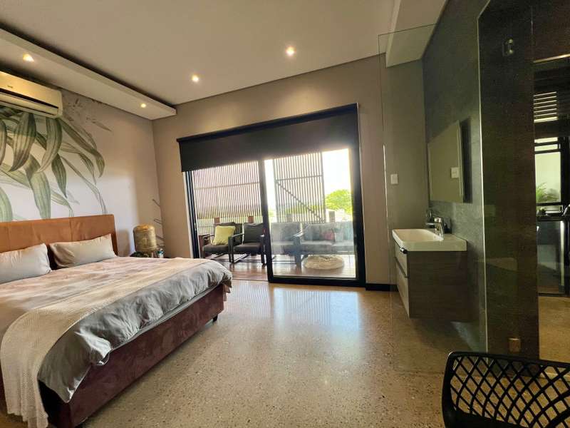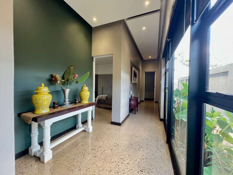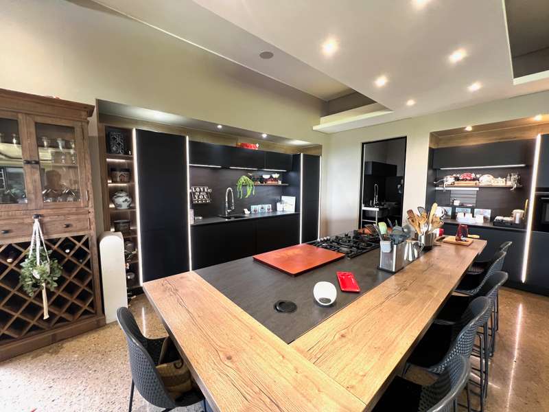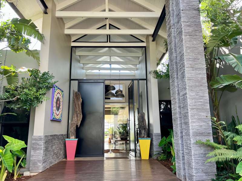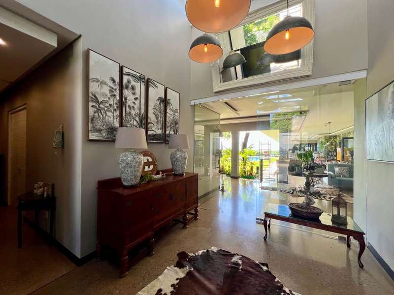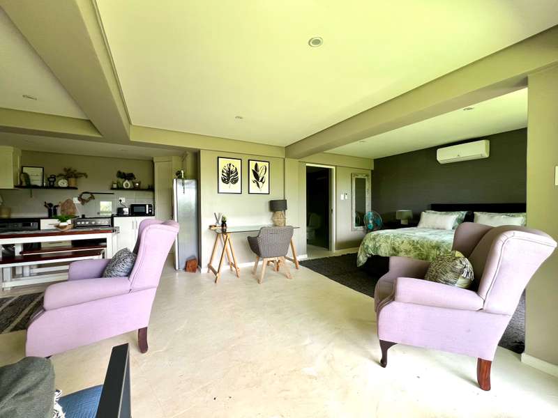 This exceptional single-level, 5-bedroom home is situated on an expansive plot and features a separate guest wing currently operating as a successful Airbnb, along with additional staff accommodation. The property boasts a large, covered patio, perfect for entertaining by the swimming pool. The kitchen is equipped with state-of-the-art integrated appliances, there is also a scullery, laundry room and pantry. The beautiful foyer connects all bedrooms and study/office to the covered patio, enhancing the home's open, airy feel. An added luxury is the movie room, perfect for entertainment. The patio area features a custom handmade solid wood bar, complete with built-in speakers and a flat-screen TV, perfect for hosting guests. Additional highlights include a built-in gas braai and a large fire pit adjacent to the pool, creating an inviting outdoor space for relaxation and entertainment. Sustainability is ensured with a comprehensive off-the-grid solar system and an osmosis water plant with backup water tanks. Outdoor amenities include a large Koi Pond, a hot tub on the deck, and another timber deck offering stunning valley and sea views. The beautifully landscaped gardens feature a wide variety of cycads, adding to the property's unique appeal. Additionally, there are two double garages with extra storage rooms. Property Features Advanced Off-Grid Systems • Solar Power: 11.5 kW solar system with air-conditioned solar room and backup generator. • Water Independence: Borehole water supply, reverse osmosis filtration system, and 15,000-liter water storage. Fully independent of municipal water. Kitchen Excellence •Built-in Scotsman ice machine and gas braai. • Integrated appliances, including washing machines, dishwashers, and tumble dryers. • State-of-the-art equipment: two ovens, coffee machine, and Bluetooth-enabled microwave and oven system. Additional Luxuries • Fully air-conditioned throughout. • Designer blinds installed throughout the home. • Large fire pit and pool deck beds included in the sale. • Downstairs flatlet for added versatility. Perfectly tailored for off-grid living, this exclusive property combines advanced self-sufficiency systems with high-end finishes and luxurious features, making it a one-of-a-kind opportunity for discerning buyers.