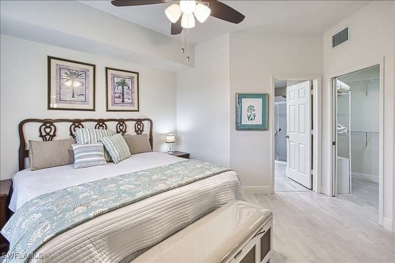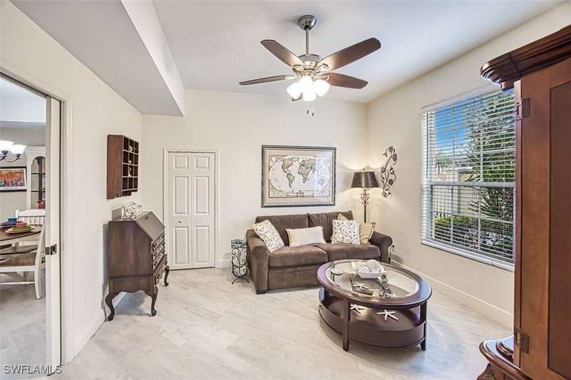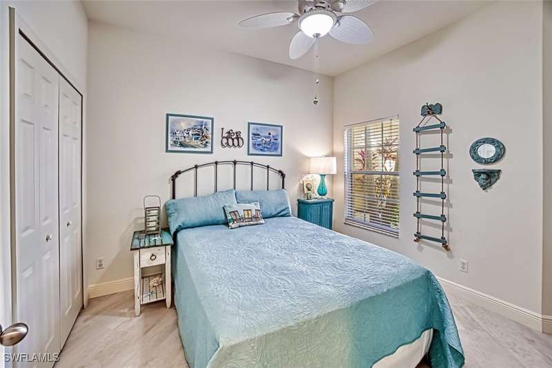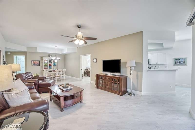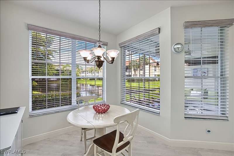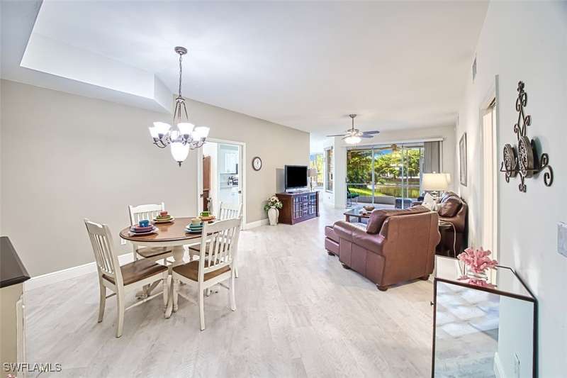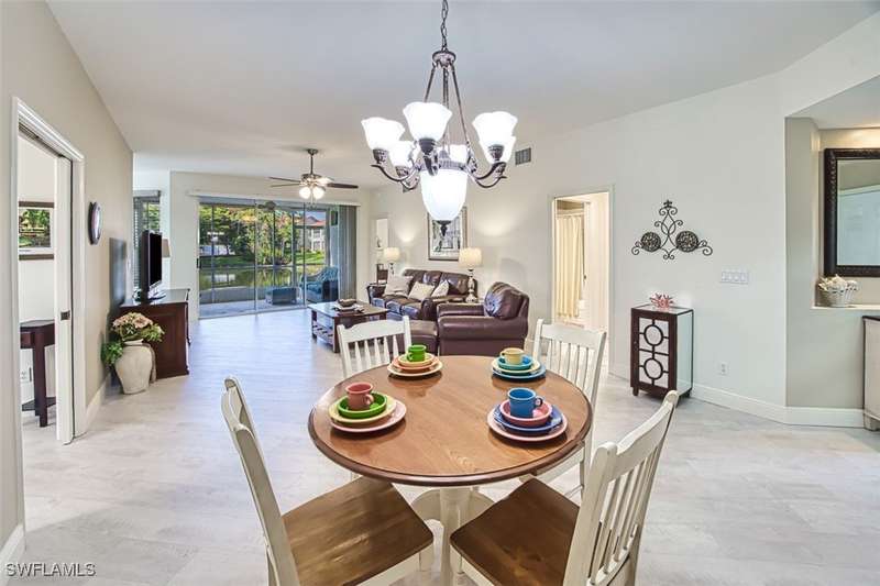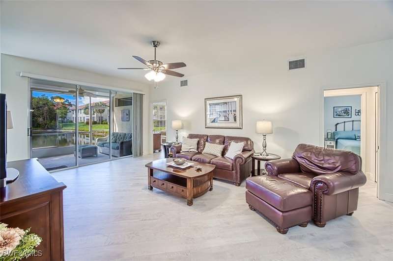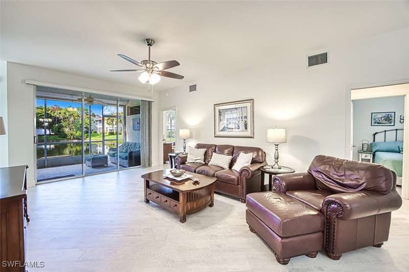 MOTIVATED SELLER! Spacious and light-filled, this first-floor end-unit carriage home in Avalon Bay offers a relaxed Florida lifestyle just minutes from Sanibel and Fort Myers beaches. Featuring 2 bedrooms, 2 bathrooms, and a flexible den/office space, the split floorplan ensures privacy and comfort-all on one level with no stairs. Enjoy peaceful lake views from the large screened lanai, complete with electric roll-down storm protection. The 2-car garage provides extra space for beach, fishing, and biking gear. Inside, you'll find wood-look flooring, a bright eat-in kitchen, and a spacious laundry room with added storage. The flex room, easily enclosed with pocket doors, serves perfectly as a guest room, office, or gym. Recent updates include a new AC system, and the community has replaced all roofs with no storm flooding reported. There are no CDD or City taxes. Located directly across from the clubhouse and pool, this home is ideal for seasonal or year-round living. Avalon Bay's amenities include a pool, spa, tennis courts, fitness center, billiards, and a clubhouse. Convenient to Health Park, Golisano Children's Hospital, Lakes Park, restaurants, farmers markets, and Lee County's bike trails. Offered turnkey furnished for a truly move-in ready experience.