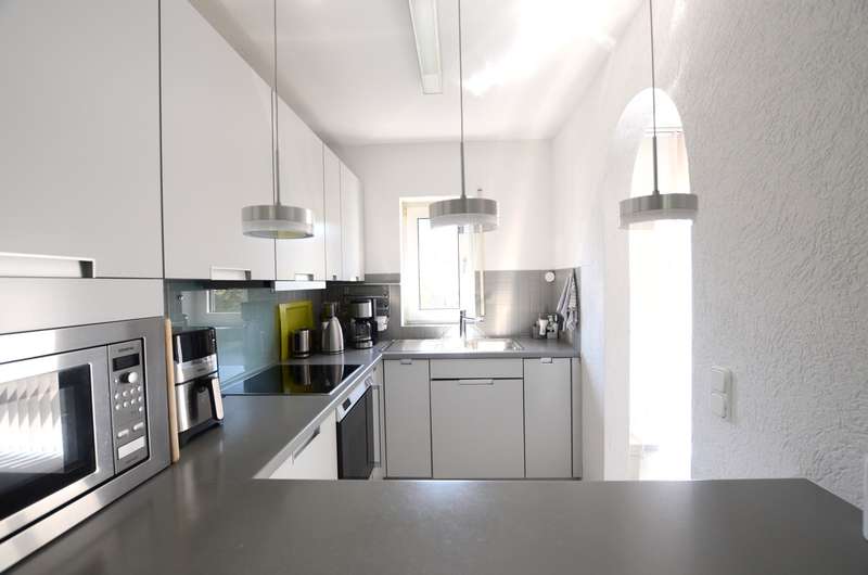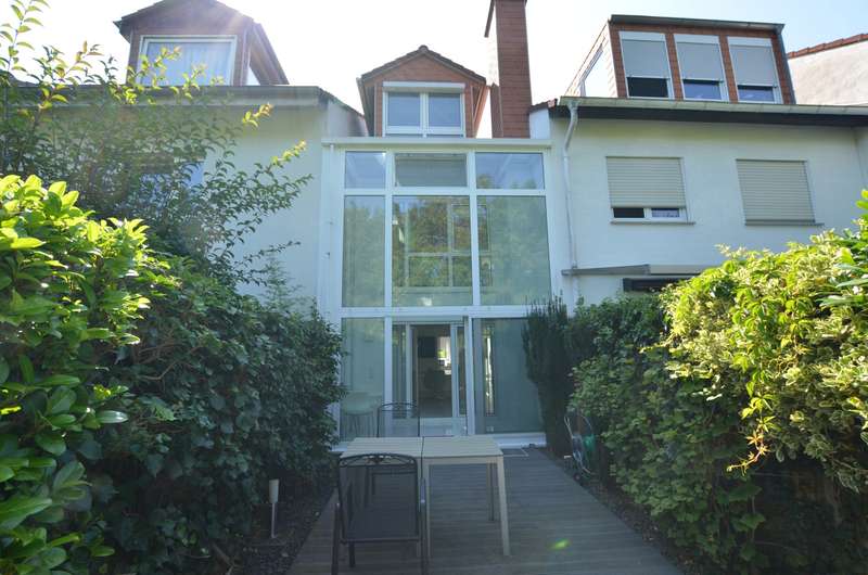 This extremely well-kept mid-terrace house is located in a quiet residential area of Kronberg im Taunus, adjacent to the edge of a field and not far from the Westerbach stream. The historic old town of Kronberg, all shopping facilities, kindergartens, elementary school and the S-Bahn station are within walking distance. The house was built in 1987 and offers around 133 m² of living space on 3 floors, providing plenty of space for couples, freelancers or a small family who would like to live in a central location yet close to nature. The first floor of the house is currently used as an office. The living room, kitchen, two bedrooms and the bathroom are located on the upper floors. Two further bedrooms and an additional bathroom could be added through minor remodeling measures, making it suitable for a larger family. The house also has a high, airy conservatory, a beautiful wooden terrace behind the house and a further terrace in front of the house. The house has a full basement and therefore offers plenty of storage space. A parking space in front of the house and a further parking space in a nearby underground garage round off the offer. We look forward to hearing from you and would be happy to arrange a viewing with you.