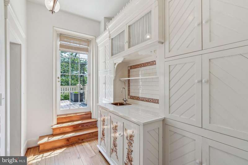 The Alexander Graham Bell House Step into a Gilded Age fantasy with this extraordinary Italianate corner residence, built in 1854 and once home to Alexander Graham Bell and his family. Steeped in history and architectural splendor, this six-bedroom, six full and two half-bath Georgetown estate is a masterwork of 19th-century elegance, meticulously preserved and thoughtfully updated.A Grand Historic InteriorSpanning four gracious levels, the home is centered around a sweeping mahogany staircase rising beneath a stained-glass skylight. Echoes ofUpstairs/Downstairsliving aboundfrom working call bells connecting principal rooms to the kitchen, to grapevine and acanthus-leaf moldings, faux bois doors, paneled window shutters, and intricate brass hardware.The twin parlorsperfect for formal entertainingfeature marble fireplaces with carved acorn details, gilded crown moldings and chandelier medallions. Stained-glass pocket doors lead into the formal dining room, where striped wood floors extend into a ballroom-like space framed by Palladian triple-hung windows that open to the terrace garden and fountain. Period chandeliers, cut-crystal sconces, and etched glass fixtures complete the unified decorative scheme. The main level half-bath features an antique Edward Johns & Co sink, period high-tank commode, and opaline glass light fixtures.Chefs Kitchen & Terraced GardenThe light-filled, eat-in kitchen blends historic charm with modern functionality. Anchored by a wood-burning fireplace, it includes Wolf and Sub-Zero appliances, a mix of butcher block and stone counters, and fully functional original call bells. French doors open directly to the lush, walled terrace gardenan urban sanctuary complete with mature plantings and a stone fountain.Private Quarters & Lavish SuitesThe original second-floor primary bedroom is bathed in natural light and adjoins a marble-and-tile ensuite bath with Waterworks fixtures and a towel warmer. A nearby study/library features a marble fireplace and access to a canopied terrace, as well as a concealed Eastlake-style wet bar outfitted with a copper sink, pomegranate-motif painted tiles, and herringbone cabinetry.A later addition brings a private octagonal primary suite enhanced with opaline glass tiebacks, floral plaster medallion, and dual bathrooms. One features a marble sink, tile shower, and Waterworks fittings; the other offers a large marble vanity within a spacious dressing room, complete with a built-in ironing station and Jacuzzi tub.On the third floor, two additional bedrooms each offer marble fireplaces, custom built-ins, and full ensuite baths with clawfoot tubs, pedestal sinks, and antique light fixtures.Lower LevelAccessible via private staircases, the fully equipped lower level includes a two-bedroom in-law or rental suite with twin closets, a full and half bath, and a dedicated laundry. Period elements abound: original tile floors, a Dutch door, cast-iron hardware, and tongue-and-groove detailing. The historic butlers pantry and second laundry station add charm and functionality.Additional Features Include:Oversized two-car garage with ample storage and recent improvementsCopper flashing and drainage throughoutOriginal enamel doorknobs, locks, and fixtures throughoutMultiple fireplaces, including wood-burning and decorative marbleThoughtful updates with Waterworks, Lefroy Brooks, and Czech & Speake fixturesA Rare OpportunityLocated within the Georgetown Historic District and listed on the D.C. Inventory of Historic Sites, the Alexander Melville Bell House represents an extraordinary convergence of heritage, craftsmanship, and luxury. It is not merely a homeit is a legacy, ready for its next steward.
