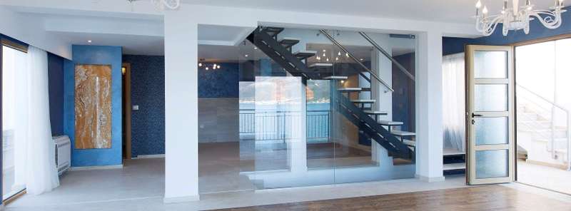 At the highest level, there are two bedrooms, both with a bathroom. The smaller bedroom has a terrace with a beautiful sea view on the Tivat bay.