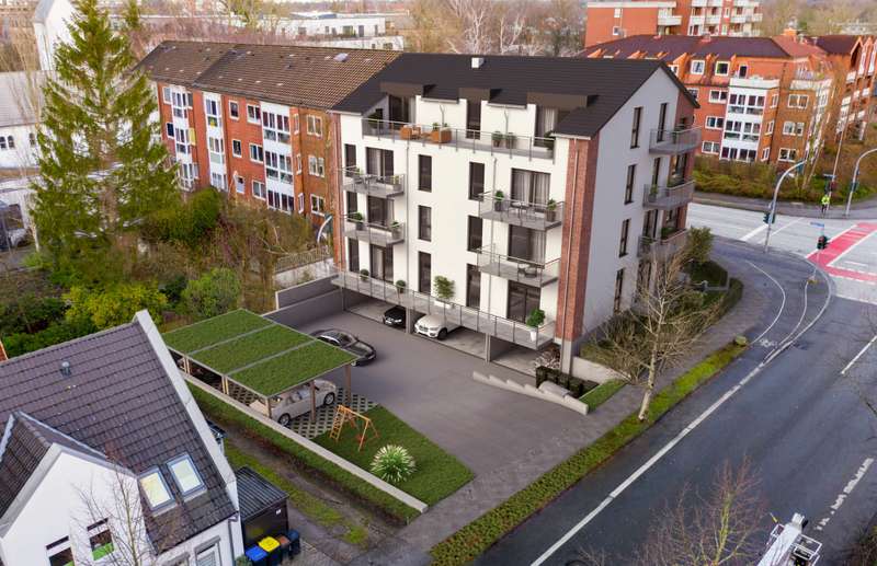 On this corner plot in a central location in Ahrensburg, this planned apartment building with 10 apartments and a small office space on the first floor can be built at short notice. The gross floor area is 848 m² plus basement with 240 m² and around 3,000 m³ of enclosed space. The energy standard is A+ KfW 40 EE and therefore not only the special depreciation for new buildings (5% p.a. for the first 6 years) applies, but also the special depreciation for sustainable buildings QNG (5% p.a. for the first 4 years) for KfW 40. Together with a real calculated rent of € 167,000 cold, the project should be attractive! The building permit, soil survey, completion etc. are already available. There is a total of 708.5 m² of living and office space plus traffic areas and usable space. 11 parking spaces are planned and approved, which means 3 carports in the courtyard, 4 parking spaces in the basement of the building as well as 4 outdoor parking spaces and a large bicycle room. Pre-installation for electric charging points has also been considered. On the first floor, a 50 m² office space and two approx. 70 m² apartments will be created NEW. All floors are accessible by elevator and are also wheelchair-accessible with floor-level showers. On the upper floors there are 2 and 3 room apartments with modern furnishings and balconies. The ground floor plan shown here is a version with 3 offices. This corresponds to the original status of the building permit. A change of use has been made in which only one office space is planned on the ground floor (unit 1). The floor plans of the units on the ground floor could therefore be created in the same way as those on the upper floor. All units have storage rooms with washing machine connections in the apartment and additional storage rooms in the basement. With the energy standard A+ KFW 40 EE, this house is planned to be particularly efficient and future-proof. A fixed-price offer for the construction of the building plus the ancillary facilities has been submitted by a renowned construction company that has already realized many properties in Ahrensburg and the surrounding area and is happy to show reference properties. Alternatively, it would also be possible to purchase only the plot with planning permission at a price of € 1,490,000.