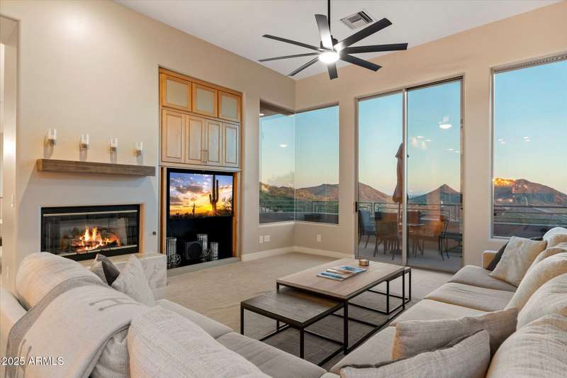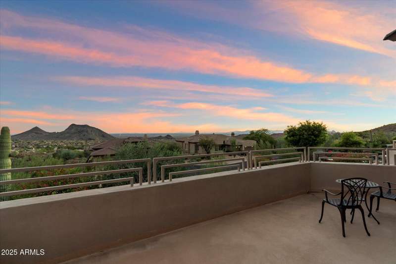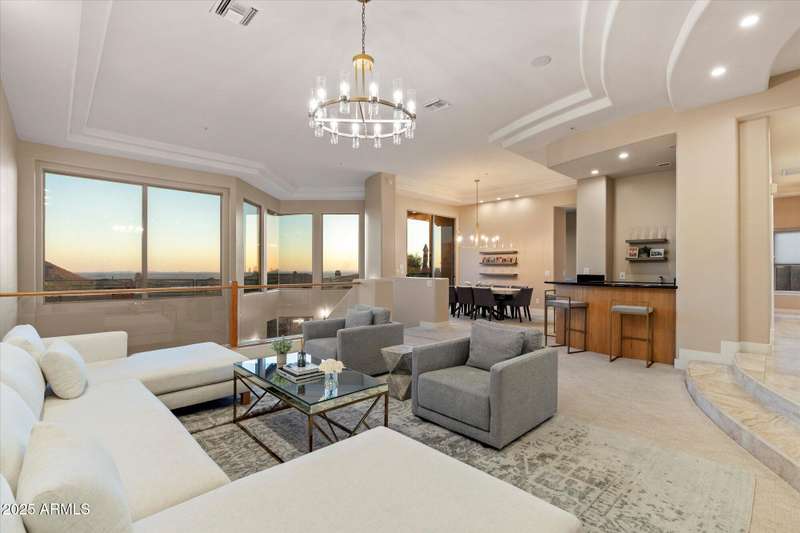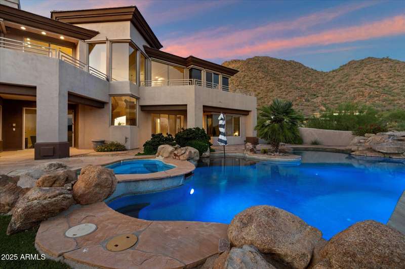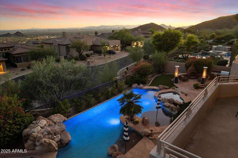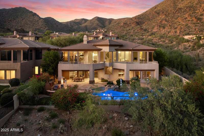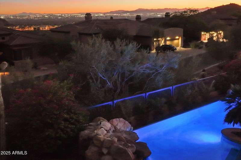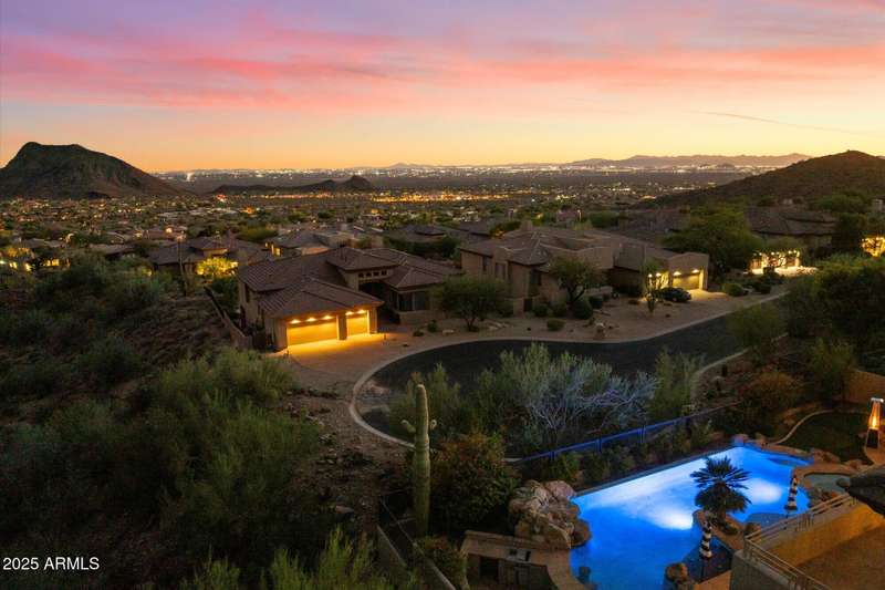 Panoramic city light and mountain views on incredibly private mountainside lot with neighbor only on one side, huge canyon/NAOS on other side. As you enter, there are expansive walls of tinted glass with automated sunscreens that open to viewing decks. Lives like a single level home with kitchen, family room, living and dining room, powder room, bar, office,tinted windows master suite and laundry on entry level. Lower walk out level has 2 bedrooms with ensuite baths, another powder room, game room, media area and second wet bar! Gourmet kitchen with updated range, double ovens and wine cooler. Master suite has its own deck! Entertaining backyard with negative edge pool and spa, swim up bar, BBQ, fireplace and flagstone patios.