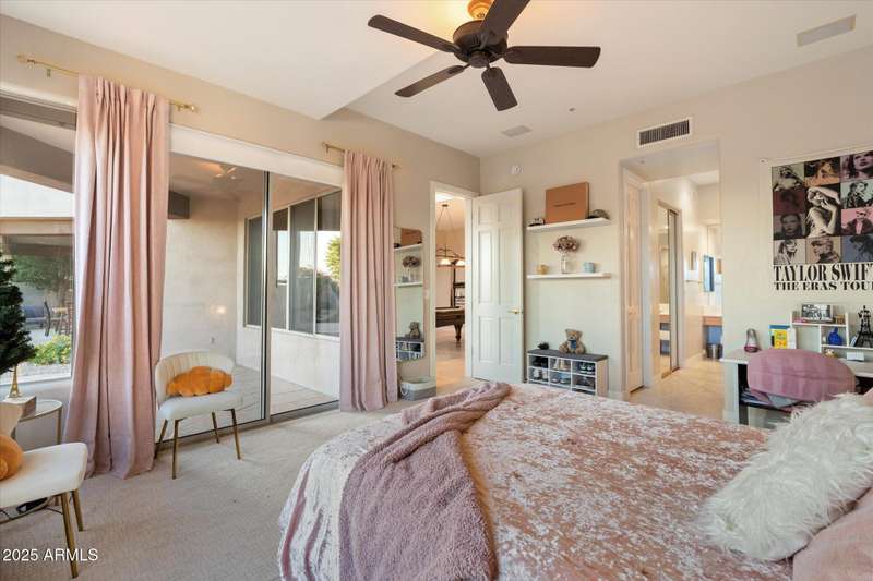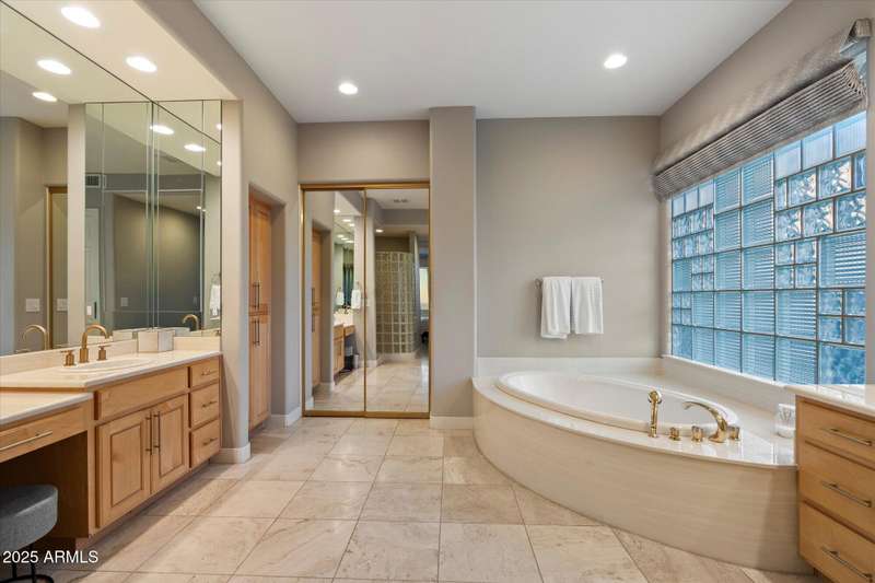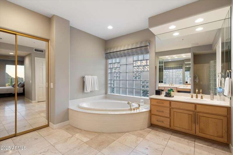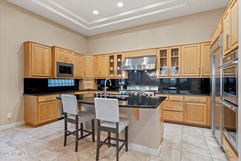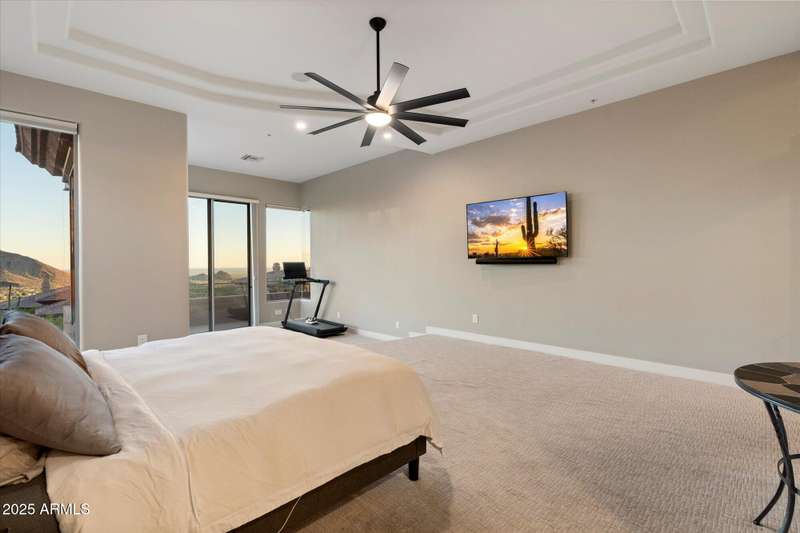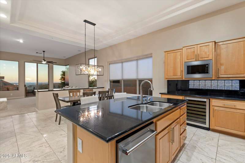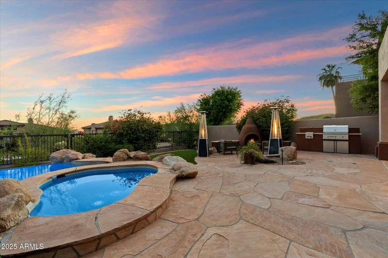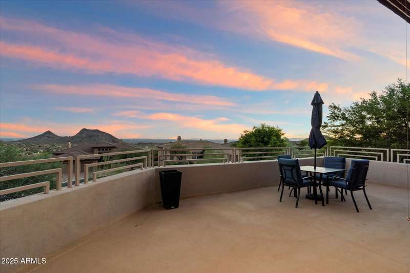 Panoramic city light and mountain views on incredibly private mountainside lot with neighbor only on one side, huge canyon/NAOS on other side. As you enter, there are expansive walls of tinted glass with automated sunscreens that open to viewing decks. Lives like a single level home with kitchen, family room, living and dining room, powder room, bar, office,tinted windows master suite and laundry on entry level. Lower walk out level has 2 bedrooms with ensuite baths, another powder room, game room, media area and second wet bar! Gourmet kitchen with updated range, double ovens and wine cooler. Master suite has its own deck! Entertaining backyard with negative edge pool and spa, swim up bar, BBQ, fireplace and flagstone patios.