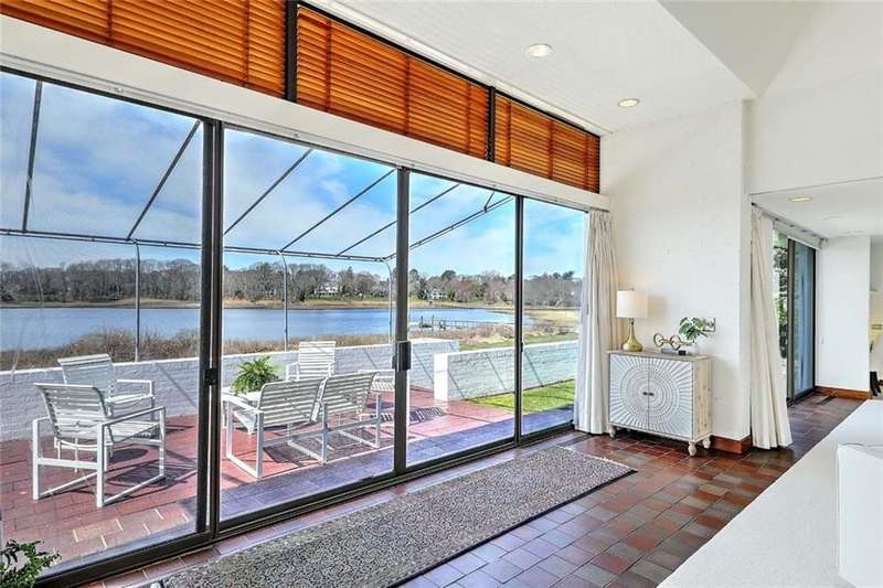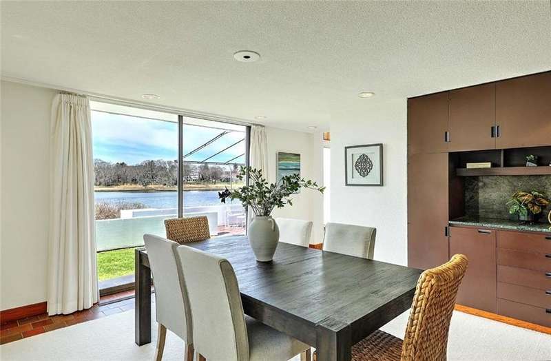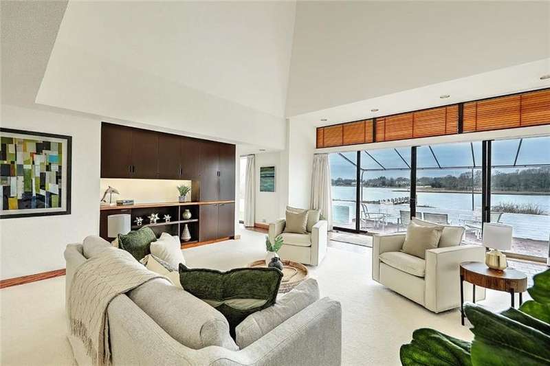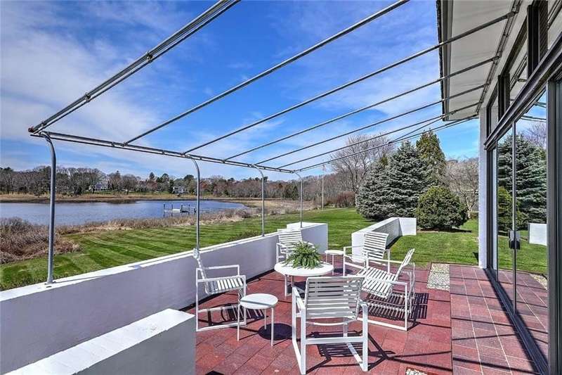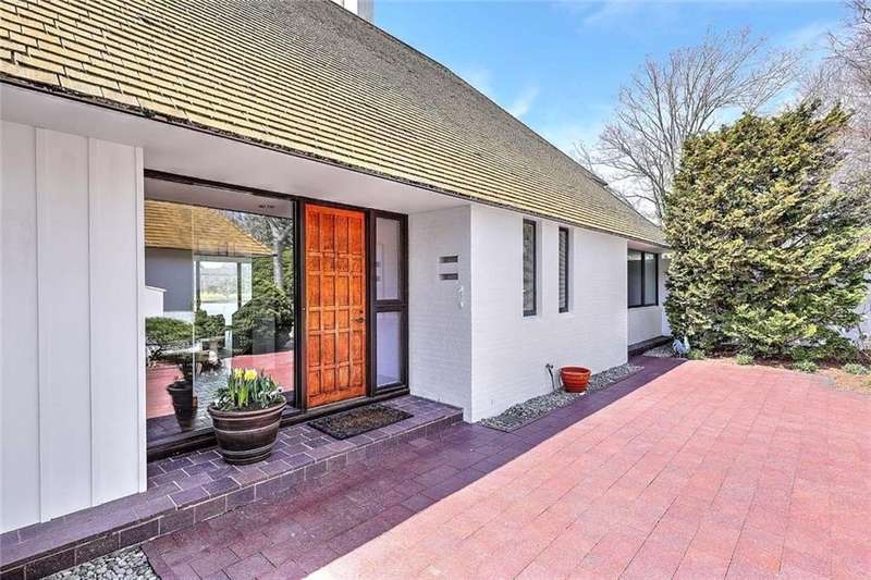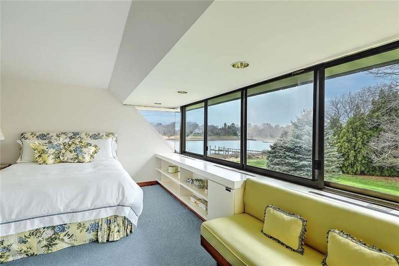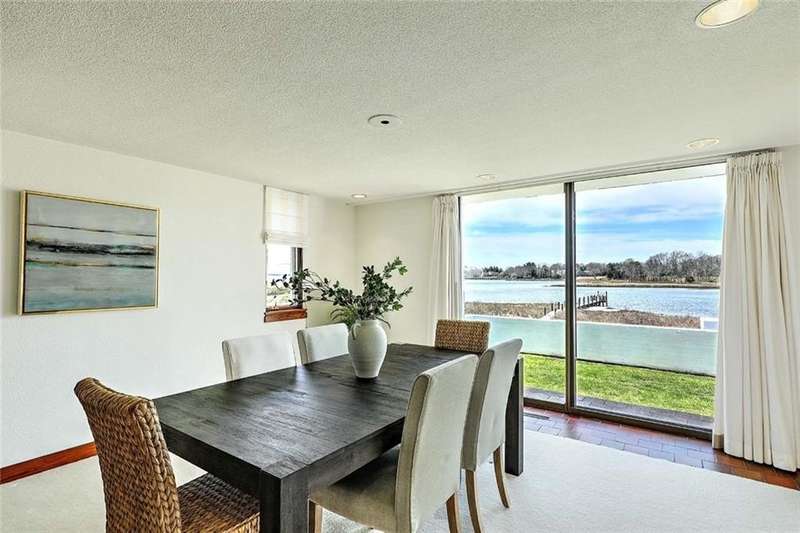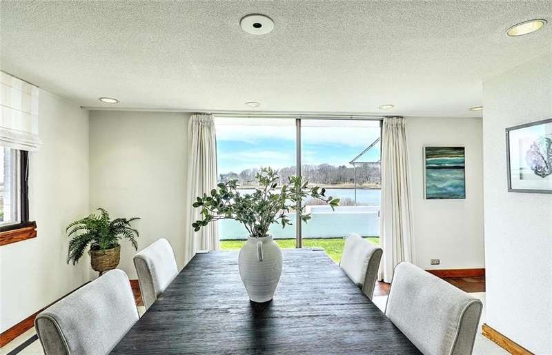 Enjoy living on coveted Adams Point on a private acre-plus lot on Smith's Cove. Well appointed on the serene waterfront setting, this custom-built contemporary home offers stunning westerly views of Narragansett Bay. Designed by renowned architect Rem Huygens, the home is defined by expansive glass walls that flood the interior with natural light. The heart of the property is the grand living room with its soaring cathedral ceilings, a striking fireplace, built-in cabinetry, and double glass sliders leading to a spacious tiled patio. The flow continues seamlessly into a formal dining area and a cozy office or den. The kitchen boasts sleek, modern lines and features a built-in bench dining nook surrounded by windows on three sides offering panoramic views. The home includes three generously sized en-suite bedrooms. The first floor primary suite creates a private retreat with its own glass doors that open to breathtaking views of Smith's Cove. Two bedrooms with private baths are located on the second floor, separated by an open hallway that overlooks the living room below. This property does not require flood insurance.