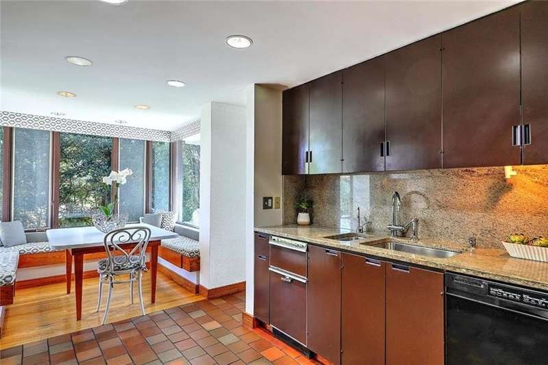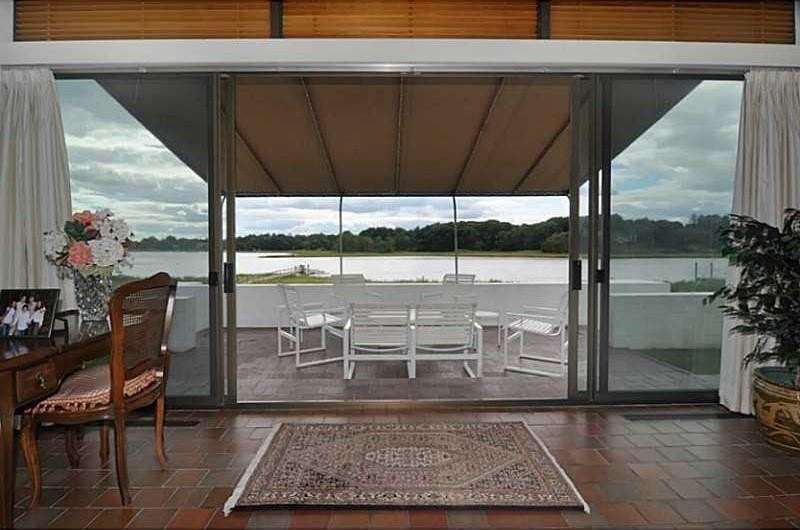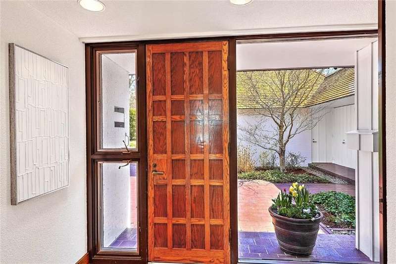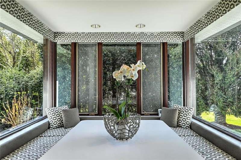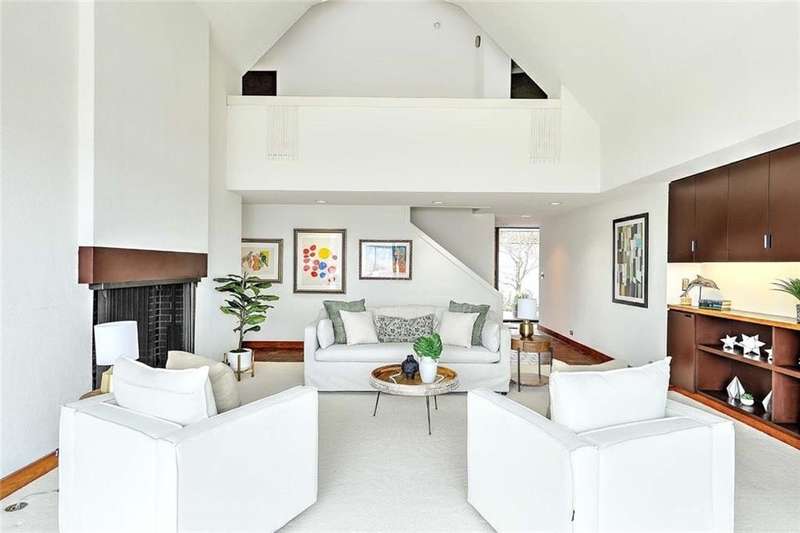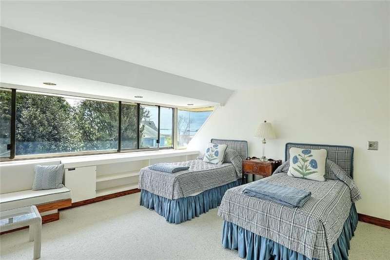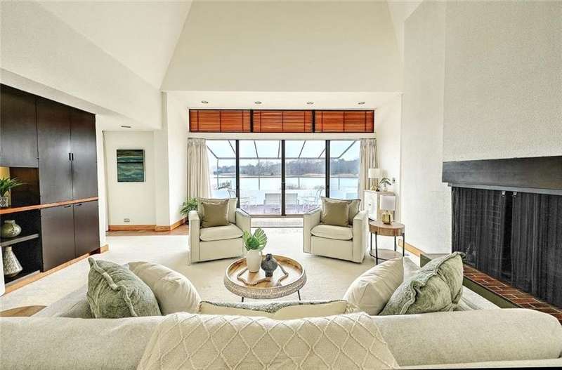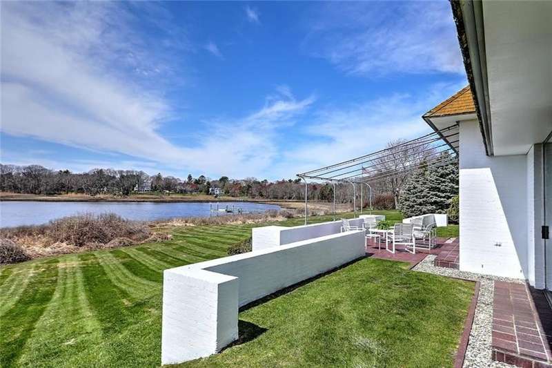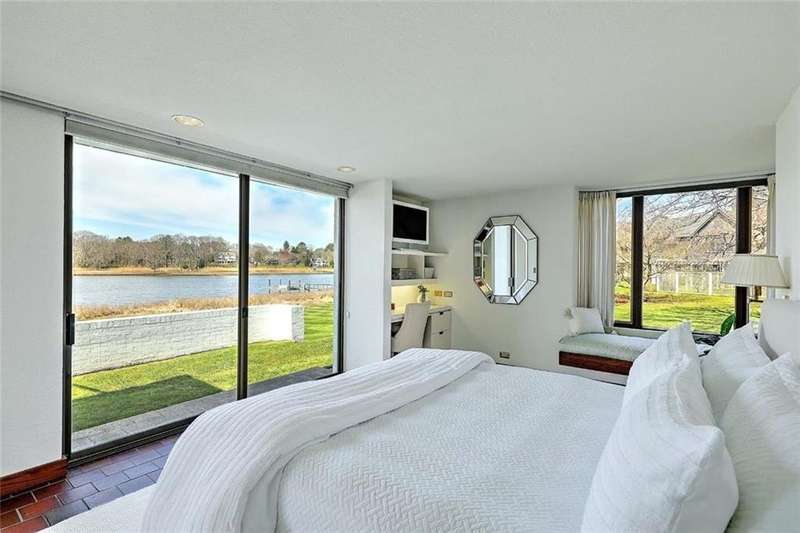 Enjoy living on coveted Adams Point on a private acre-plus lot on Smith's Cove. Well appointed on the serene waterfront setting, this custom-built contemporary home offers stunning westerly views of Narragansett Bay. Designed by renowned architect Rem Huygens, the home is defined by expansive glass walls that flood the interior with natural light. The heart of the property is the grand living room with its soaring cathedral ceilings, a striking fireplace, built-in cabinetry, and double glass sliders leading to a spacious tiled patio. The flow continues seamlessly into a formal dining area and a cozy office or den. The kitchen boasts sleek, modern lines and features a built-in bench dining nook surrounded by windows on three sides offering panoramic views. The home includes three generously sized en-suite bedrooms. The first floor primary suite creates a private retreat with its own glass doors that open to breathtaking views of Smith's Cove. Two bedrooms with private baths are located on the second floor, separated by an open hallway that overlooks the living room below. This property does not require flood insurance.