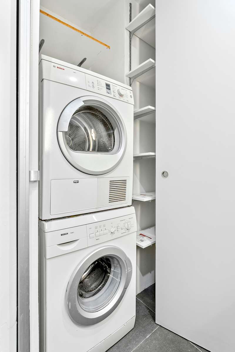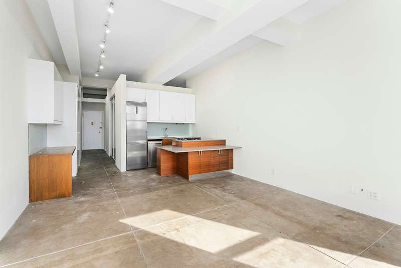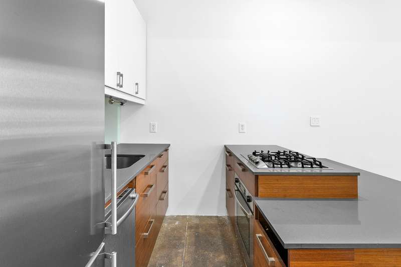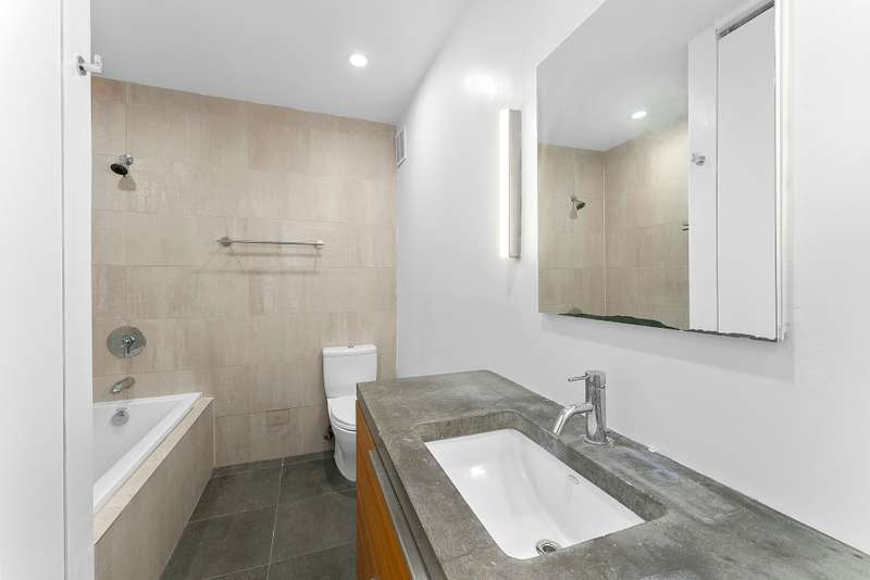 The living area gets excellent natural light with west-facing city and sky views. There is an open-style chef's kitchen with stainless steel appliances and ample counter and cabinetry space. The bedroom area has floor-to-ceiling closets and its own set of sliding doors. The renovated and oversized bathroom has a full-sized washer and dryer, a deep soaking tub, and is conveniently located at the front of the apartment.