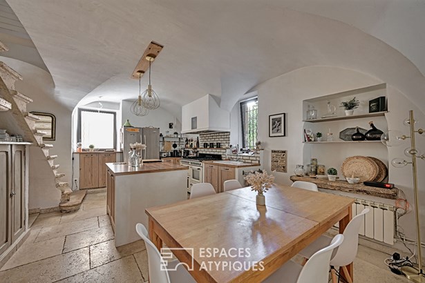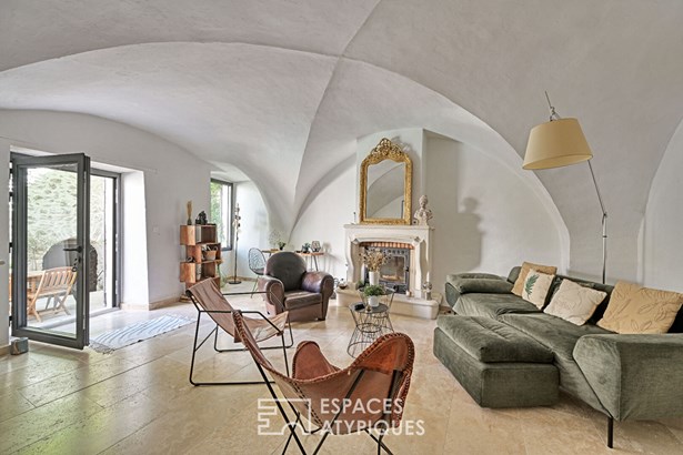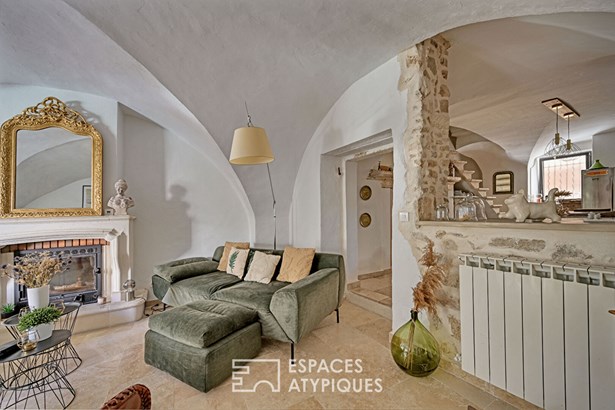 Behind a discreet facade with antique lines hides an elegant 160 sqm property, enhanced by a careful renovation. From the entrance, the tone is set: generous volumes, noble materials, and a family home feel. The living room, warmed by a stone fireplace, invites relaxation in a warm atmosphere.