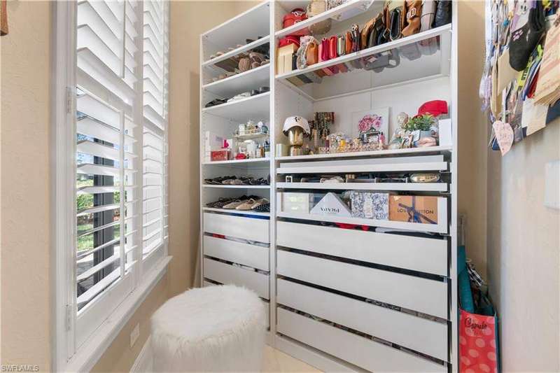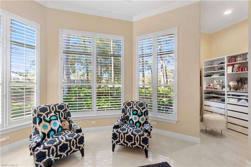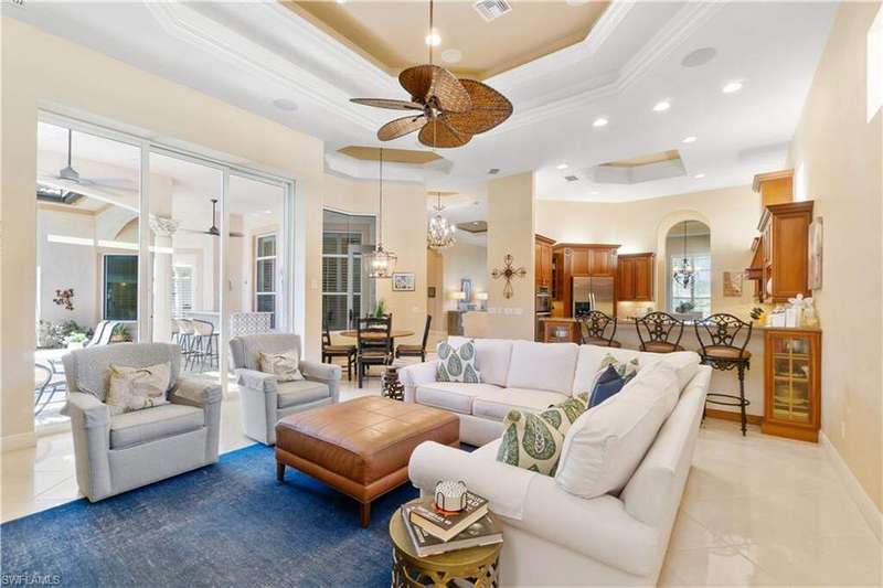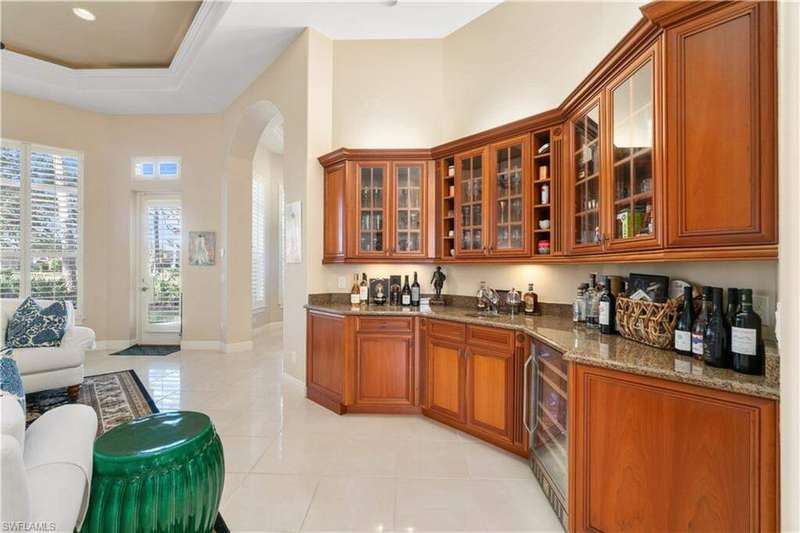 This stunning 2006-built estate, located in North Naples' coveted "Audubon Golf & Country Club", offers breathtaking golf course views. The home spans 3,429 sq ft under air and includes 4 bedrooms, a den, 3.5 baths, a guest cabana, hurricane impact windows/sliders, 3 HVAC units, and a whole-house generator. With desirable Western rear exposure, you can enjoy breathtaking sunsets right from your home, while the Southern exposure ensures perfect sunlight over the pool. The expansive lanai serves as a perfect outdoor retreat with a pool, spa, summer kitchen with a wet bar, grill, and refrigerator, as well as a separate beverage bar with a fridge, sink, and new ice maker (2022)-ideal for both relaxation and entertaining. The outdoor space has been upgraded with a new pool screen (2020), pool pump (2021), landscape lighting, and 3 new lanai fans. A separate back patio offers the perfect vantage point to watch golfers pass by. Inside, you'll find elegant tile flooring throughout, soaring ceilings with custom tray and coffered details, smart home automated lighting, and a full Sonos audio system for both indoor and outdoor enjoyment. The cozy living room features a fireplace and an expansive built-in wet bar, complete with a beverage fridge and ample storage. The chef's kitchen showcases beautiful mahogany cabinetry, granite countertops, and a breakfast bar for casual dining. The spacious primary bedroom offers stunning golf course views, dual walk-in closets, and a spa-like bathroom with dual vanities, a frameless glass walk-in shower, and private access to the lanai. The guest cabana is an entertainer's dream with a private entrance to the lanai, 2 bedrooms, 1 bath, and a second-floor balcony overlooking the pool. Additional features include a well pump (which lowers water bills), 3 internet-controlled thermostats, a built-in safe, a Ring security system with 4 cameras, an epoxy-coated garage floor, and a golf cart with charger. Audubon's prime location is just 5 minutes from Mercato and world-class beaches, and the community offers a gated/guarded entrance, an 18-hole championship golf course, tennis, pickleball, a Bayside boardwalk, and a newly renovated clubhouse with dining and a second beautiful poolside club and cafe.