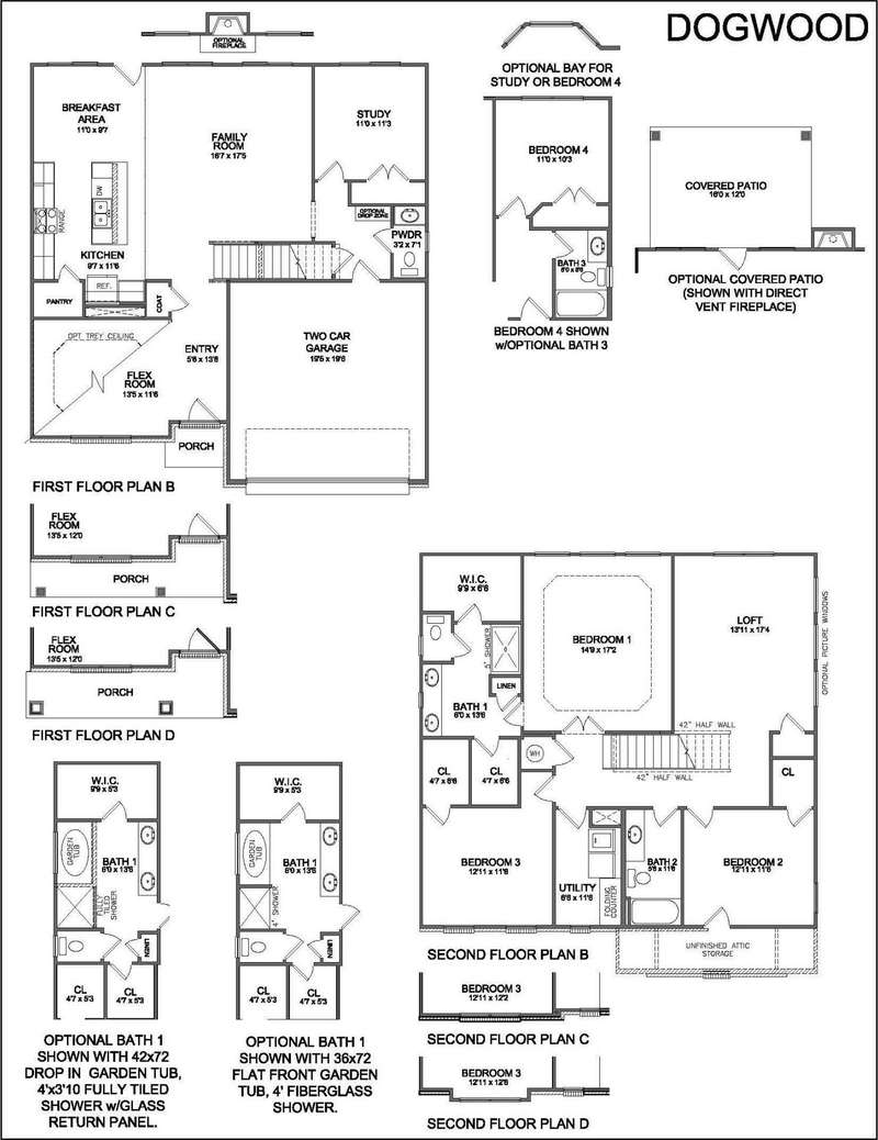 The two-story Dogwood plan offers lots of room to spread out, with a study or optional guest suite on the first floor and a primary bedroom suite plus two bedrooms and loft on the second floor. The flex room off the entry can serve as an office or formal living or dining room, with an option for a trey ceiling. The kitchen includes a step-in pantry and island with counter dining, opening to the large central Family Room. The study can also be configured as a first floor guest suite with full bath, and a bay window is an available option. The hall from the garage offers semi-private access to the study/guest suite area, and an optional drop zone can keep busy families organized. The upstairs primary bedroom includes a trey ceiling and the bath has a double bowl vanity, 5' shower, linen closet, and dual closets. An option for a garden tub or whirlpool and separate shower stall is also offered. Two bedrooms with generously sized closets, a hall bath, a utility room with folding counter, and large loft complete the upstairs. Optional picture windows are available in the loft. This plan includes a walk-in unfinished attic storage area off bedroom #2.