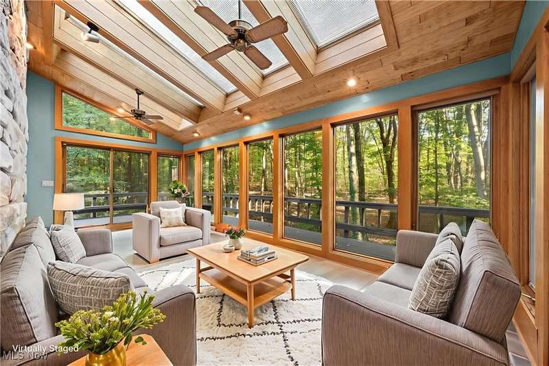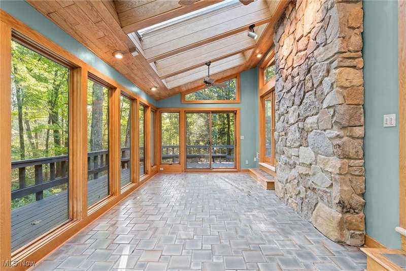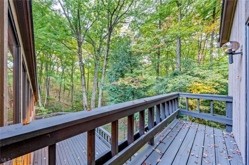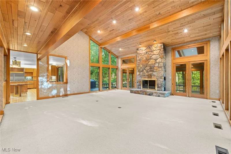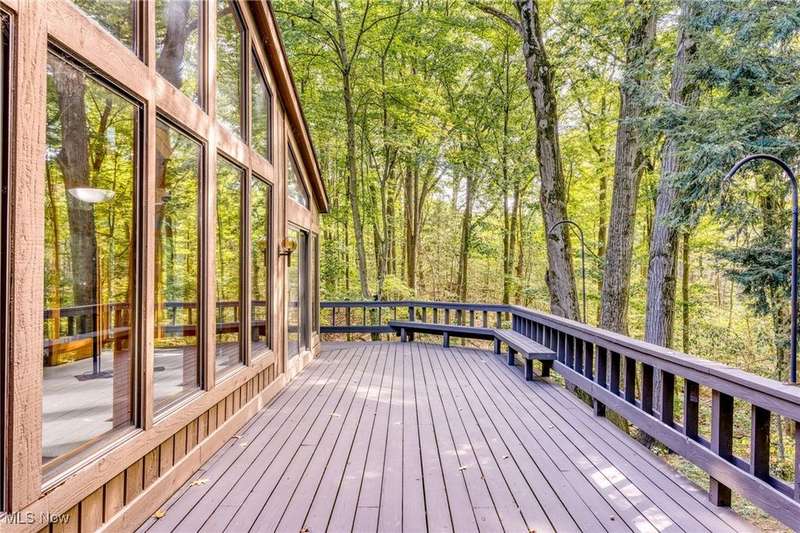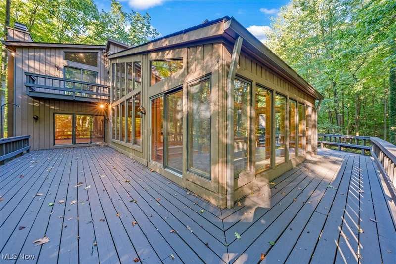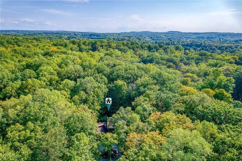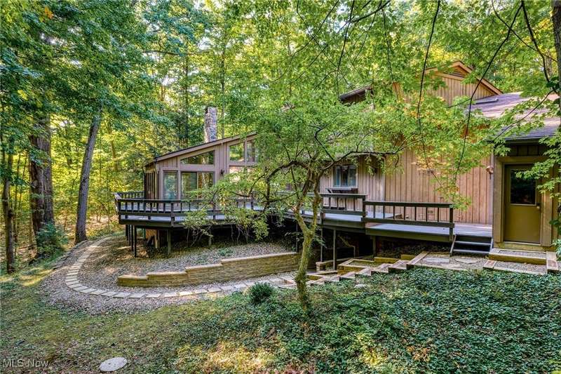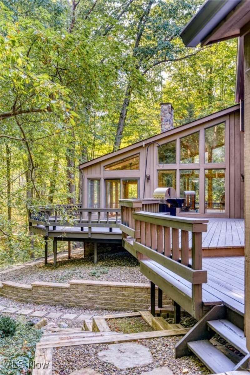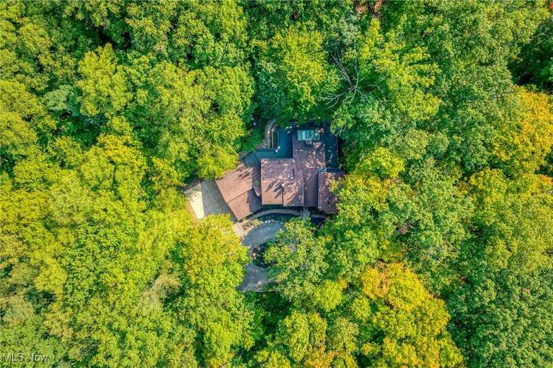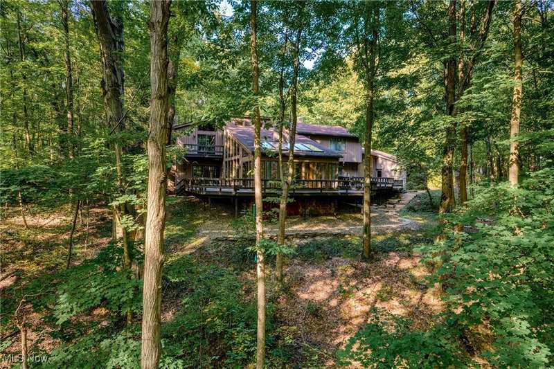 Custom contemporary Kirtland Hills property nestled within 5.2 acres of incredibly private views. The hub of this home is two-story family room surrounded by glass windows, beamed tongue and groove ceilings, and a stone flanked fireplace. A sun-room with wooded views and multiple skylights can be found off the family room. Updated kitchen dual eat-in area, peninsula seating, large island with cooktop, stone counters, and new Sub-Zero/Miele/GE Profile appliances. First floor laundry and mudroom with adjacent powder room creates a convenient traffic pattern off the garage entrance. A private office area on the first floor includes a study with amish constructed built-ins and a full bathroom. A step-down den with a second fireplace completes the first level. The primary suite boasts a privately connected balcony deck. The primary 5 point bath has been fully remodeled (2020) with custom lighting, jetted tub, music system, and high-end tile finishes. 2 nicely sized additional bedrooms and 2 additional full bathrooms complete the second level. Large wrap around deck is any entertainers dream. Private drive with circular guest parking in addition to the 4 car garage. Partially finished basement with workshop and ample storage throughout. New landscaping throughout including natural Riverstone paths and specialty plantings. Whole house generator. Please see listing agent for a full list of extensive upgrades and improvements. A very special and unique property from start to finish.