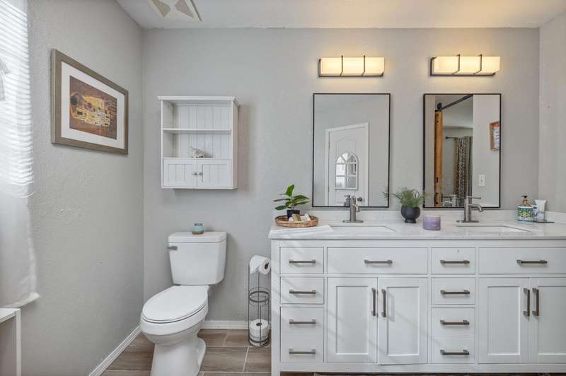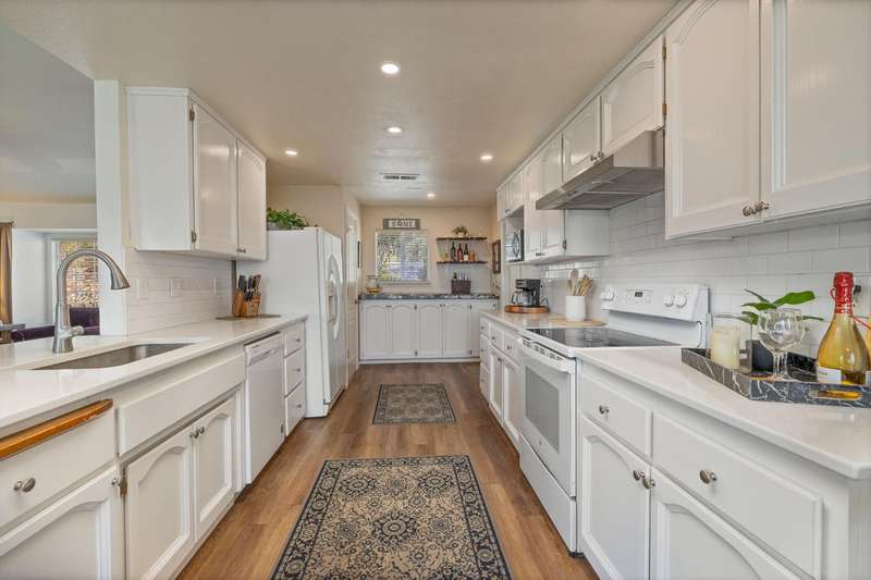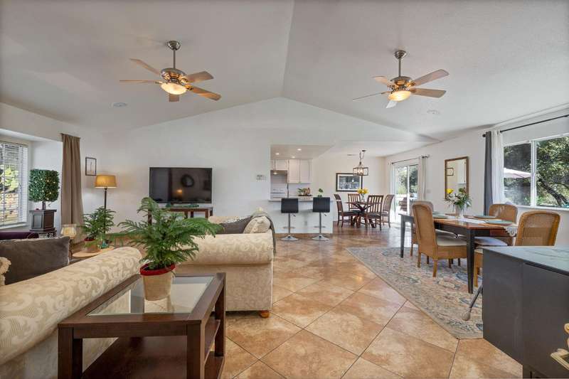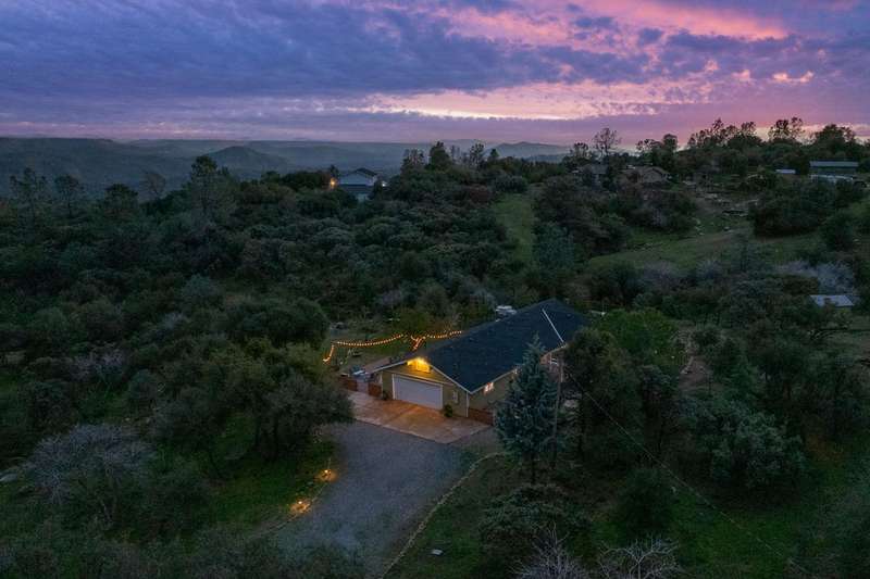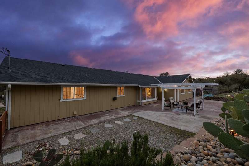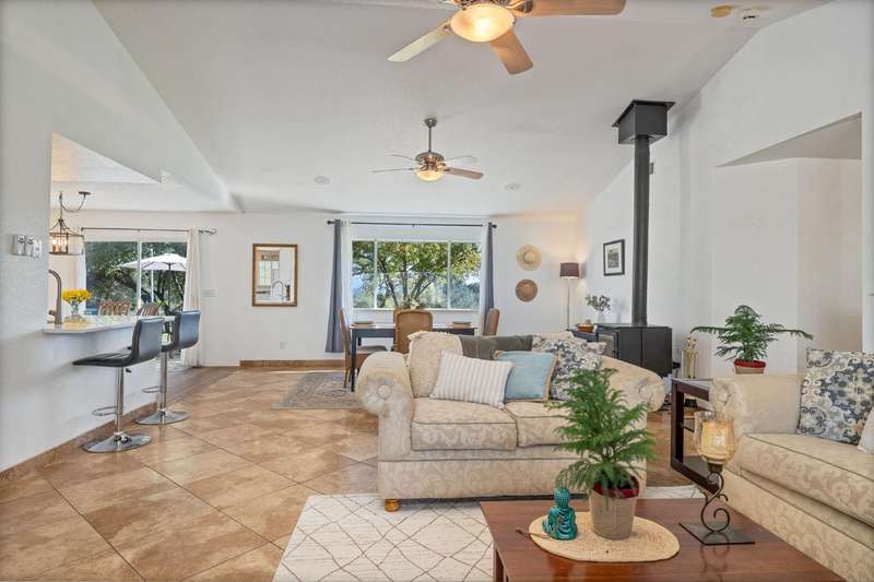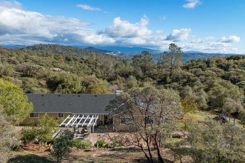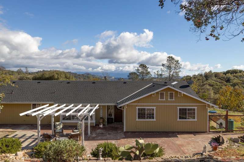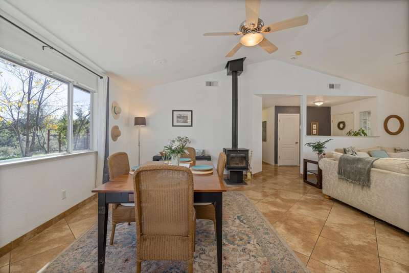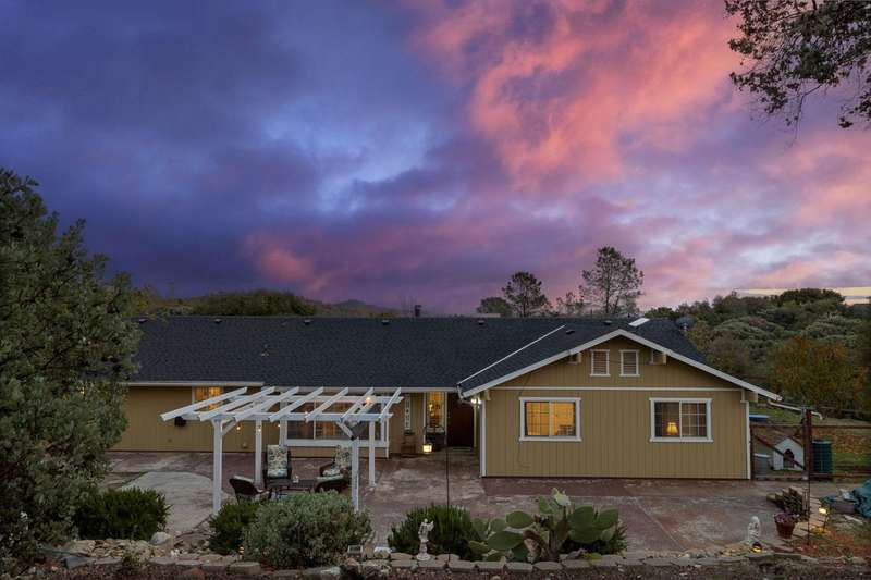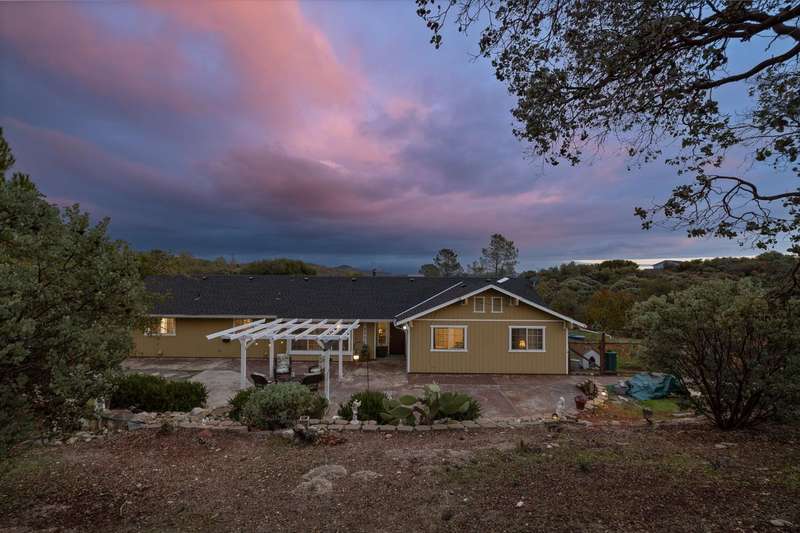 Beautifully updated 3-bedroom, 2-bathroom home on 2.6 acres with stunning VIEWS!Step inside to discover vaulted ceilings, abundant natural light, and a spacious open floor plan. The updated kitchen features a custom bar, sleek QUARTZ COUNTERS, and a large pantry for ample storage, flowing seamlessly into the dining areawhere you can enjoy distant mountain VIEWS from your table. A cozy wood stove adds warmth and charm to the living space.The spacious primary bedroom includes built-in wardrobe cabinetry and leads to a spa-inspired bathroom featuring a large walk-in shower, double vanity with quartz counters, and a walk-in closet. Two additional bedrooms and an updated guest bath provide comfort and convenience for family or visitors.Thoughtfully maintained with modern updatesincluding a NEWER ROOFthis home offers both beauty and long-term peace of mind.The property features an automatic gate and is FULLY FENCED across the entire 2.6 acres, offering both privacy and security. Outside, unwind on the generous back patio ideal for entertaining, or relax beneath the covered pergola at the front of the home, complete with a tranquil WATER FEATURE. Additional features include a fenced area perfect for animals, a workshop space, fruit trees, and a seasonal creek & POND that add a truly bucolic touch to the landscape.Move-in ready, beautifully finished, and perfectly situated on usable acreagethis home has it all!