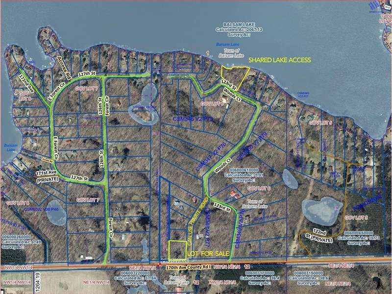 This nicely wooded vacant lot offers the perfect opportunity to build your dream cabin or home with access to the highly desirable Balsam Lake. Not only do you have a peaceful, private lot surrounded by nature, but you'll also enjoy shared lake access on Lot 4, which boasts 283 feet of sandy shoreline—ideal for swimming and enjoying the crystal-clear waters. Imagine relaxing by the water on the Brand new 30-ft aluminum dock and pontoon lift included with the sale! Ready for your immediate water sports enjoyment and space for all your lake toys. Whether you love water skiing, taking your pontoon out for a sunset cruise, or fishing on one of the best full recreational lakes, this property provides it all. For outdoor enthusiasts, the location is unbeatable—you're just minutes from snowmobile and ATV trails for year-round adventure. When you're ready to wind down, head to nearby restaurants, wineries, and local attractions, offering the best in both adventure and relaxation. This is not just a piece of land—it's a lifestyle waiting for you to create. Love where you live!