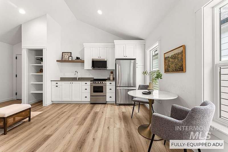 Step into effortless living in Northwest Boise, where modern design meets everyday flexibility in this newly built home by Iron Haven Homes. This property is ideal for those seeking a carefree lifestyle with the added value of an income-producing ADU or private guest suite. The open-concept layout creates a welcoming space for relaxing or entertaining, highlighted by wide-plank wood floors and elevated design elements. The kitchen features a sleek quartz island, custom cabinetry, walk-in pantry, tile backsplash, and stainless steel appliances. The luxe master suite includes a spa-style bath, with dual sinks, tile flooring, and a walk-in closet. A fully registered ADU offers the ultimate versatility for short-term rental, long-term income, workspace, or private quarters for guests. With yard care managed by the HOA, you’re free to lock up and go, whether you’re heading out for travel, a weekend downtown, or time in the Boise foothills. This location places you minutes from schools, parks, trails, & DT Boise. PHOTO SIMILAR