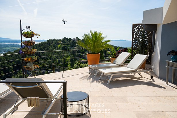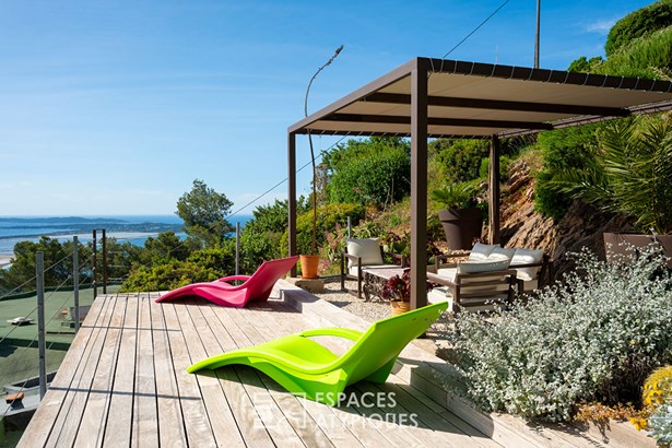 Clinging to the hillside as if suspended between sky and sea, this architect-designed house with immaculate lines, inspired by Greek lines, embraces the Mediterranean in a landscape sculpted by light and stone. A true refuge suspended between sky, rock and sea, it offers a 180° panoramic view as far as Porquerolles, offering a lively spectacle at every moment of the day. On 1500m2, its layout in successive terraces gives way to numerous relaxation areas: swimming pool, landscaped garden, terrace, solarium and rooftop, all in lush vegetation typical of the south. A permanent invitation to live indoors-outdoors, in complete privacy. A swimming pool elegantly integrated into the natural rock invites you to swim facing the horizon. A discreet entrance reveals a first independent volume, currently used as an 18m2 studio with terrace can accommodate family, friends or seasonal tenants, with separate access and a comfortable sleeping area. The 80sqm main house offers an atypical layout spread over different levels: two bedrooms with a mezzanine each, an exotic wood bathroom, and a bright living room with multiple openings, open to the horizon. The fitted kitchen in the extension completes this convivial space with Asian influences. In the upper part, access to a rooftop with an exceptional view offers a unique view of the sea and the surrounding vegetation. Just a few minutes from the beaches, Hyeres town center, and the ports, contemporary lines blend with organic volumes, creating a serene and fluid atmosphere. A building permit has been studied for an additional elevation of approximately 90 sqm, giving this property rare development potential in this highly sought-after area. Privileged access to a confidential beach and two tennis courts nestled in the heart of the condominium complete the assets of this property. An exceptional location for those looking for a unique property at the crossroads of sky, sea, and stone. ENERGY CLASS: D 227 CLIMATE CLASS: B 7 - Estimated average amount of annual energy expenditure for standard use, established using 2021 energy prices: between EUR1,660 and EUR2,290. Information on the risks to which this property is exposed is available on the Georisques website: www.georisques.gouv.fr Muriel CLADE