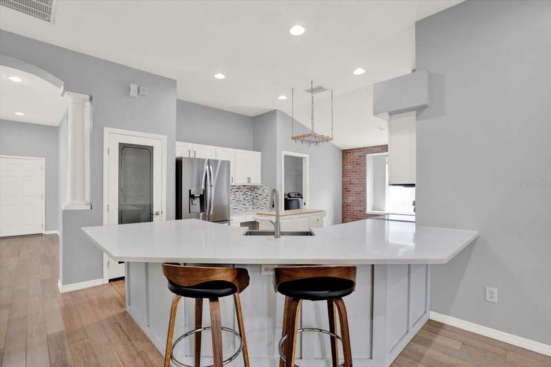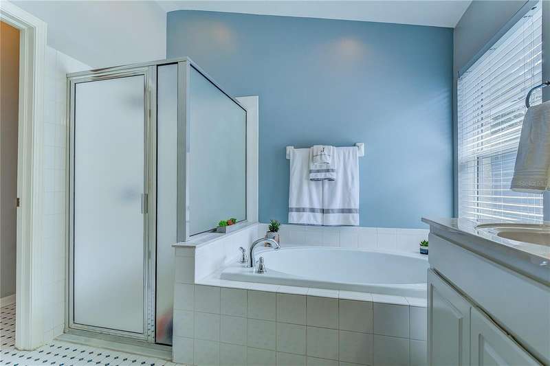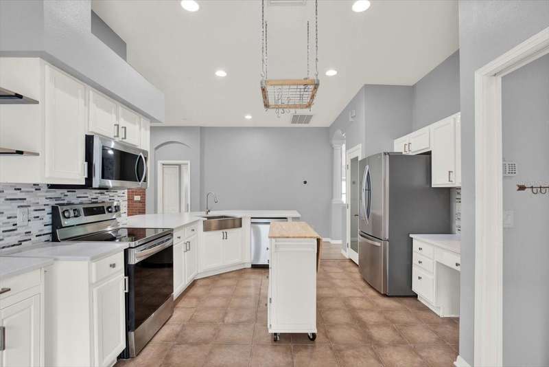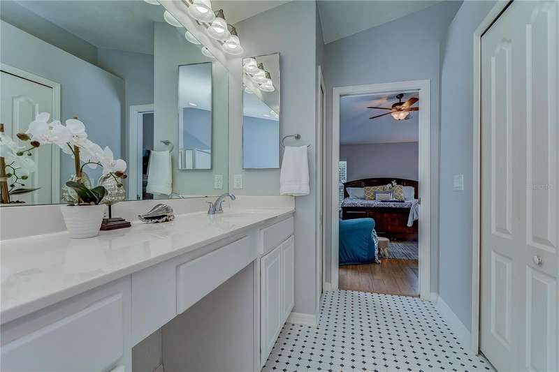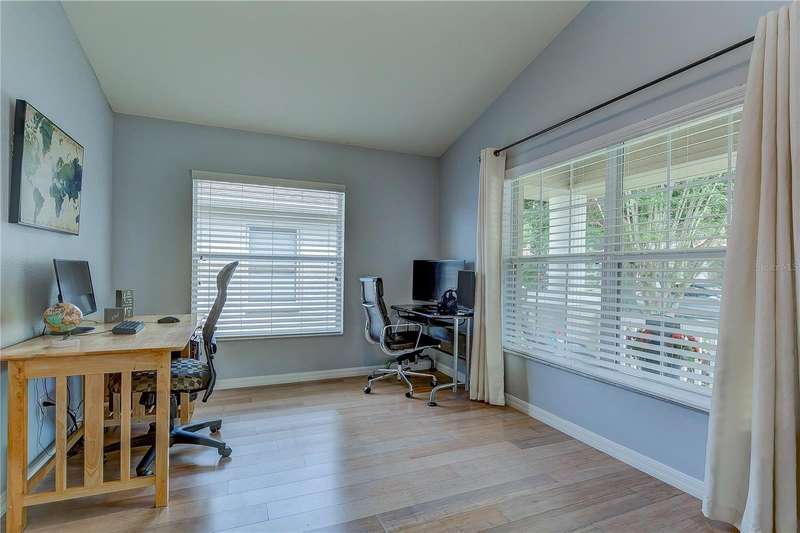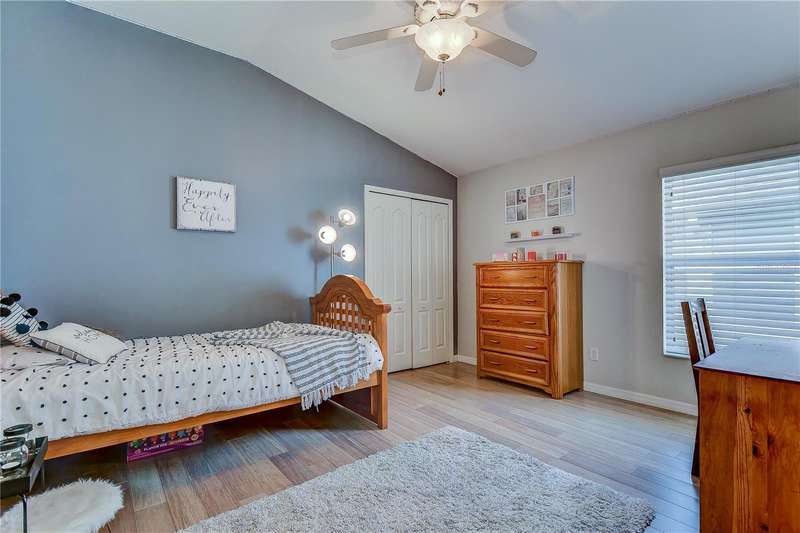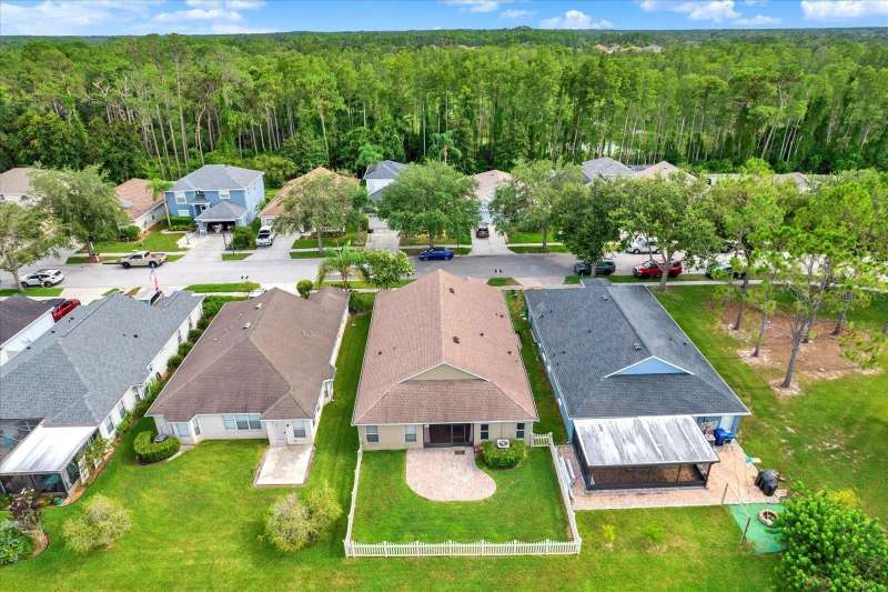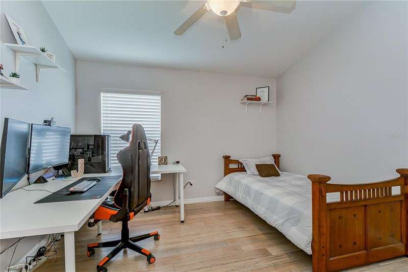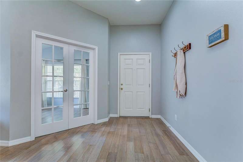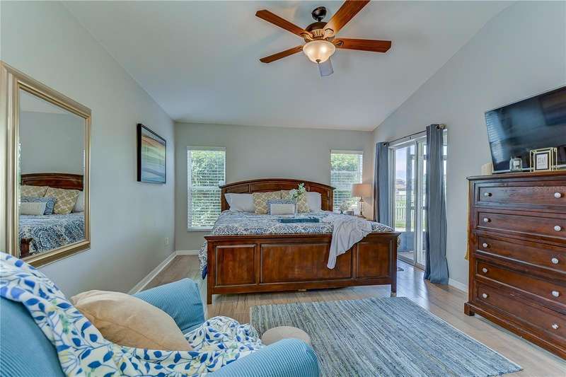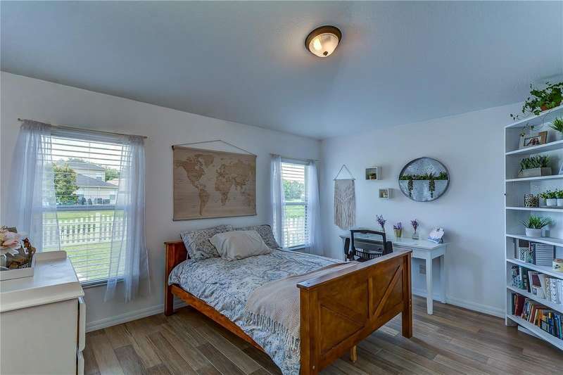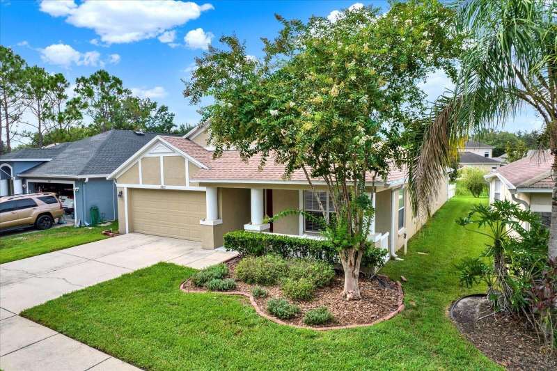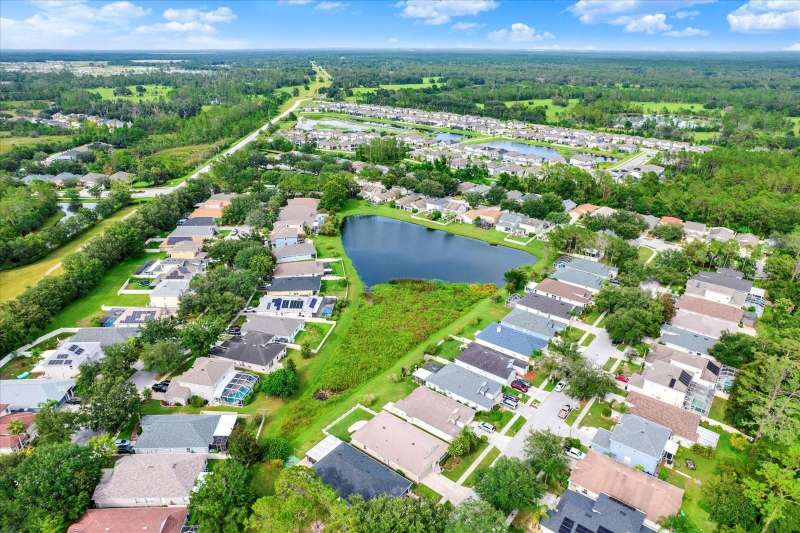 Beautiful 5 Bedroom Single Story Home nestled on a pristine pond front lot on a quiet oak canopy circle in award winning Wilderness Lake Preserve. Recently remodeled and newer roof is just a few years young! A 2100 Sq Ft home with 5 bedrooms that happens to be single story is a very rare opportunity. At the heart of this wonderful home is its spectacular kitchen which features upgraded new stainless-steel appliances, glistening quartz countertops, epic peninsula breakfast bar comfortably seats 7 and bridges into an open concept living room perfect for entertaining or everyday dining, center island, abundant cabinetry window seat and dining nook. A spacious living room with inspirational pond views opens up to a screened and covered lanai. Enchanting curb appeal with a lush landscape and a neighborly covered front porch. Great outdoor living with a large brick paver patio and a fully fenced backyard overlook beautiful pond views. Deluxe “Beachwalk” stranded bamboo engineered plank flooring with “Aquaguard’ throughout the entire home, although in 4 bedrooms carpet is currently laid over the top of the bamboo which could easily be removed to restore the bamboo floors if desired. Whole house water softener. The owners suite is a tranquil oasis with pond views and glass slider access to the lanai, reading nook and includes a full ensuite complete with huge walk-in closet, separate water closet, dual upgraded vanities, garden tub and separate walk-in shower. The fifth bedroom makes a great office with elegant glass paneled French doors, front yard views and room for multiple work stations. The formal living room is a perfect place for joyous gatherings and could also be used as an expansive formal dining room. All of the bedrooms are spacious. The guest bathroom features a new and stylish vanity and a shower-tub combo. New water heater, new air conditioner, new and stylish "Tempered Gray" interior paint and upgraded lighting throughout. The 5th bedroom is currently shown as a home office and it doesn't have a built-in closet, but it could be uses as a 5th bedroom if needed or desired. Regarding the carpeted rooms, photos of both before and after the carpet was installed are included to show what the rooms look like with or without the carpet. Please see the provided virtual 3-D Matterport tour. All of this plus Wilderness Lake Preserve's extensive and impressive amenities including an epic lake front recreation complex stylized after Walt Disney’s “Fort Wilderness”, multiple fishing docks with boats provided, world-class fitness center overlooking lake, lagoon and heated lap pools, outdoor spa, saunas, movie theater, tennis, basketball and sand-volleyball courts, multiple parks and playgrounds, planned events, nature center, party room, business center, wifi and summer camp-like programs. This amazing home is an ultra rare opportunity that will surely inspire multiple offers.