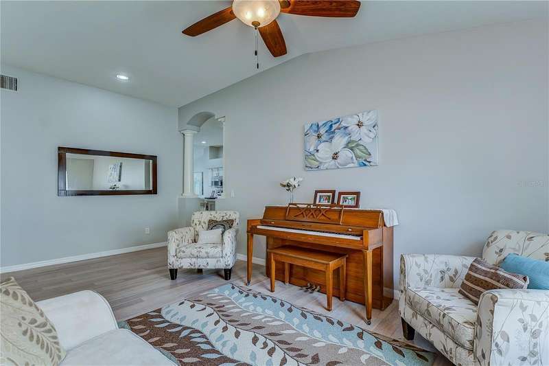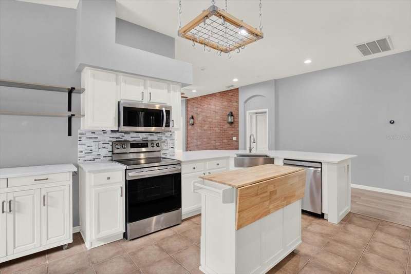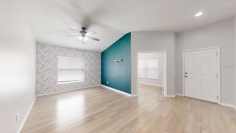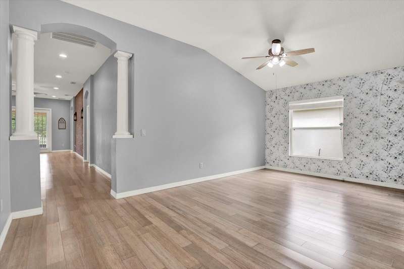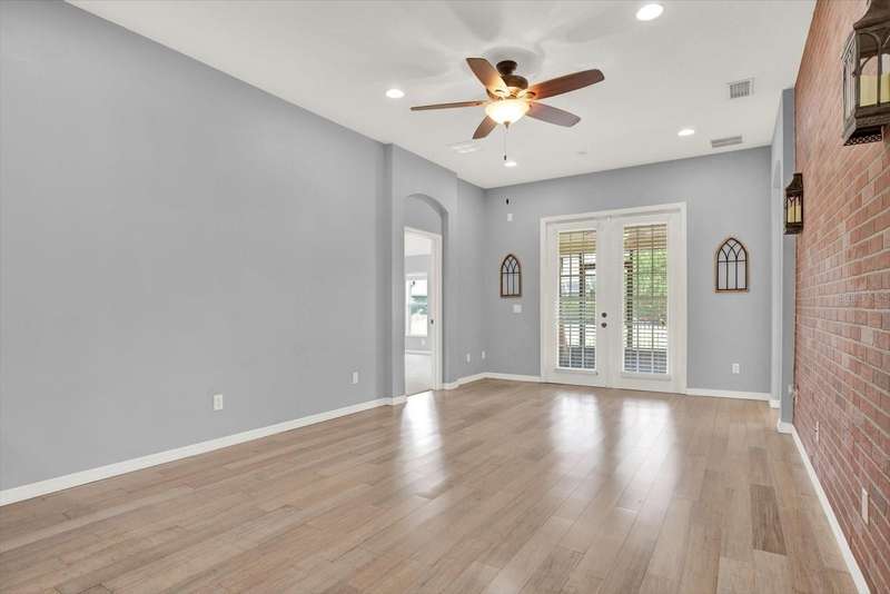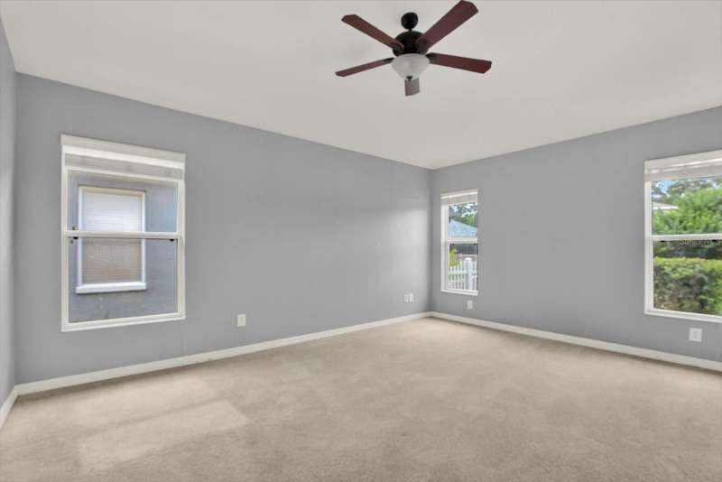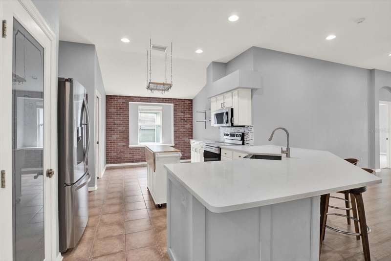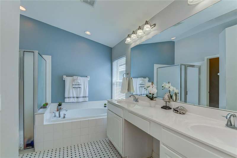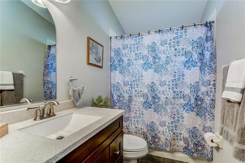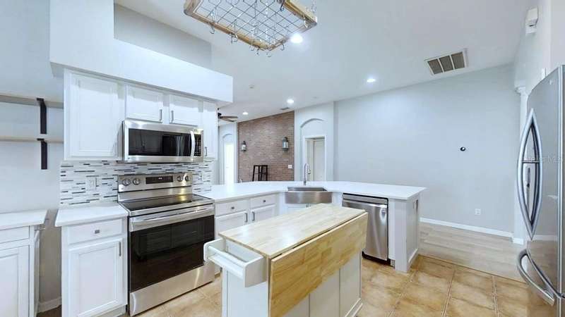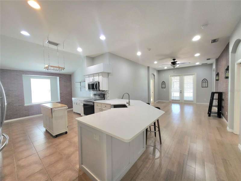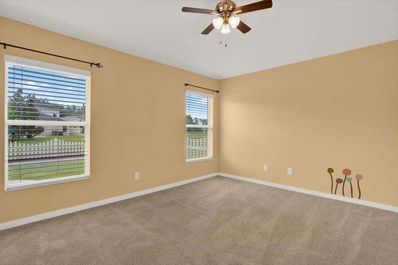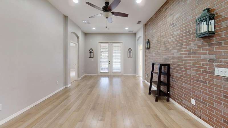 Beautiful 5 Bedroom Single Story Home nestled on a pristine pond front lot on a quiet oak canopy circle in award winning Wilderness Lake Preserve. Recently remodeled and newer roof is just a few years young! A 2100 Sq Ft home with 5 bedrooms that happens to be single story is a very rare opportunity. At the heart of this wonderful home is its spectacular kitchen which features upgraded new stainless-steel appliances, glistening quartz countertops, epic peninsula breakfast bar comfortably seats 7 and bridges into an open concept living room perfect for entertaining or everyday dining, center island, abundant cabinetry window seat and dining nook. A spacious living room with inspirational pond views opens up to a screened and covered lanai. Enchanting curb appeal with a lush landscape and a neighborly covered front porch. Great outdoor living with a large brick paver patio and a fully fenced backyard overlook beautiful pond views. Deluxe “Beachwalk” stranded bamboo engineered plank flooring with “Aquaguard’ throughout the entire home, although in 4 bedrooms carpet is currently laid over the top of the bamboo which could easily be removed to restore the bamboo floors if desired. Whole house water softener. The owners suite is a tranquil oasis with pond views and glass slider access to the lanai, reading nook and includes a full ensuite complete with huge walk-in closet, separate water closet, dual upgraded vanities, garden tub and separate walk-in shower. The fifth bedroom makes a great office with elegant glass paneled French doors, front yard views and room for multiple work stations. The formal living room is a perfect place for joyous gatherings and could also be used as an expansive formal dining room. All of the bedrooms are spacious. The guest bathroom features a new and stylish vanity and a shower-tub combo. New water heater, new air conditioner, new and stylish "Tempered Gray" interior paint and upgraded lighting throughout. The 5th bedroom is currently shown as a home office and it doesn't have a built-in closet, but it could be uses as a 5th bedroom if needed or desired. Regarding the carpeted rooms, photos of both before and after the carpet was installed are included to show what the rooms look like with or without the carpet. Please see the provided virtual 3-D Matterport tour. All of this plus Wilderness Lake Preserve's extensive and impressive amenities including an epic lake front recreation complex stylized after Walt Disney’s “Fort Wilderness”, multiple fishing docks with boats provided, world-class fitness center overlooking lake, lagoon and heated lap pools, outdoor spa, saunas, movie theater, tennis, basketball and sand-volleyball courts, multiple parks and playgrounds, planned events, nature center, party room, business center, wifi and summer camp-like programs. This amazing home is an ultra rare opportunity that will surely inspire multiple offers.