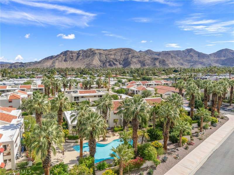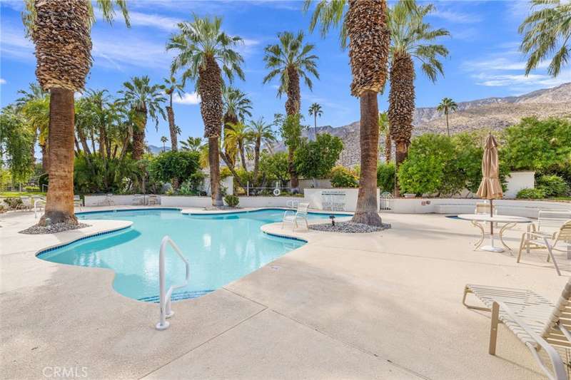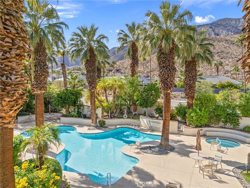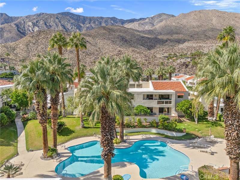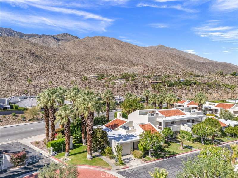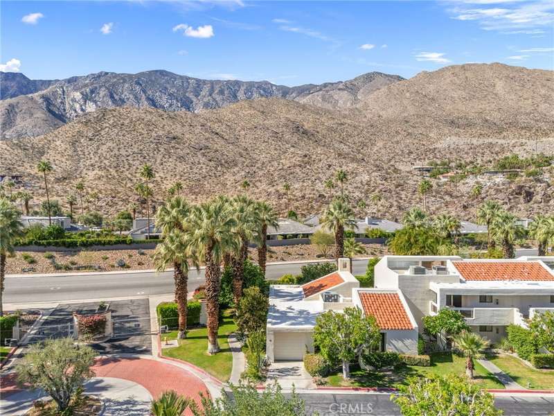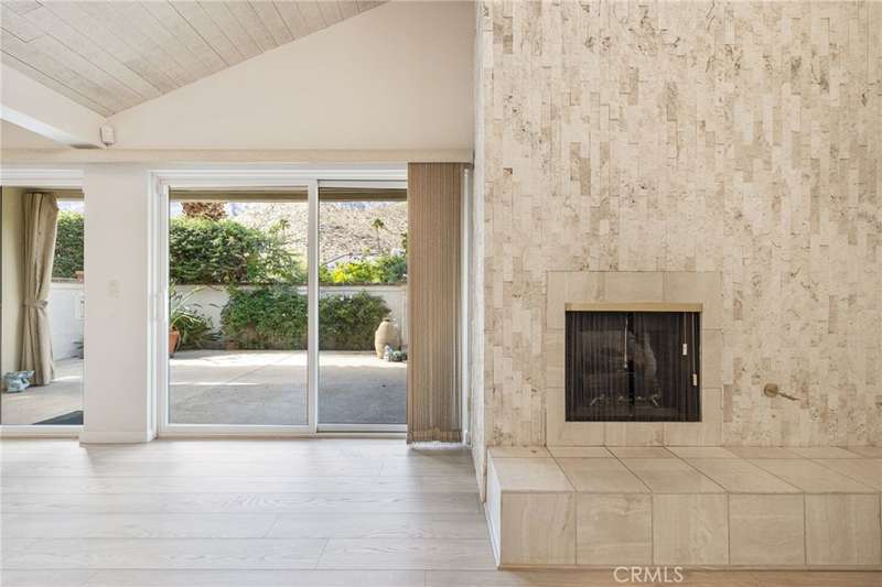 Discover this exceptional mid-century modern condo that offers the privacy and spacious feel of a single-family home. Situated in a gated community, this charming West-facing, end-unit, single-story home features brand new luxury vinyl floors, fresh paint throughout, and numerous upgrades including shutters, fridge, microwave, washer, dryer, and a brand-new water heater. In addition, there is no land lease providing long term value! The spacious living and dining areas feature stunning vaulted tongue-and-groove wood ceilings and a beautiful split marble fireplace, creating a light and airy ambiance complemented by breathtaking views of the San Jacinto Mountains. Step outside to the custom built front lanai; perfect for morning coffee surrounded by mature landscaped grounds. This home also offers custom shelving in the closets and garage, providing smart storage solutions. The back patio shares a yard with the neighboring unit and offers a private entrance to one of the pools. Resort-style amenities include two, tennis courts (one striped for pickleball!), pools and spas. Only one of several units to offer a convenient, attached one-car garage with direct access. Walk to downtown Palm Springs and enjoy the varied museums, unique shops, and incredible restaurants. Experience the perfect blend of classic mid-century design and elevated modern comfort in this beautifully maintained home. Don't miss out on this chance to make it yours!
