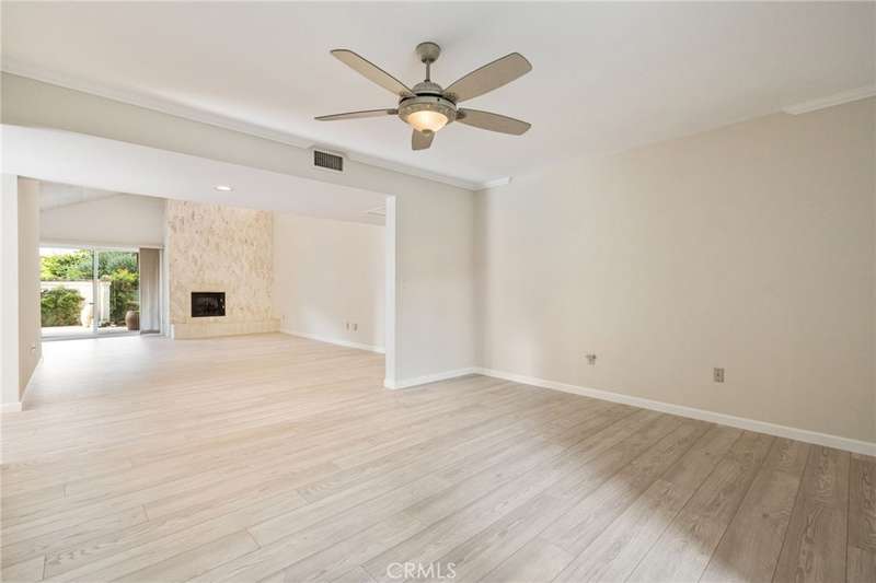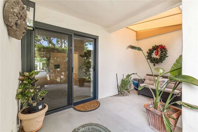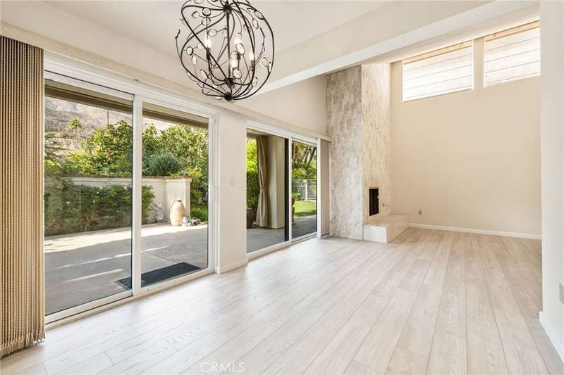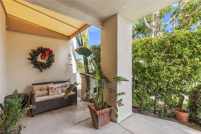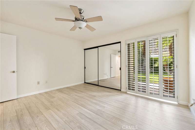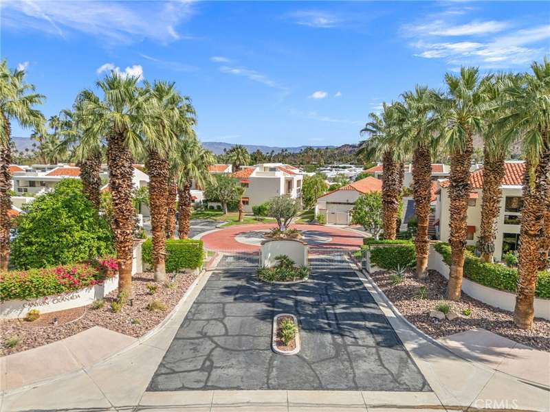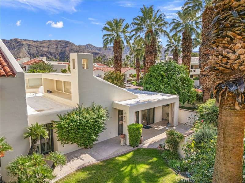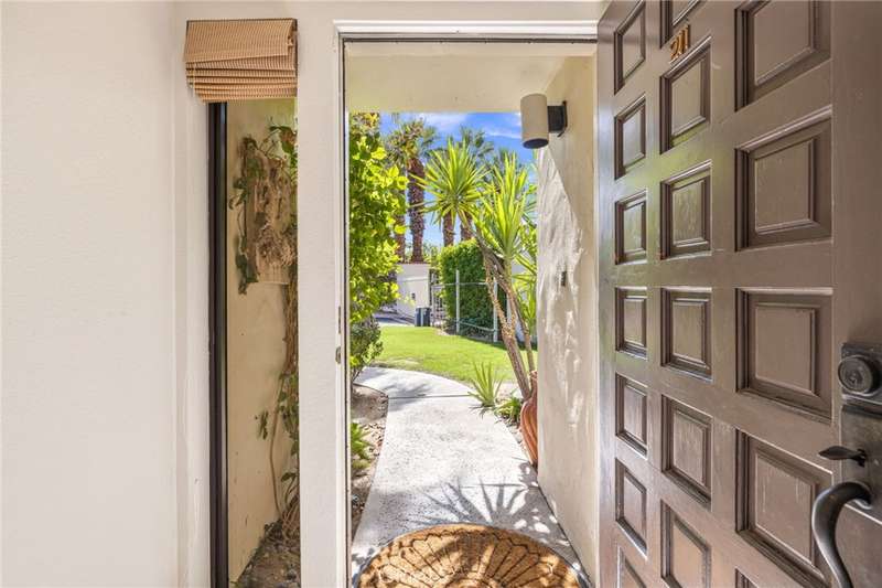 Discover this exceptional mid-century modern condo that offers the privacy and spacious feel of a single-family home. Situated in a gated community, this charming West-facing, end-unit, single-story home features brand new luxury vinyl floors, fresh paint throughout, and numerous upgrades including shutters, fridge, microwave, washer, dryer, and a brand-new water heater. In addition, there is no land lease providing long term value! The spacious living and dining areas feature stunning vaulted tongue-and-groove wood ceilings and a beautiful split marble fireplace, creating a light and airy ambiance complemented by breathtaking views of the San Jacinto Mountains. Step outside to the custom built front lanai; perfect for morning coffee surrounded by mature landscaped grounds. This home also offers custom shelving in the closets and garage, providing smart storage solutions. The back patio shares a yard with the neighboring unit and offers a private entrance to one of the pools. Resort-style amenities include two, tennis courts (one striped for pickleball!), pools and spas. Only one of several units to offer a convenient, attached one-car garage with direct access. Walk to downtown Palm Springs and enjoy the varied museums, unique shops, and incredible restaurants. Experience the perfect blend of classic mid-century design and elevated modern comfort in this beautifully maintained home. Don't miss out on this chance to make it yours!