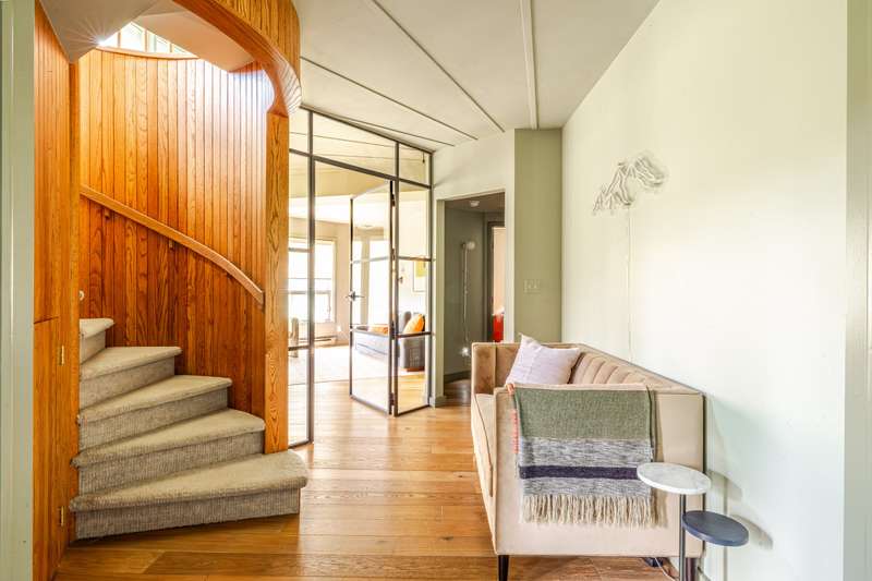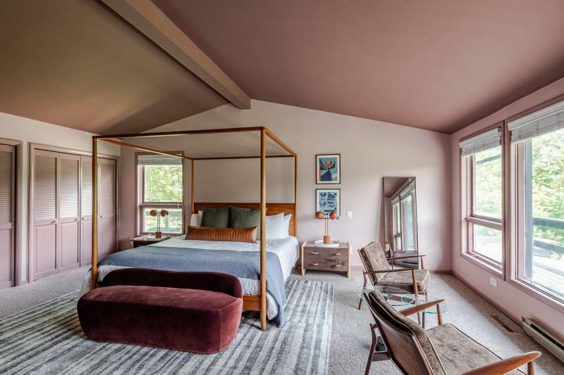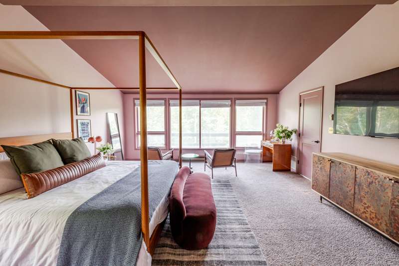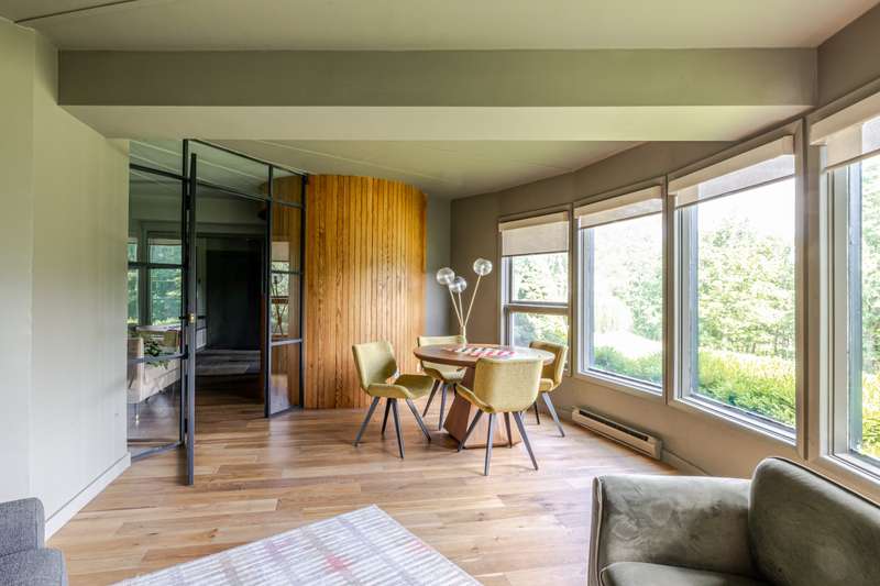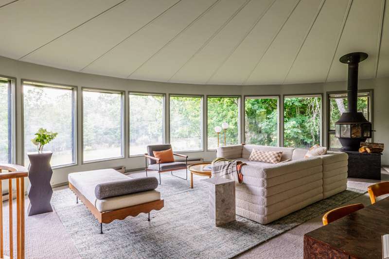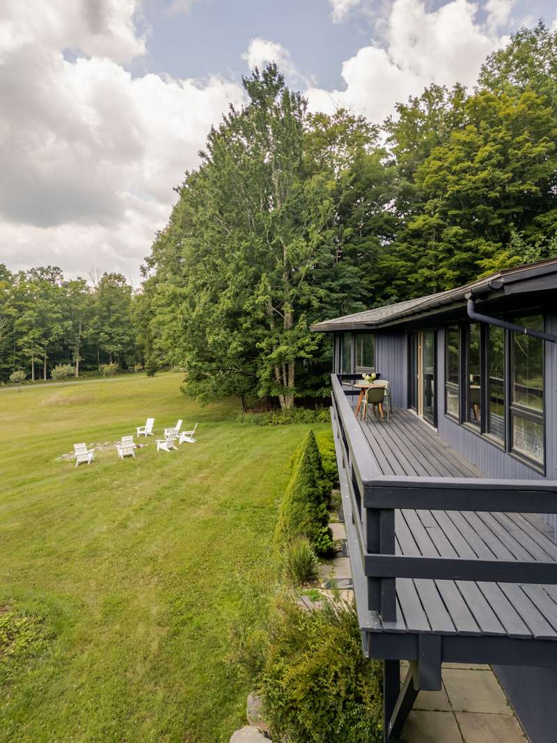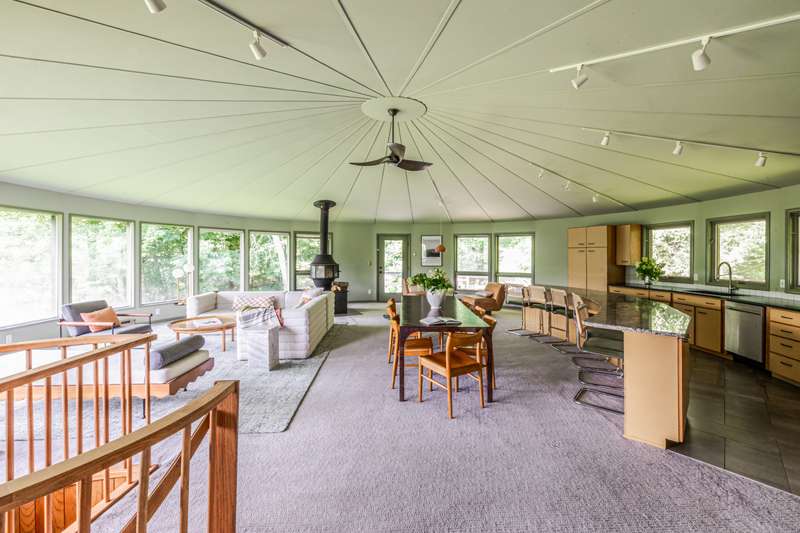 Welcome to Round Haus Chalet, a high design retro retreat set on five acres with spectacular 360-degree views, just minutes from Windham Mountain. Built in 1986, this distinctive three-bedroom, two-and-a-half-bath residence pairs playful, postmodern geometrical architecture with mid-century design. From cozy aprs-ski gatherings, to chic summer soires, this home was designed for every season of entertaining. It's just a five minute drive to the slopes, and with its established short-term rental success, it offers the option of generating income when you're away.At the heart of the home is the dramatic circular great room, where a vaulted ceiling and wall of windows frame treetop views that shift with the seasons. A vintage wood-burning fireplace adds warmth and character, while a wide spiral staircase anchors the space. The adjacent primary suite opens directly to the wraparound deck and includes a spacious bath with soaking tub overlooking the lush landscape. Two additional bedrooms and a versatile lounge or game room with floor-to ceiling windows provide plenty of space for hosting guests, with central air ensuring year-round comfort.The expansive acreage is ideal for lawn games, fireside evenings, or quiet moments surrounded by nature, and an attached two-car garage offers convenience and flexible use. With its combination of mid-century design, vacation rental potential, and Catskills ski-town location-just 2 miles to the village and the Windham Mountain Club-Round Haus Chalet is a unique investment property, weekend escape, or full-time residence. Available fully furnished for an easy, move-in ready transition.