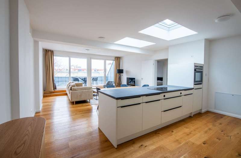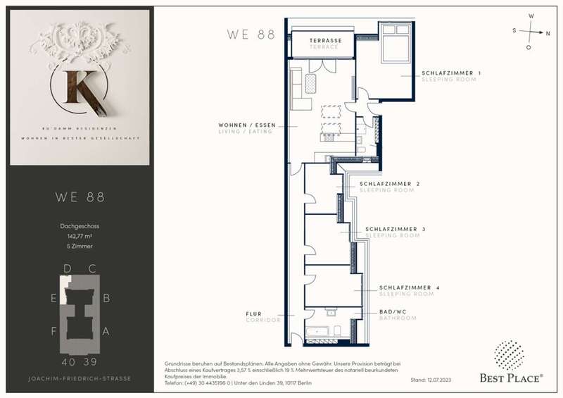 Penthouse in first occupancy in a premium location: In our Ku’damm Residences project, spacious penthouses with unobstructed views, spacious floor plans and fantastic roof terraces were built on a historic old building from the Wilhelminian era. Each penthouse has at least three rooms, has a main entrance and a second entrance/exit as well as a light-flooded ambience. The penthouse unit offered here is the WE88 with approx. 142.77 square meters of living space and a roof terrace with a view of the radio tower. Further details can be found under the equipment section. The floor plan also gives you a good impression of this special penthouse. We look forward to your inquiry and the first viewing together!