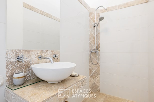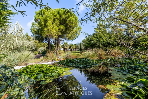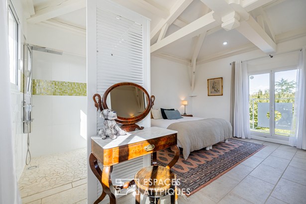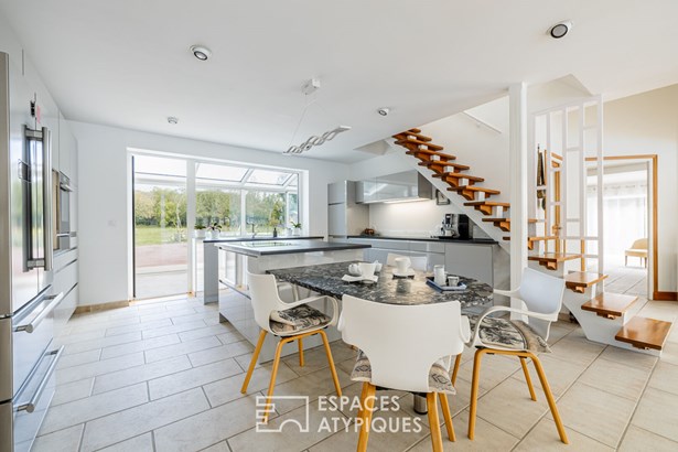 Three steps higher, the kitchen, custom-made with a central island is completed by a veranda converted into a back kitchen-laundry room facing a vegetable garden and a 2,500 sqm orchard completing the 360 ° view. This space constitutes a friendly workshop for the mistress of the house, where family and friendly receptions are easily organized in all seasons. An exceptional living environment designed to enhance every moment.