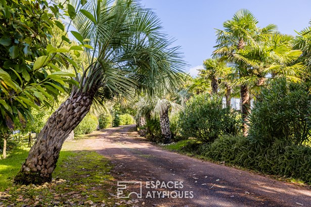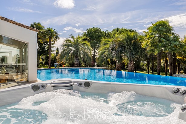 The palm grove brings a touch of exoticism and serenity to the whole, making this place an ideal haven of peace to recharge your batteries. This green oasis lends itself to moments of relaxation with its swimming pool and jacuzzi surrounded by majestic palm trees, as well as various shaded terraces, perfect for summer evenings outdoors.