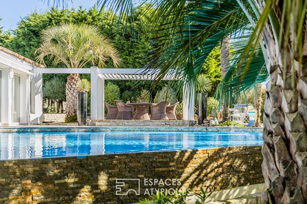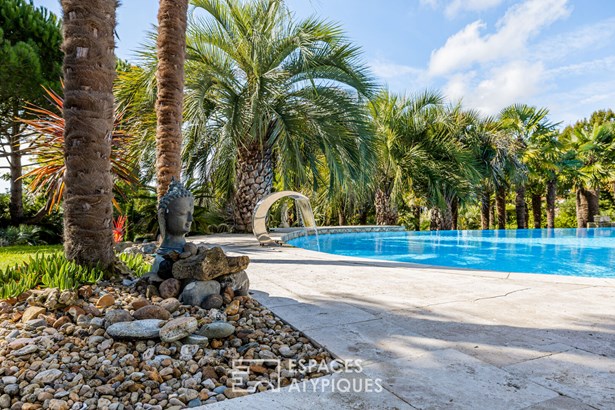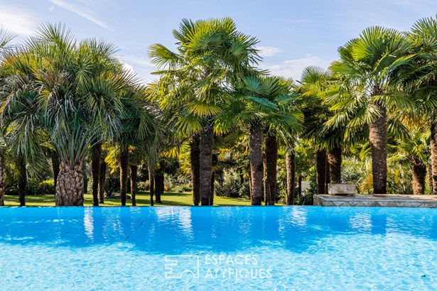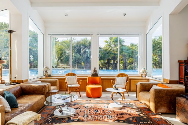 The plunging view of the park, a real palm grove, offers a unique perspective on this green setting. The semi-buried living room, perfectly aligned with the waterline of a 20x8m infinity pool, opens to the outside thanks to XXL bay windows, allowing abundant light. The high ceilings, combined with a south-facing exposure, bathe the space in exceptional clarity.